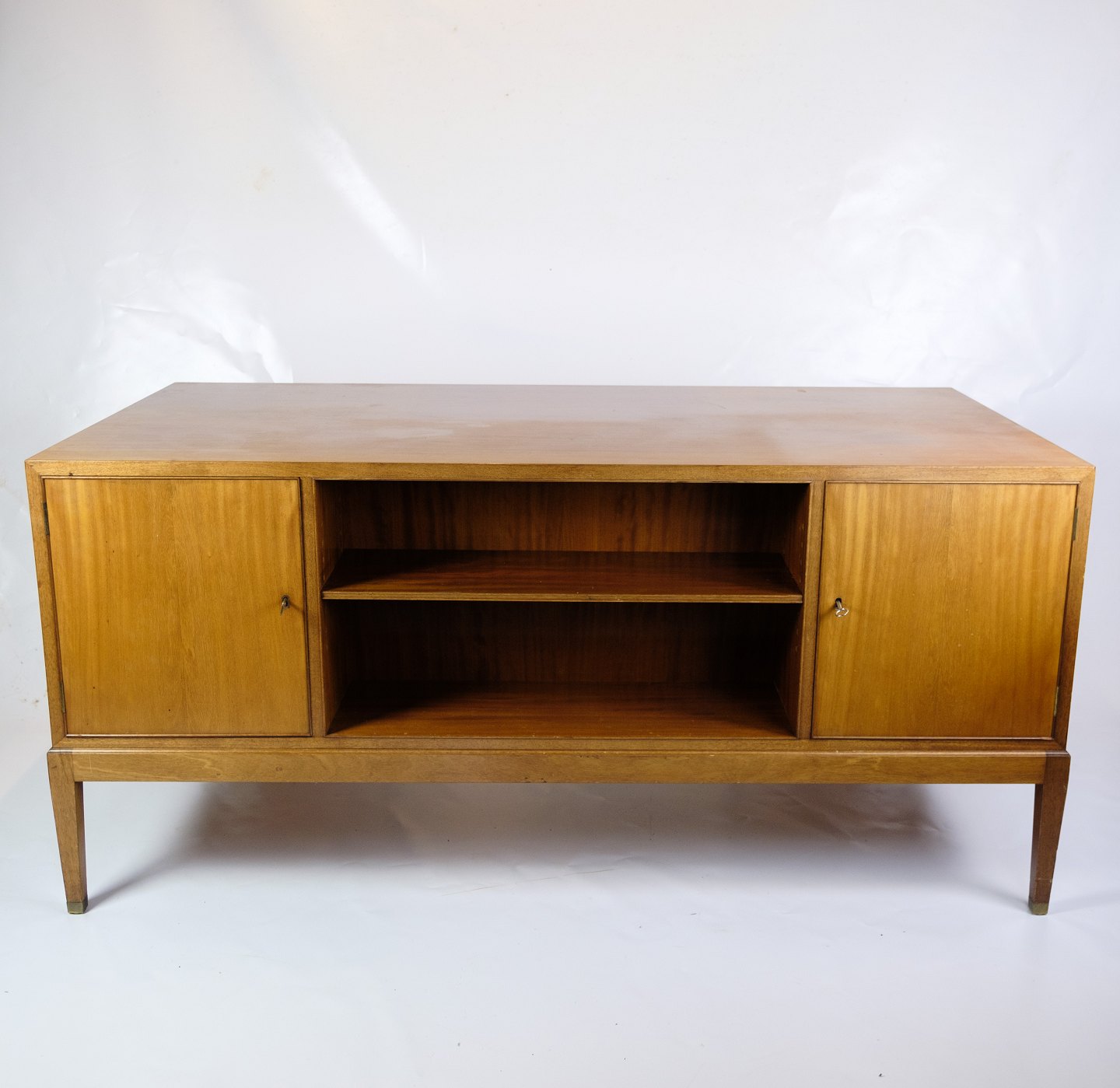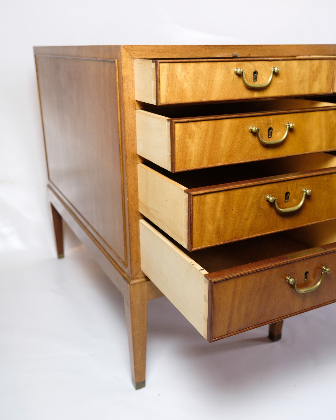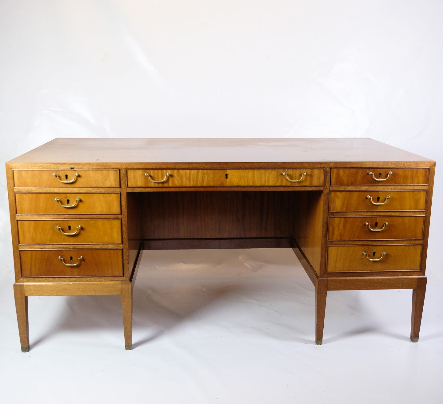 This freestanding desk is a magnificent piece of furniture art, created by the renowned designer Fritz Henningsen back in the 1930s. Crafted from mahogany wood and equipped with brass handles, this desk exudes timeless elegance and exceptional quality.