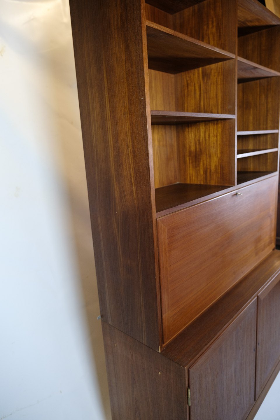 Denne imponerende reol med sekretær/skrivebord er lavet af teak og er fra 1960'erne, er et mesterværk af funktionalitet og æstetik. Med sit smukke teaktræ og karakteristiske design udstråler denne reol en tidløs elegance og enkelhed, der er kendetegnende for dansk design.
