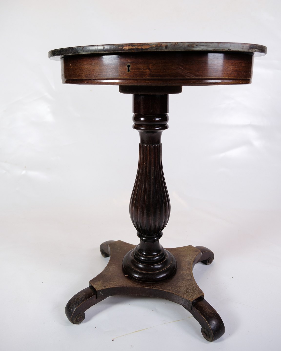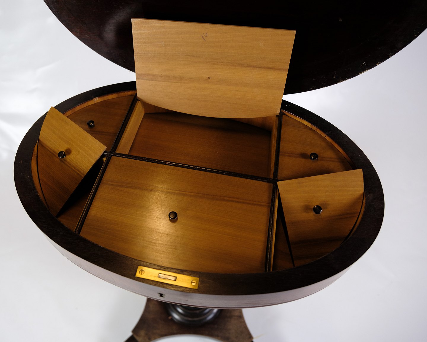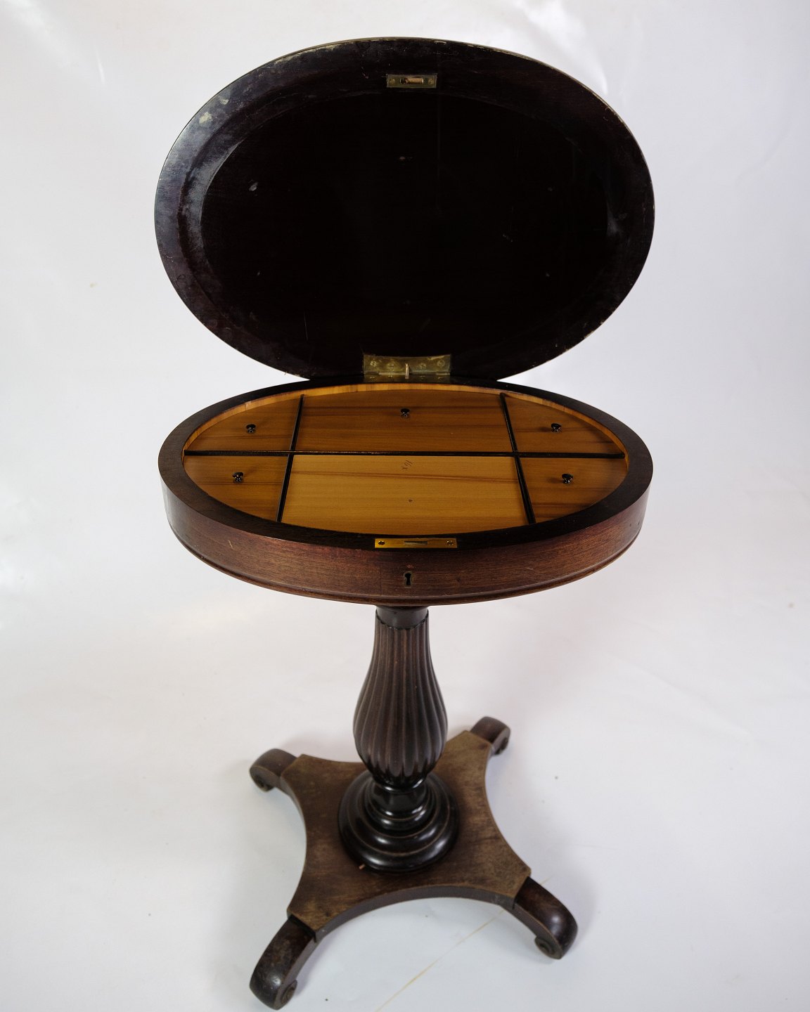 Det mest bemærkelsesværdige træk ved dette sidebord er dets unikke funktion som et sybord, komplet med et syrum integreret i designet. Denne funktionelle detalje vidner om møblets historie og dets oprindelige formål som et praktisk møbel til håndværk og opbevaring.