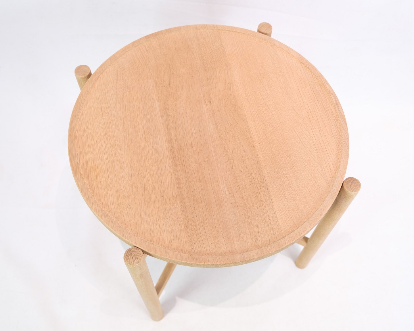 SolgtDette bakkebord eller sidebord, designet af den berømte danske møbelarkitekt Hans J. Wegner og kendt som PP35/62, er et mesterværk af enkelhed og funktionalitet. Fremstillet af sæbebehandlet egetræ, udstråler dette bord en naturlig skønhed og varme, der er karakteristisk for Wegners design.