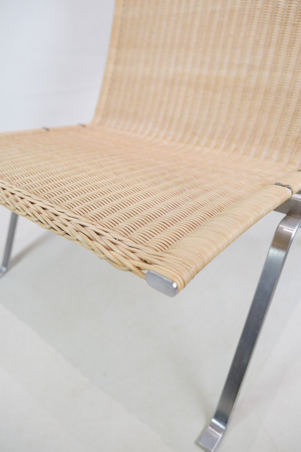 Fremstillet af Fritz Hansen i 1993, er denne PK22-stol et eksempel på tidløs design, der stadig begejstrer og inspirerer i dag. Den har et let og slankt kromstel, der skaber en smuk kontrast til det bløde og komfortable flet i sædet og ryglænet. Den originale fletting tilføjer en naturlig varme og tekstur til stolen, samtidig med at den understreger dens æstetiske appel.