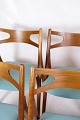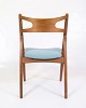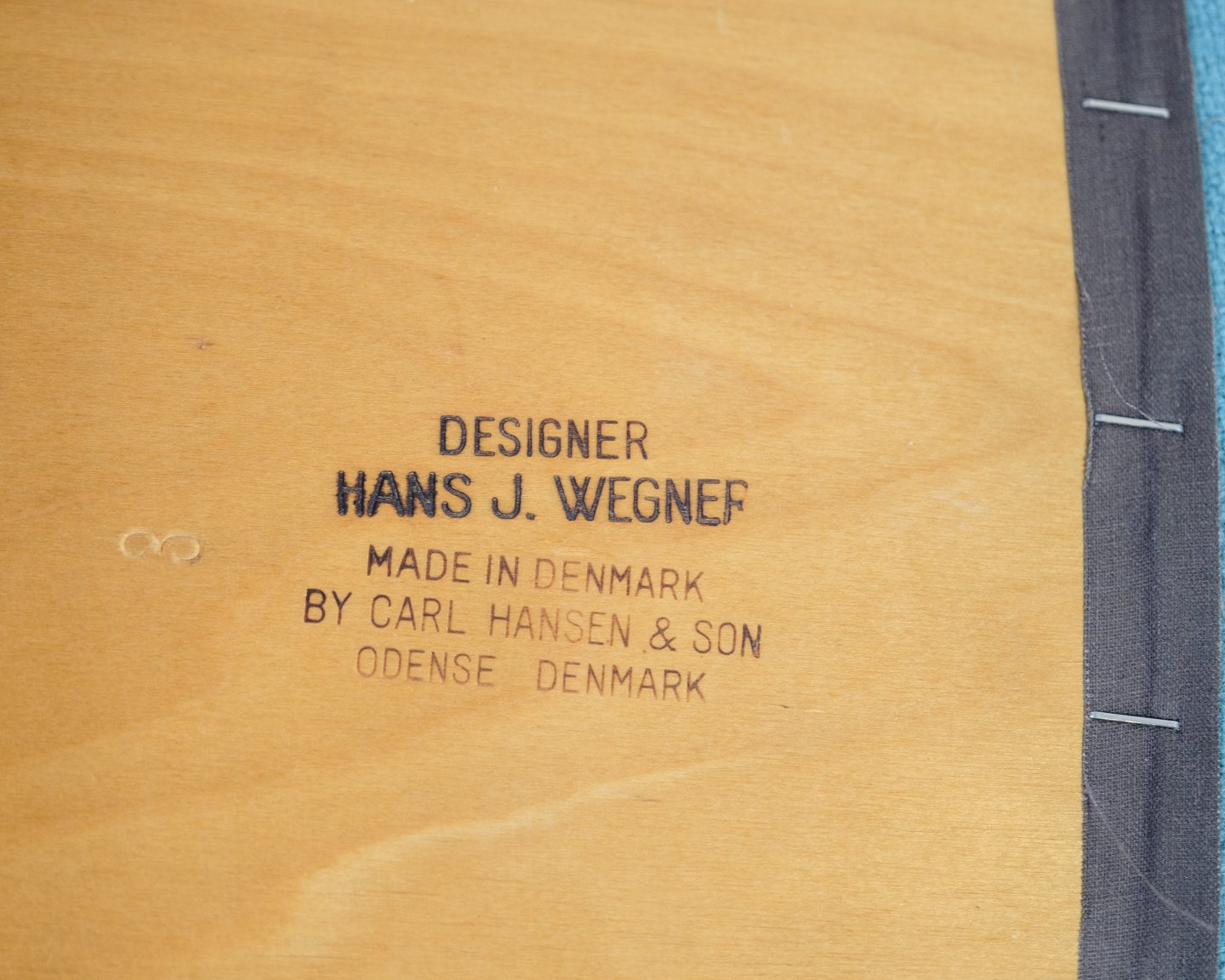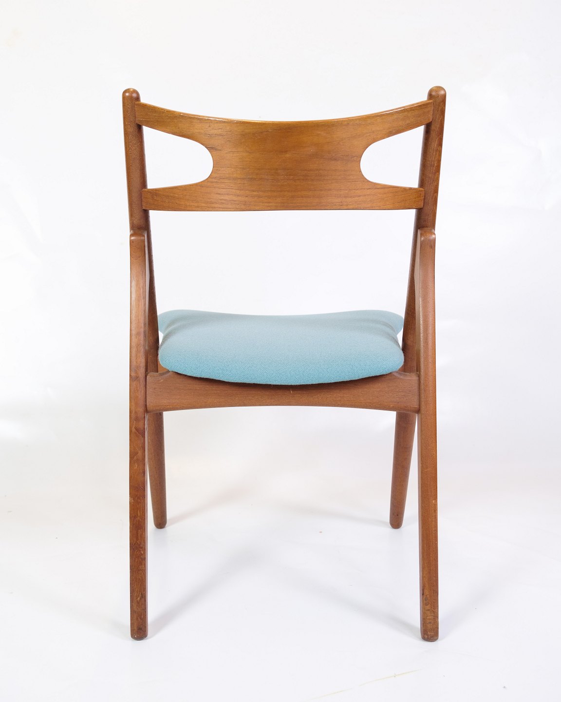 This set of six dining room chairs, model CH29P, is made of teak wood and has a timeless elegance that fits perfectly in any dining area. The chairs are carefully upholstered in light blue fabric that adds a pleasant contrast to the warm wood.