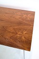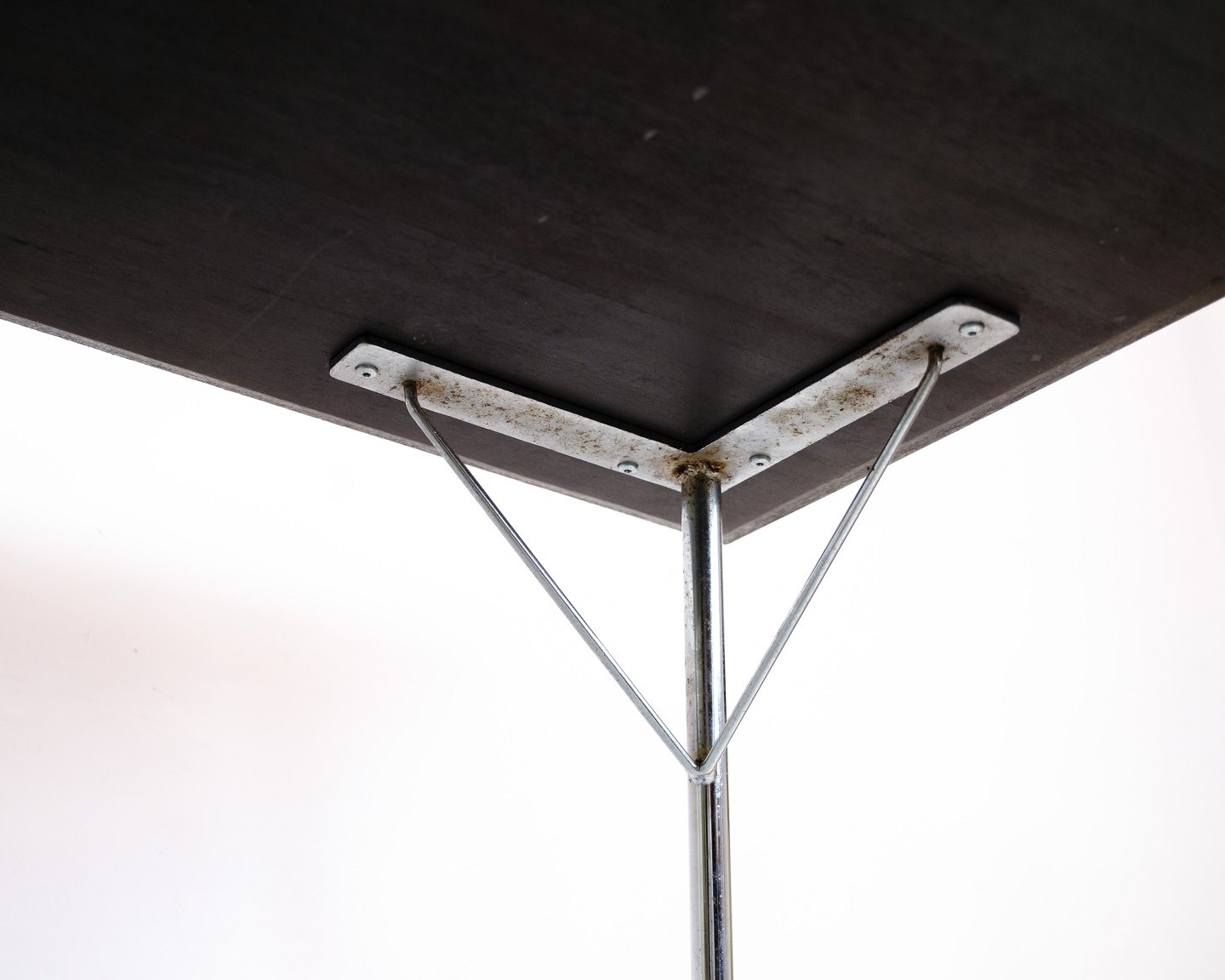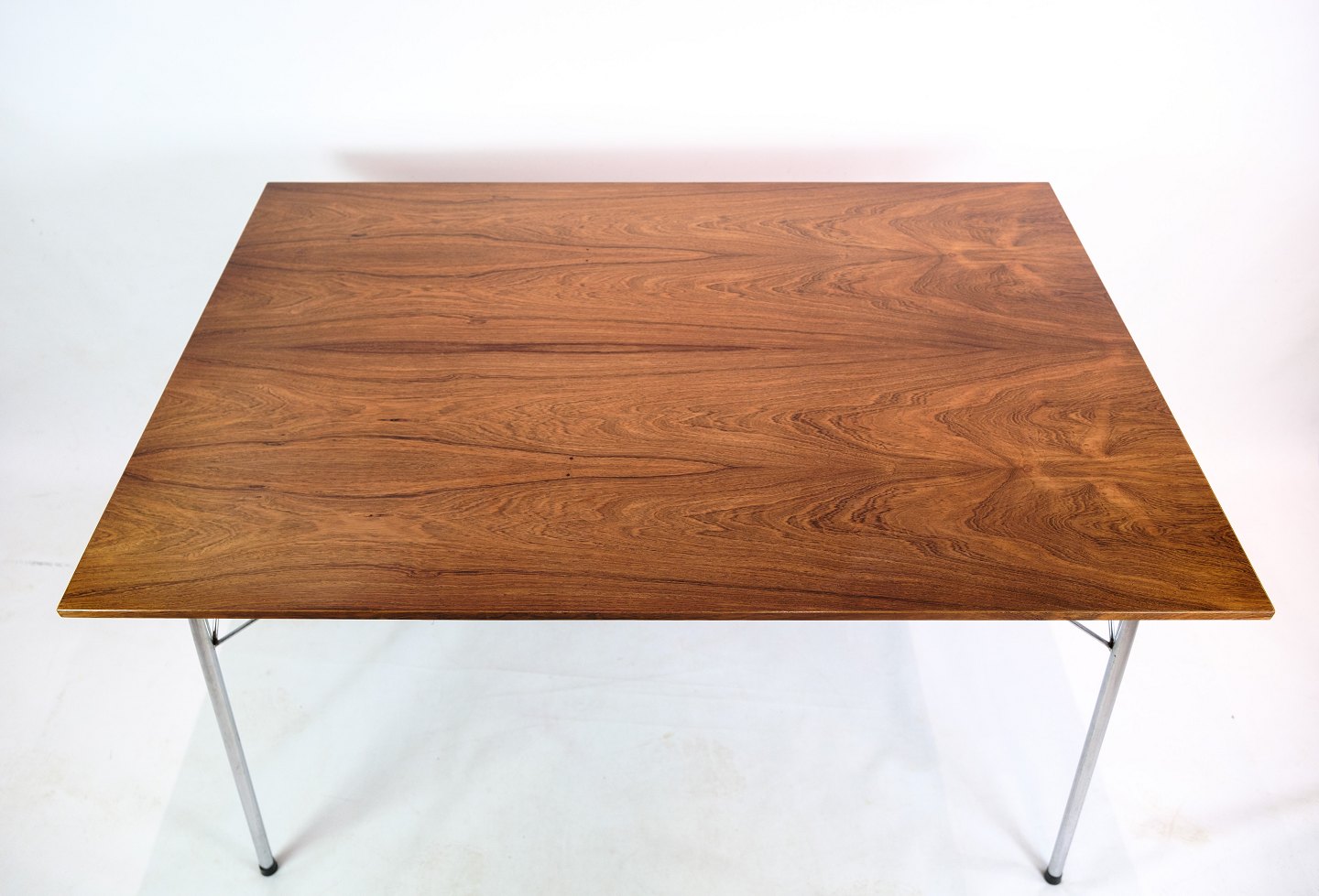 Dining table/cafe table in rosewood with chromed steel frame, designed by Arne Jacobsen for Fritz Hansen in the 1960s. The table is manufactured with a focus on both aesthetics and functionality, where the exclusive materials meet in a stylish design. Arne Jacobsen is known for his pioneering and functional designs, while Fritz Hansen is recognized for their high quality and craftsmanship.