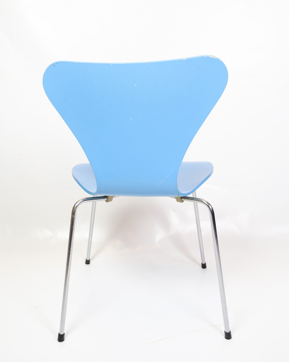 Set of 5 dining chairs, model 3107, also known as the "Syver chair", designed by Arne Jacobsen and produced by Fritz Hansen in the 1980s. The chairs are lacquered in a light blue colour, which gives them an elegant and timeless look. The Seven chair is known for its comfortable and iconic shape, which combines functionality with a stylish design.