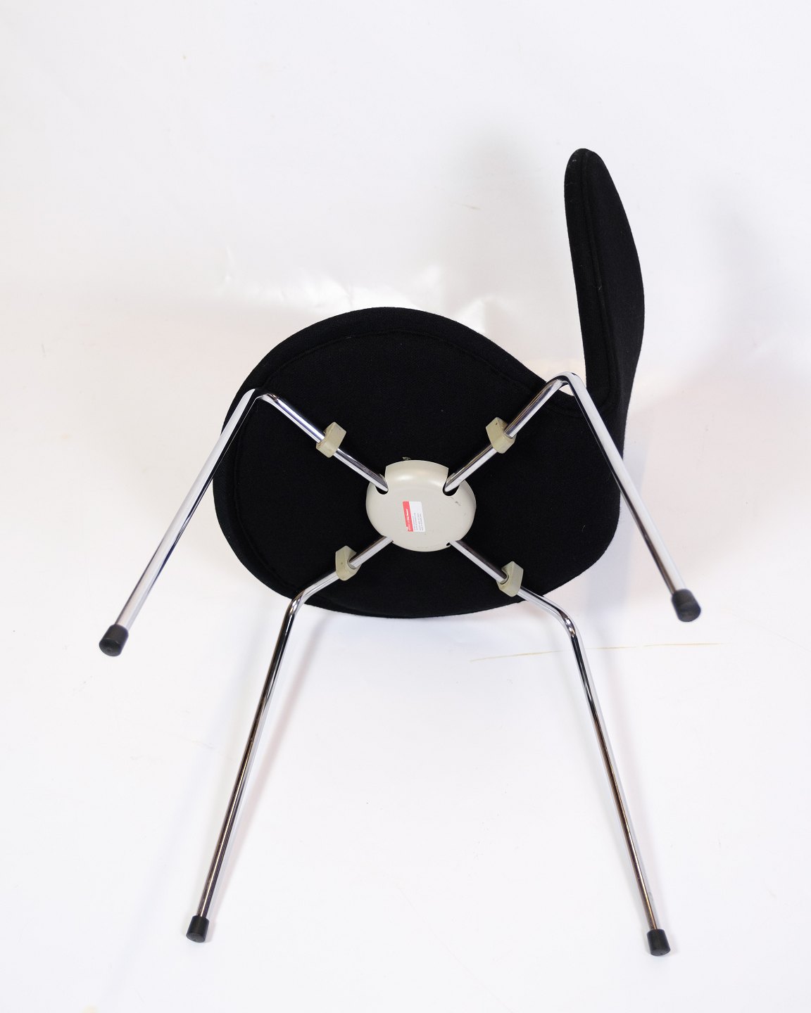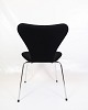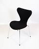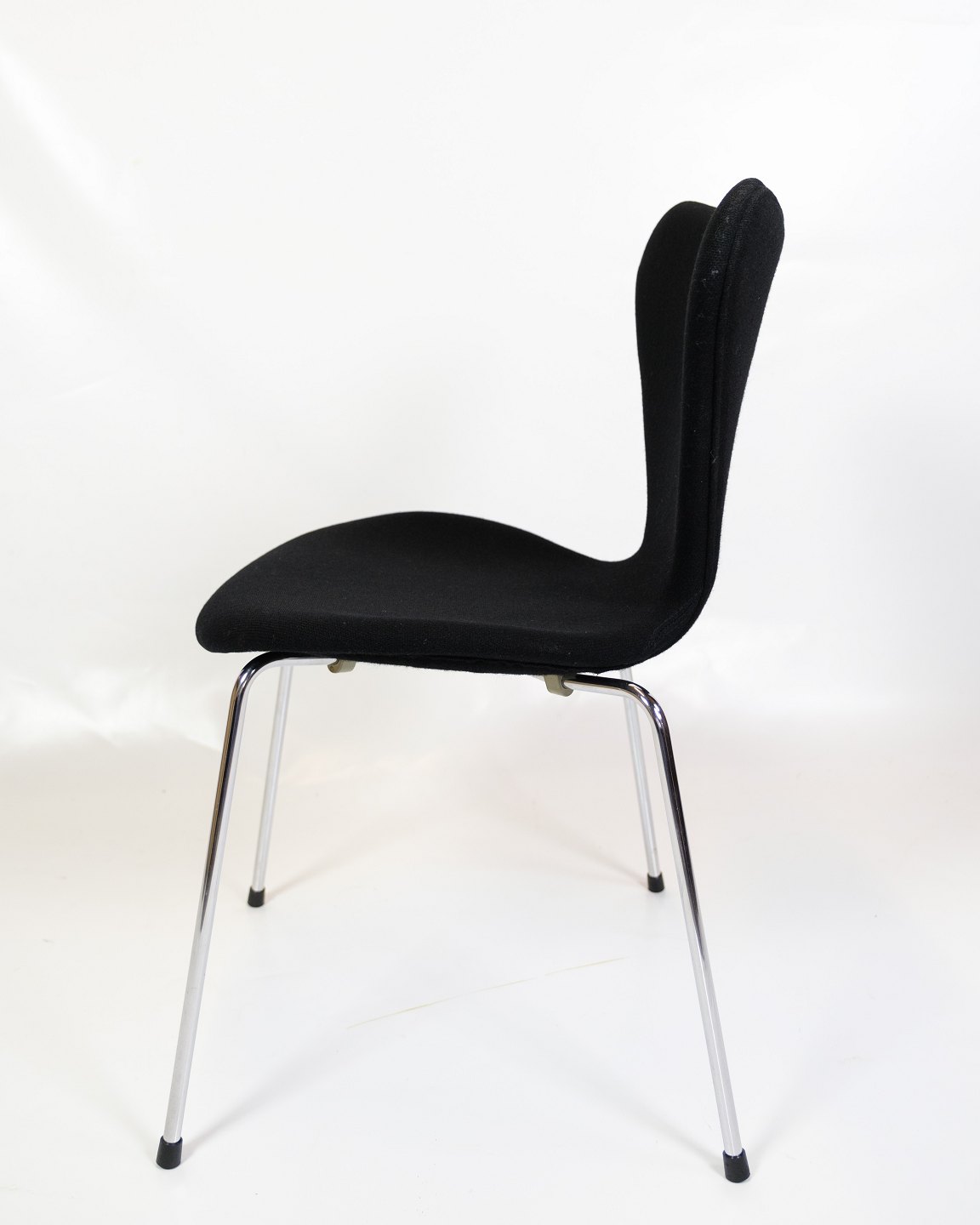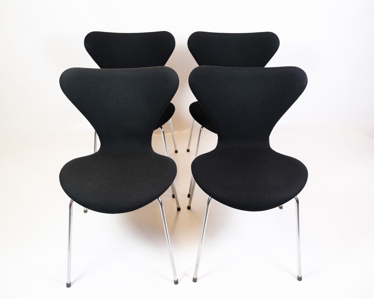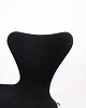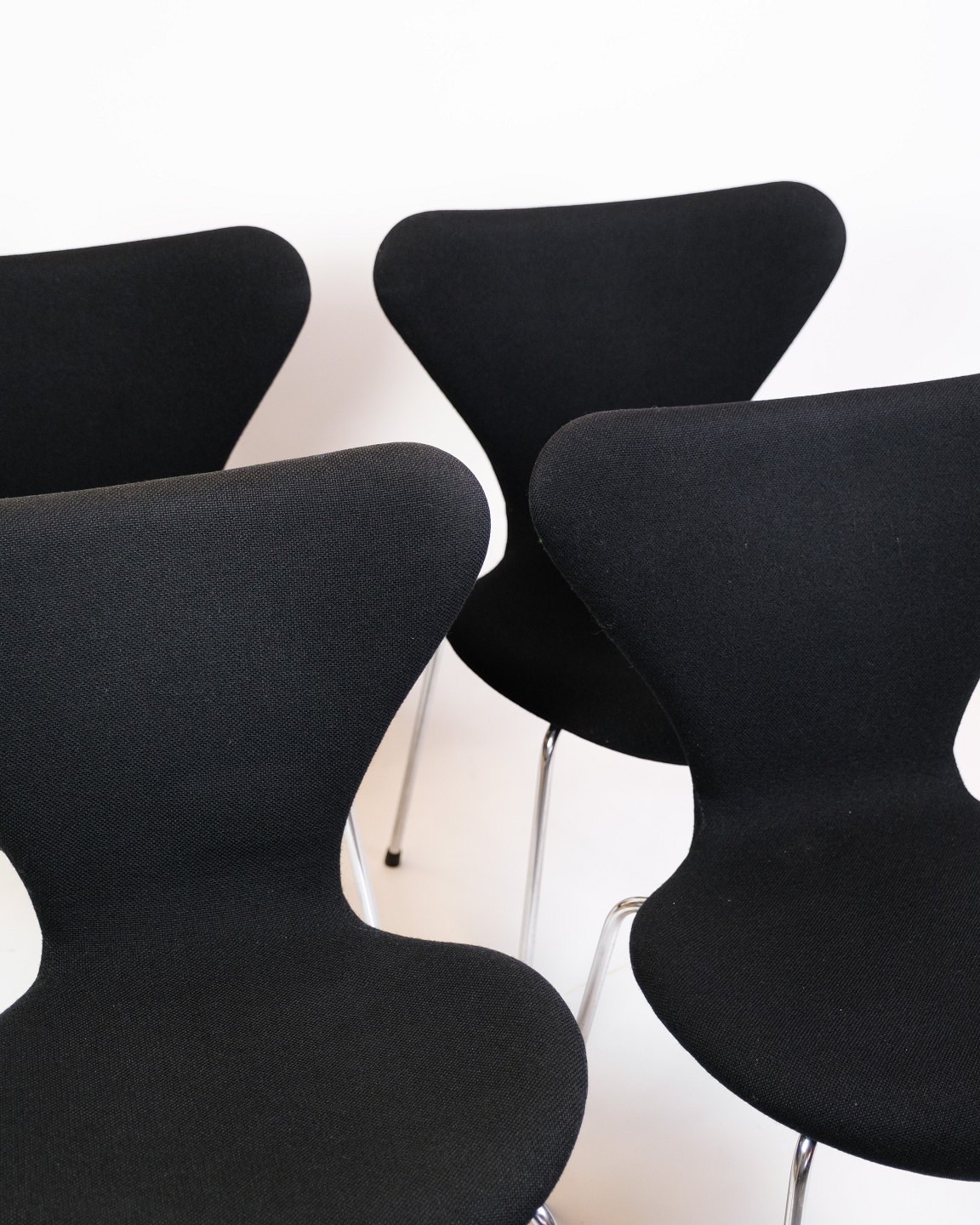 Sæt af 4 spisebordsstole, model 3107, også kendt som "Syver-stolen", designet af Arne Jacobsen og produceret af Fritz Hansen. Stolene er original polstret i sort stof. Syver-stolen er kendt for sin komfortable og ikoniske form, der forener funktionalitet med et stilrent design.