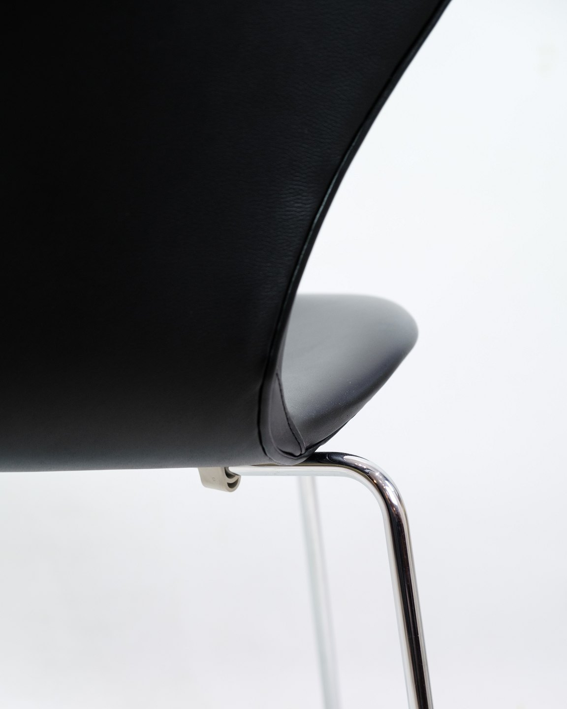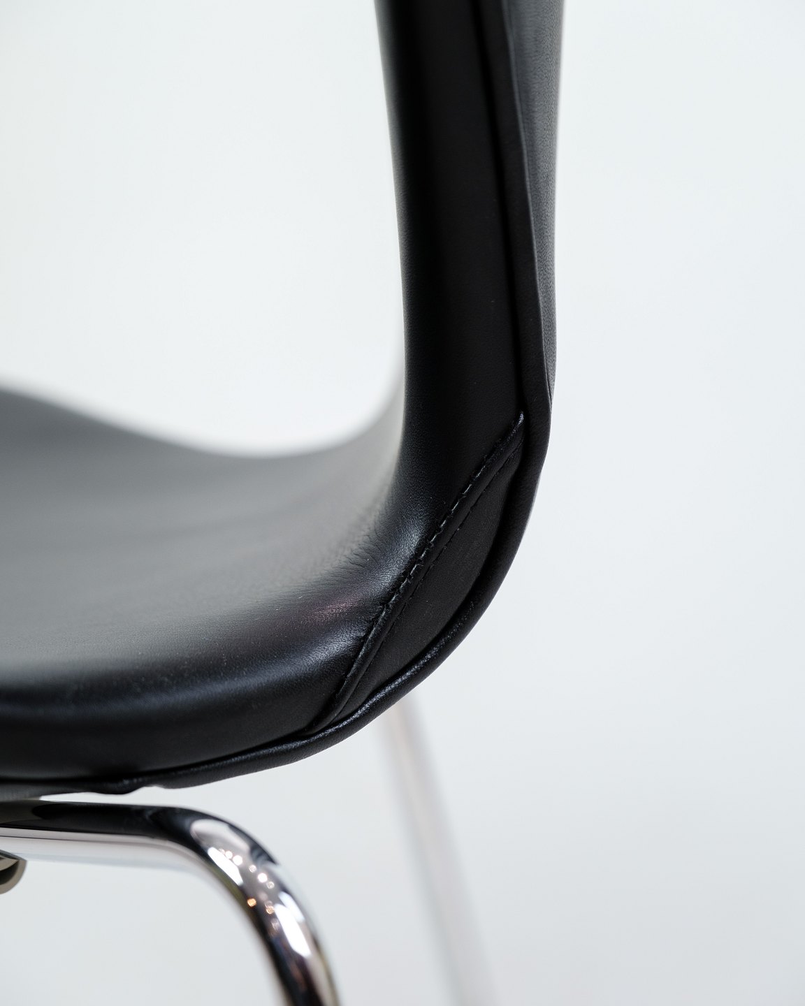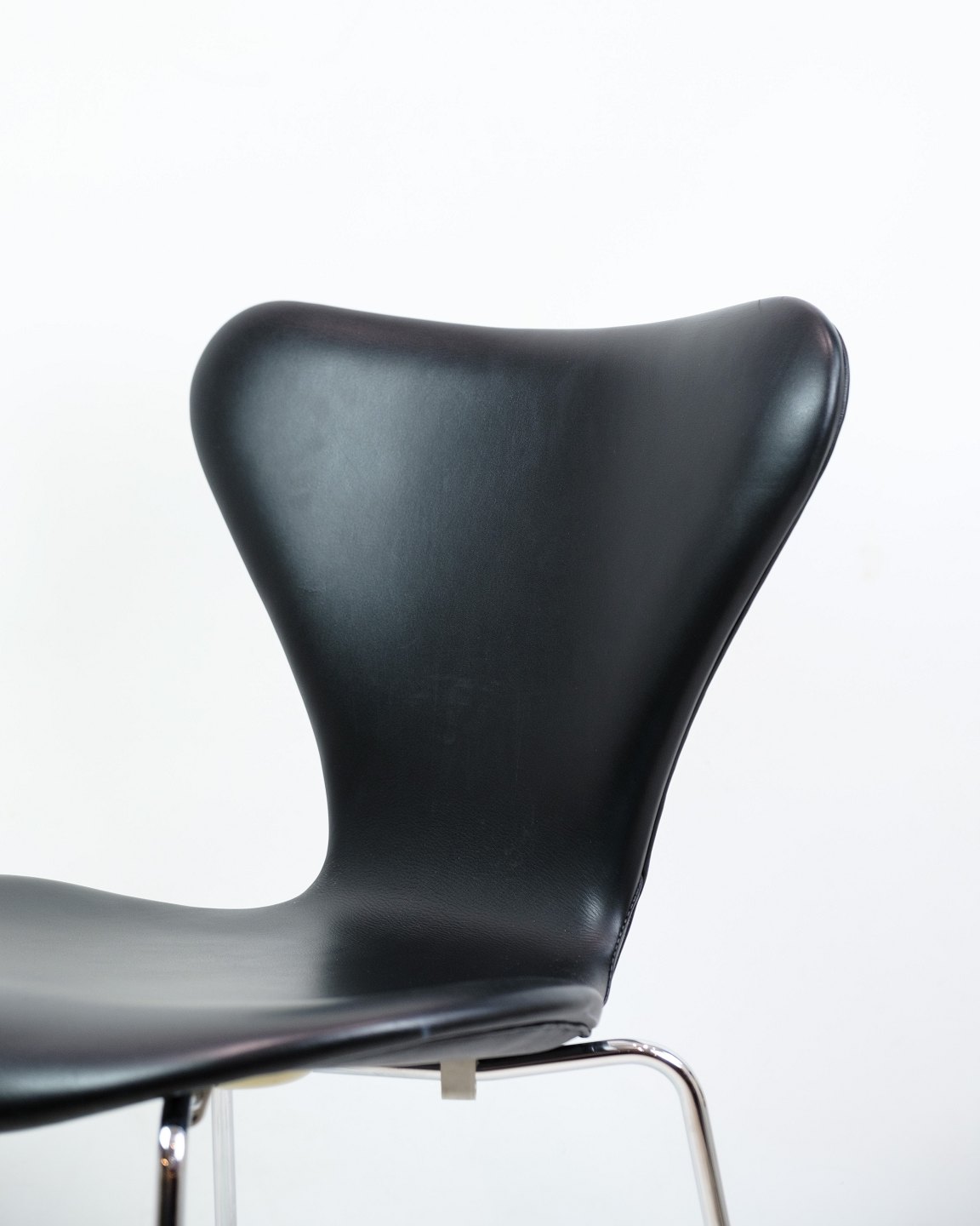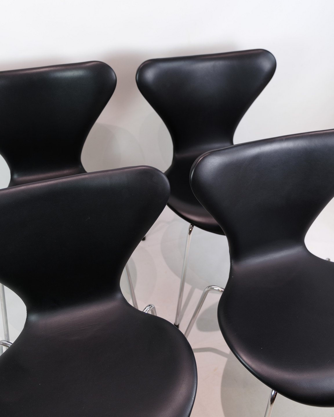 Set of four seven-seater chairs of rare vintage with an old factory stitching, which you only see on the older seven-seater chairs. Designed by Arne Jacobsen and produced by Fritz Hansen. Stands with nice shiny frames without any rust.