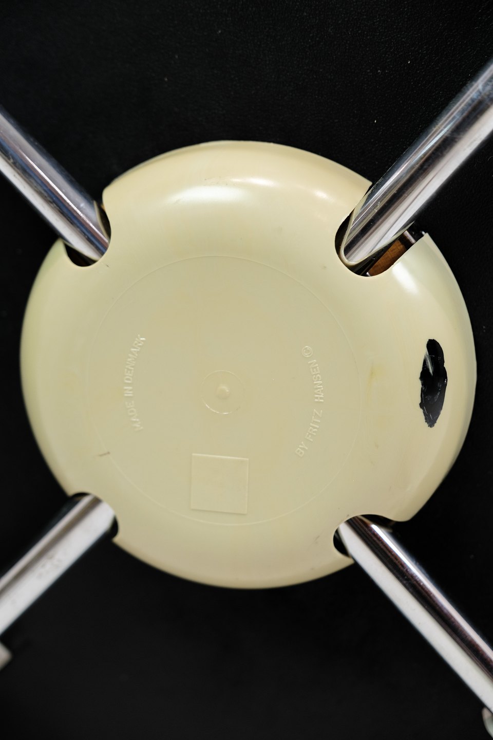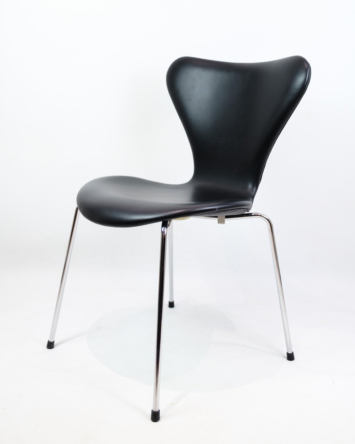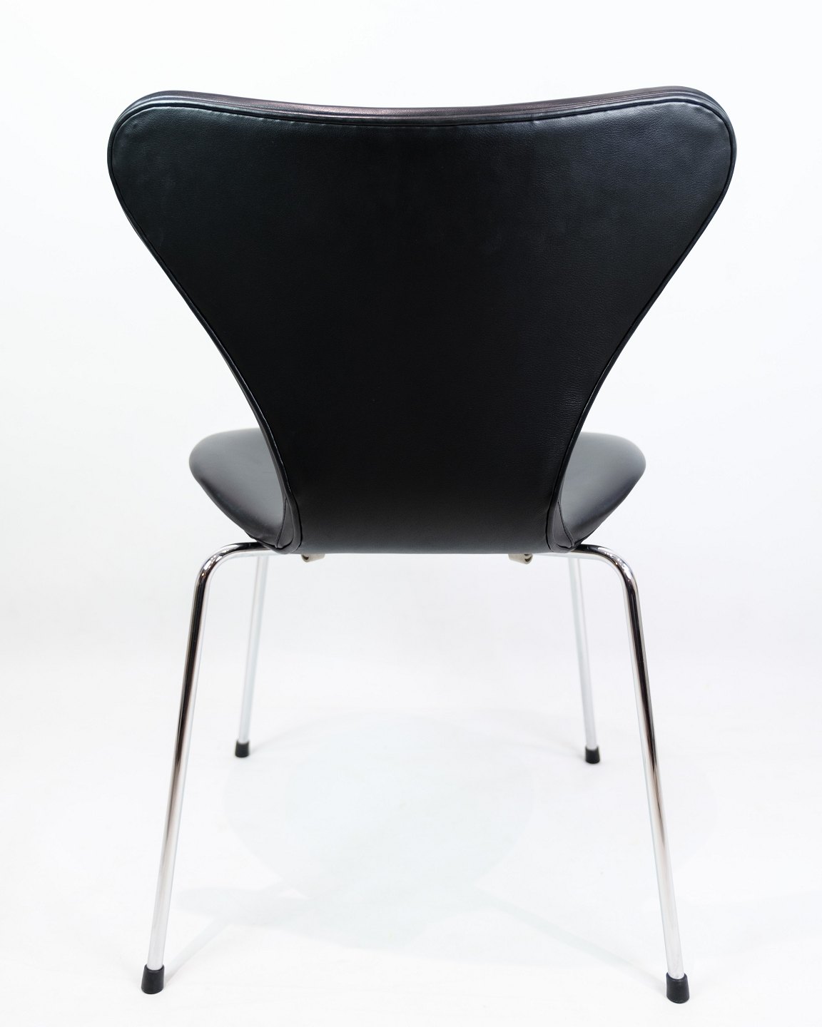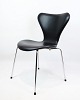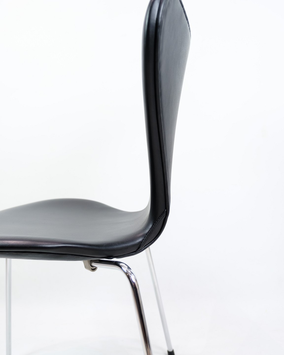 Set of four seven-seater chairs of rare vintage with an old factory stitching, which you only see on the older seven-seater chairs. Designed by Arne Jacobsen and produced by Fritz Hansen. Stands with nice shiny frames without any rust.