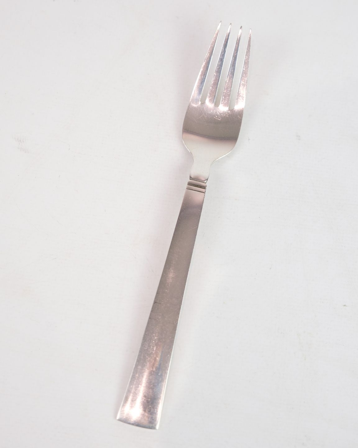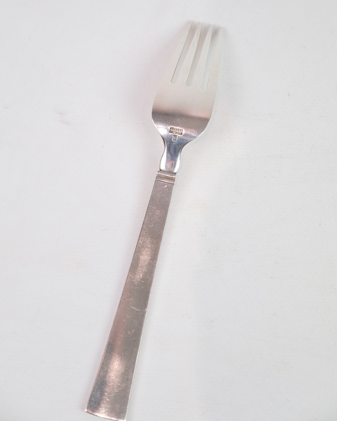 This dinner fork is part of Georg Jensen's "Blok" cutlery series, designed by Just Andersen in 1934. Made of sterling silver (925), the fork is characterized by its simple and functional design, typical of Scandinavian modernism. The "Blok" series is known for its clean lines and timeless aesthetics, making it suitable for both everyday use and formal occasions.