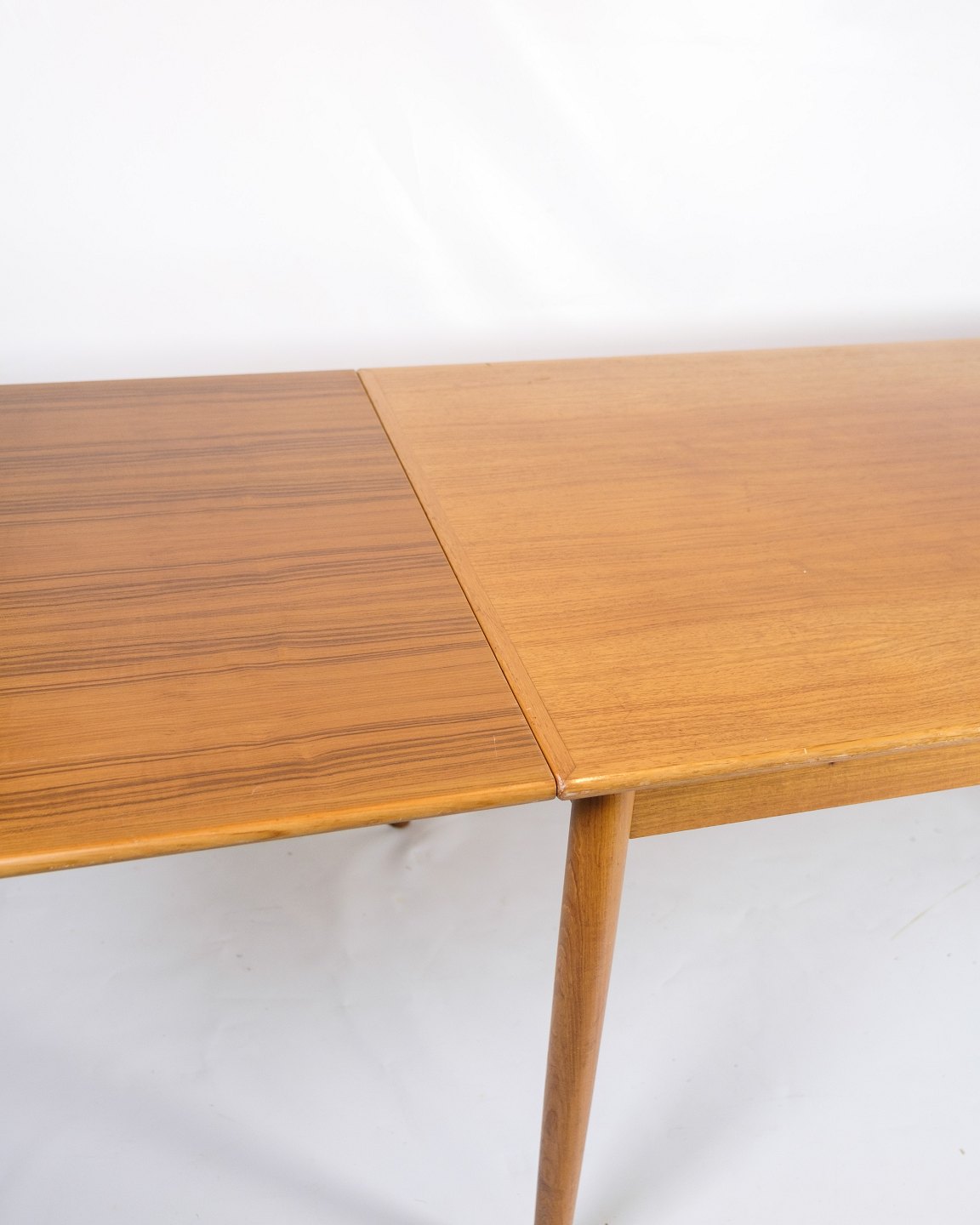 Spisebord med udtræk fra 1960'erne, udført i teak og dansk design. Bordet er designet med rene linjer og en robust konstruktion, typisk for perioden. Det har en udtræksfunktion, der giver mulighed for at tilføje ekstra plader og dermed forlænge bordet, hvilket gør det praktisk til både daglig brug og større sammenkomster.