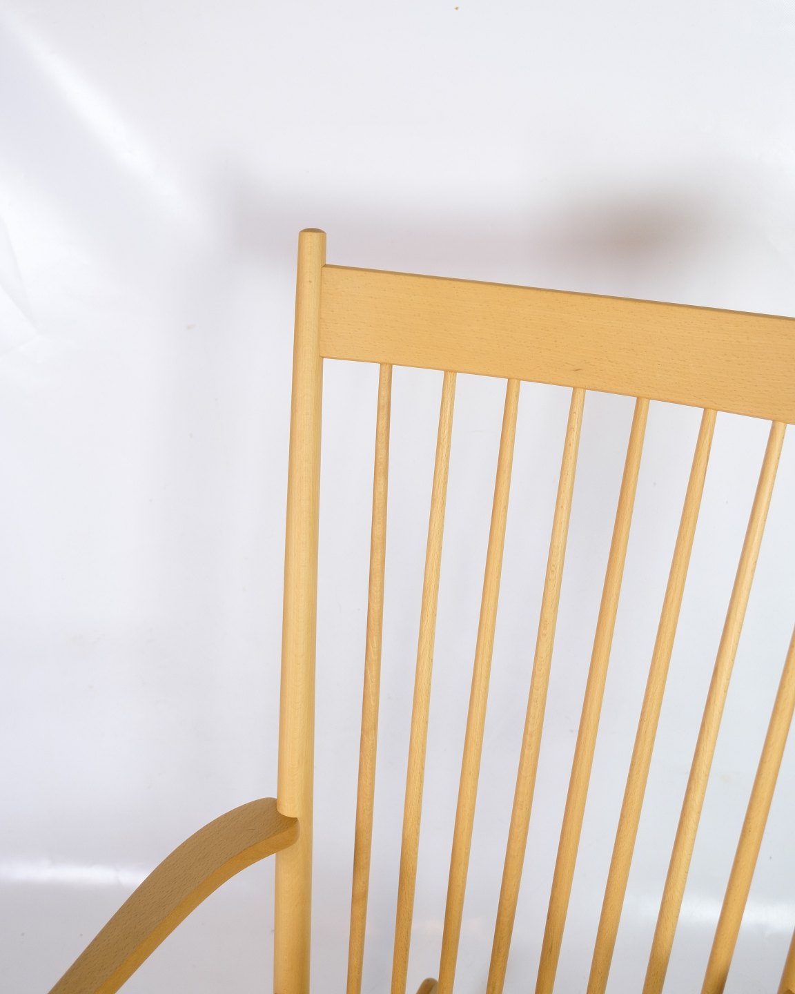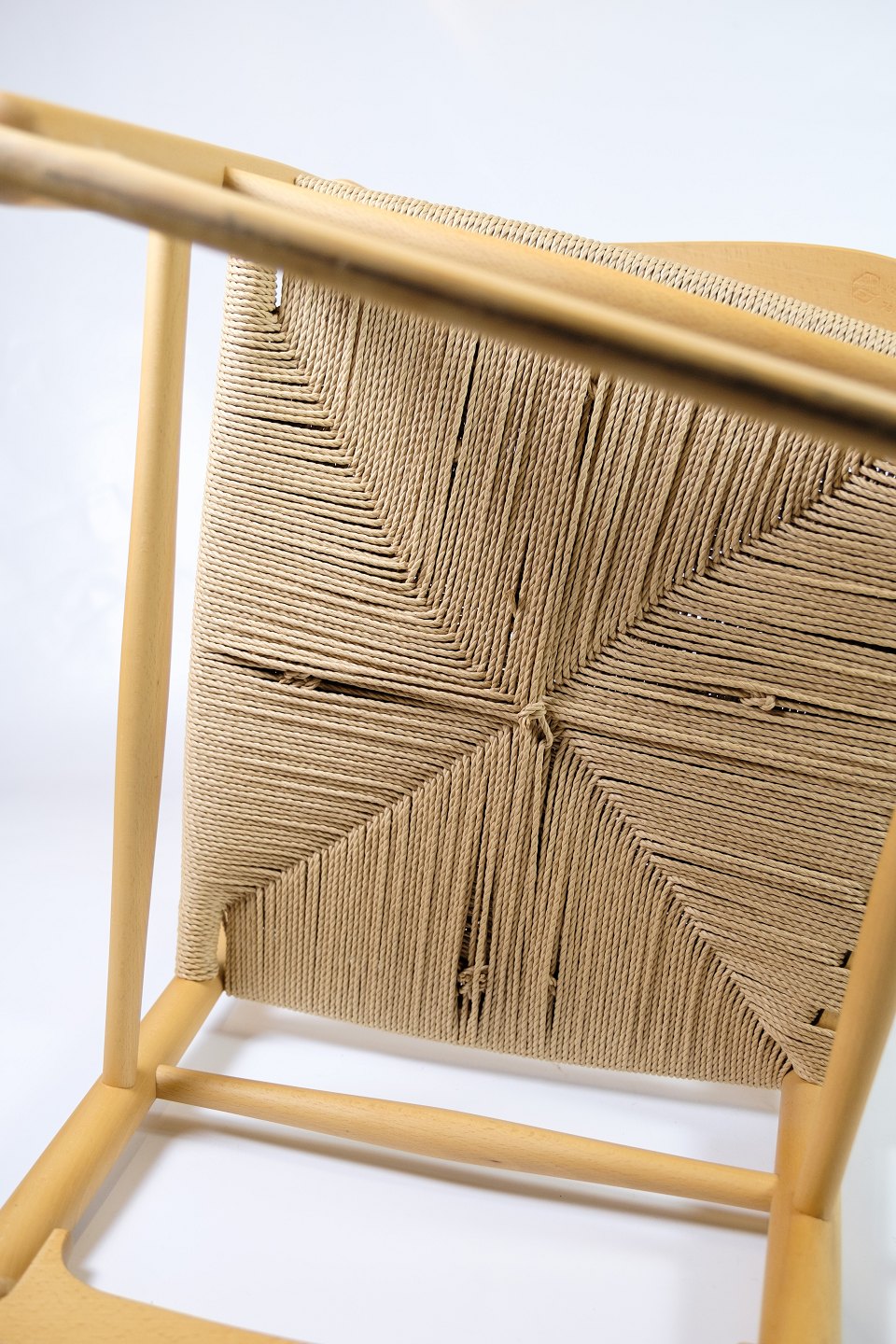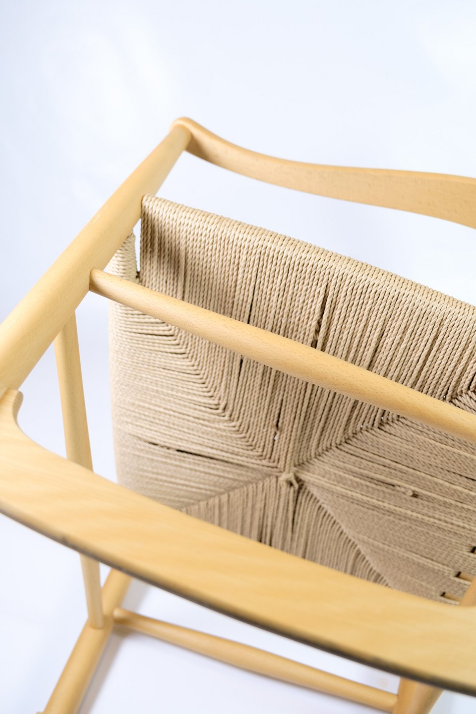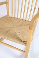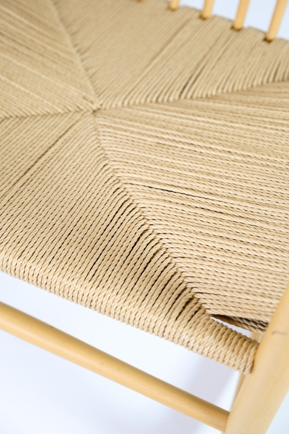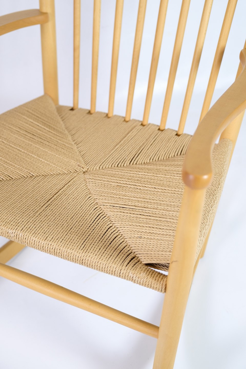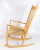 Rocking chair, model J16, designed by Hans J. Wegner for FDB Møbler. The chair is made of beech wood and has a seat in wicker, which is hand-woven for both durability and comfort. With its simple and functional shape, the J16 has become a classic in Danish furniture design. Hans J. Wegner designed the J16 in 1944.