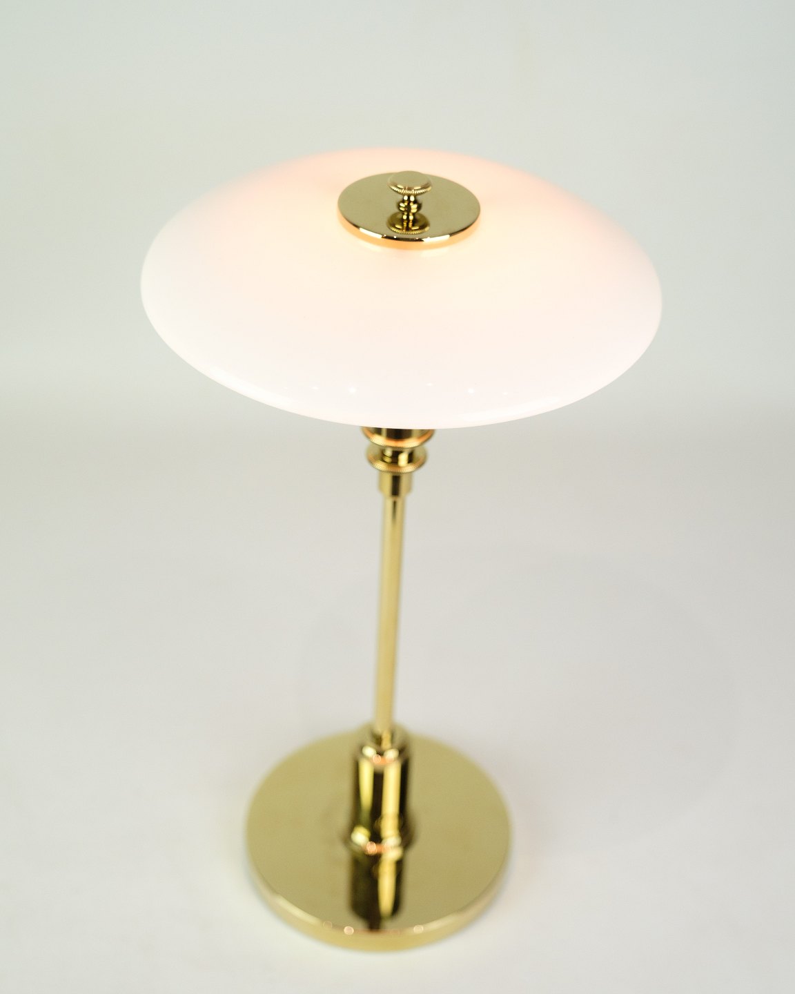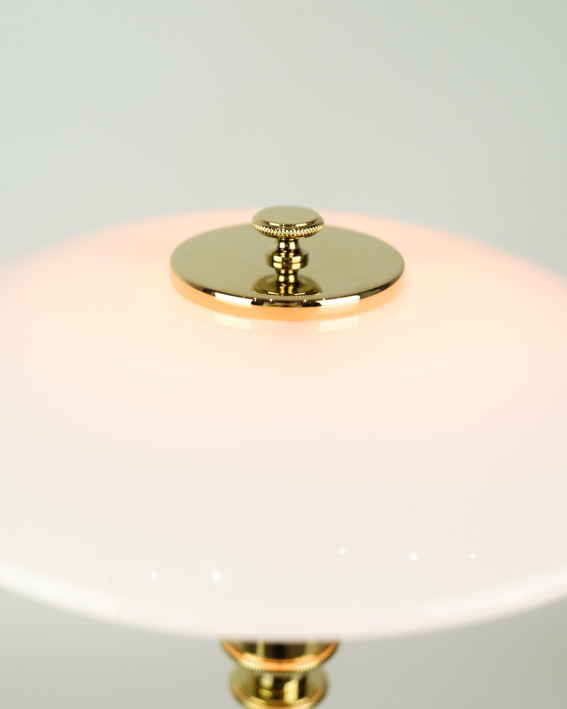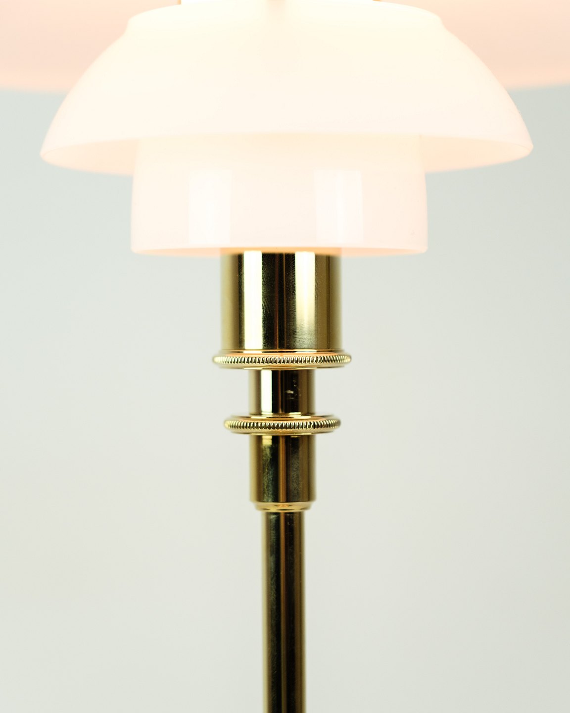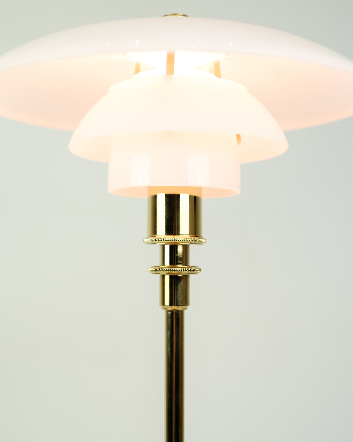 Lampen er udstyret med mundblæste opalglas-skærme, der sikrer en blød og behagelig lysfordeling. Det eksklusive messingstel tilfører en elegant og tidløs æstetik, som passer perfekt til både moderne og klassiske indretninger.
