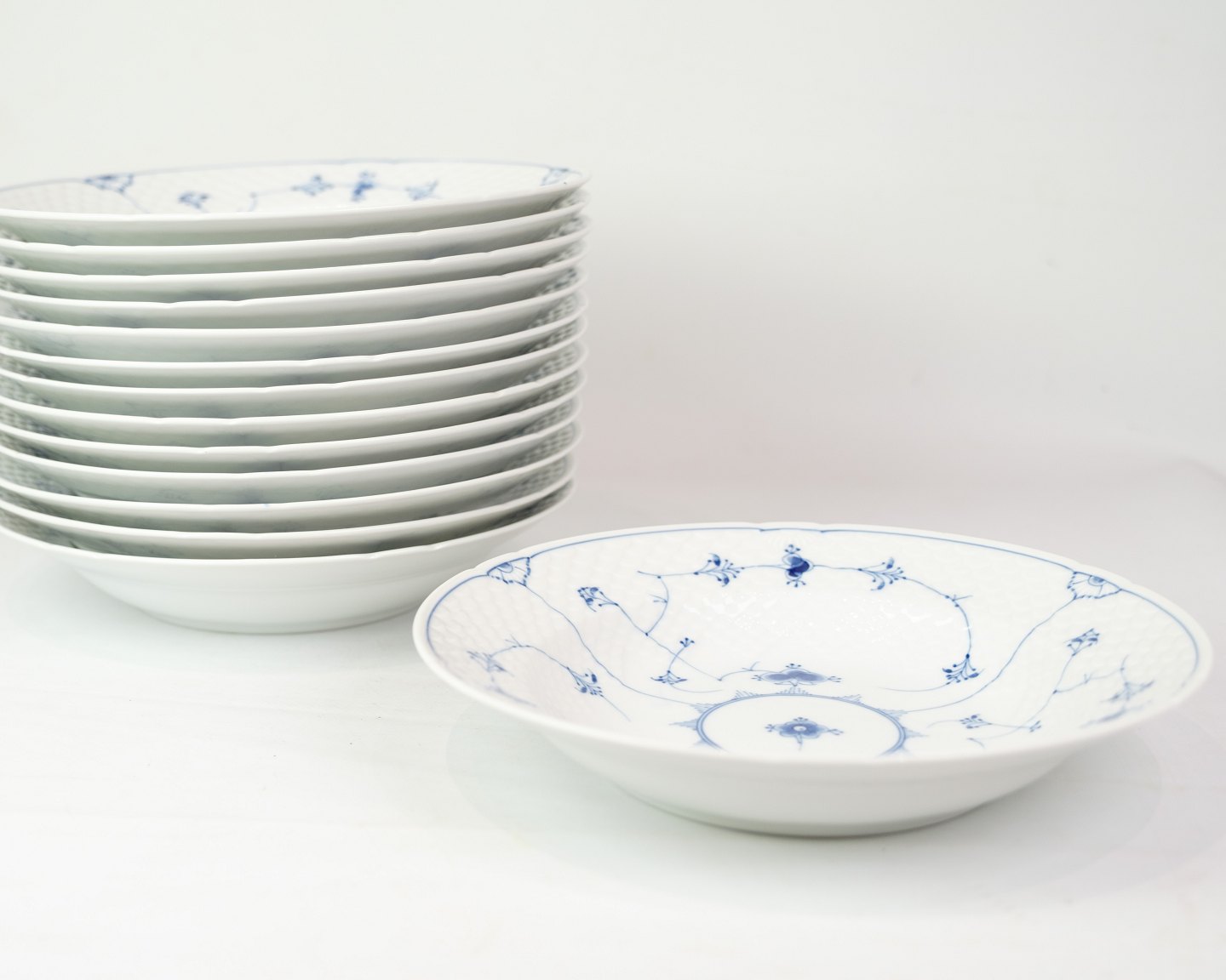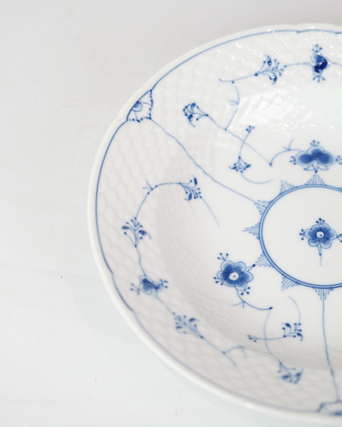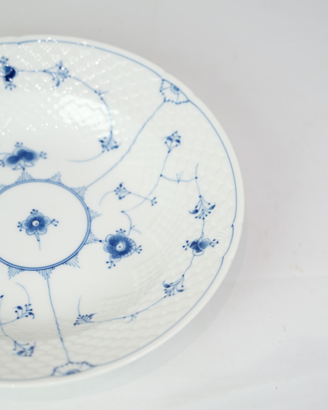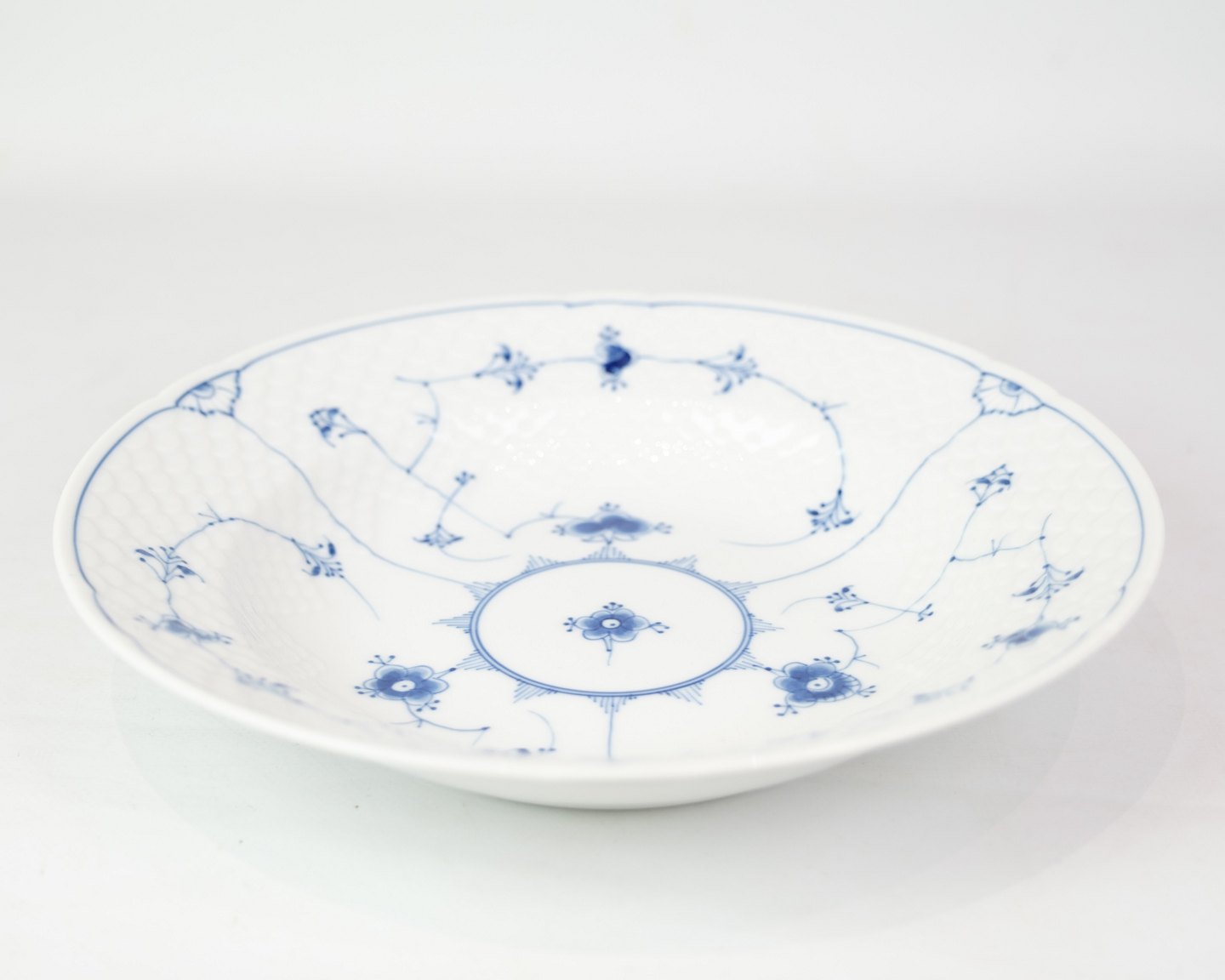 Deep Plate No. 22 from Bing & Grondahl. Made of porcelain with classic blue painted blue fluting decoration.