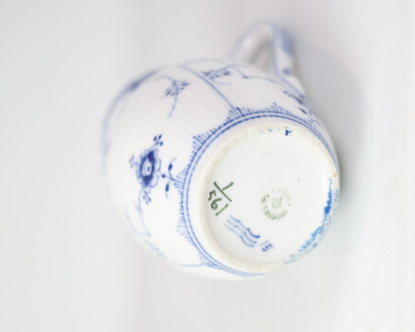 Jug marked 1/561 from Royal Copenhagen, made of porcelain. Made in blue fluting half lace design, hand painted in blue decoration.