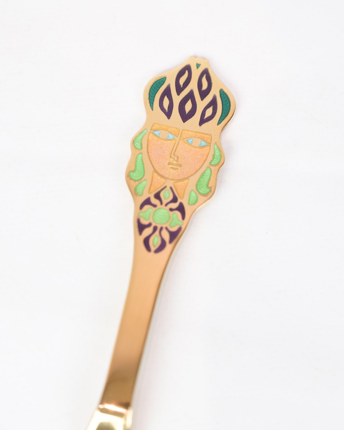 Christmas spoon made by Anton Michelsen in 1982 in Sterling Silver and gilded with enamel. The design is by Kamma Svensson, which has a motif of the Queen of Sheba in green and blue enamel color.