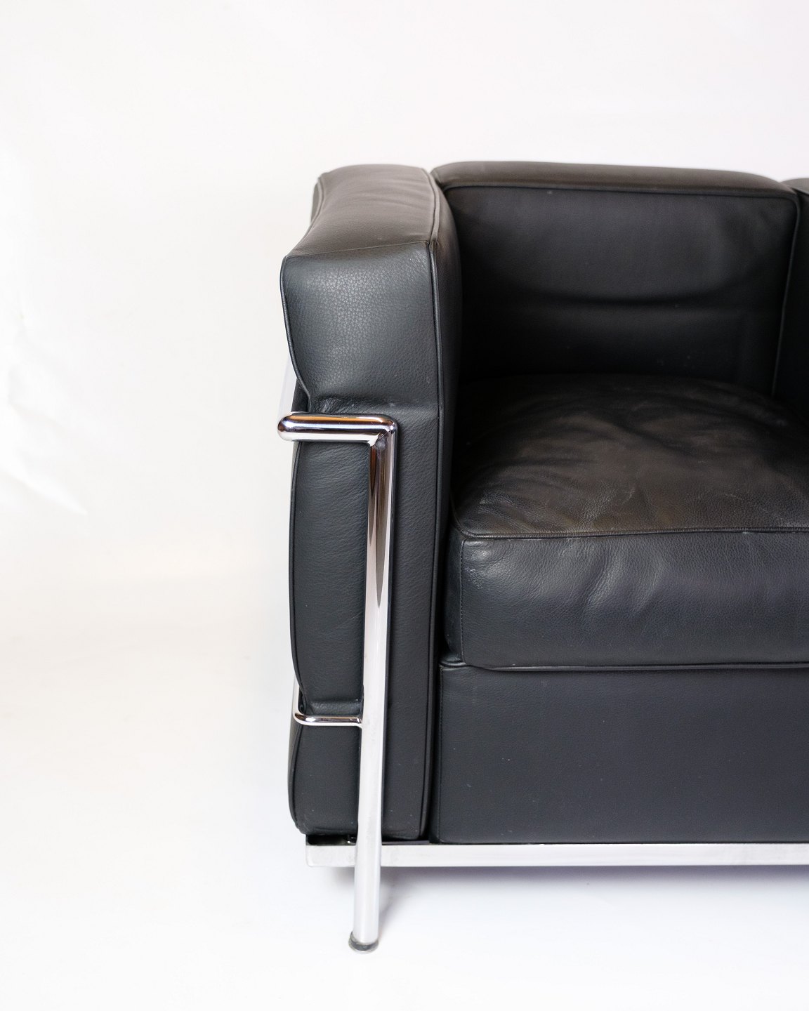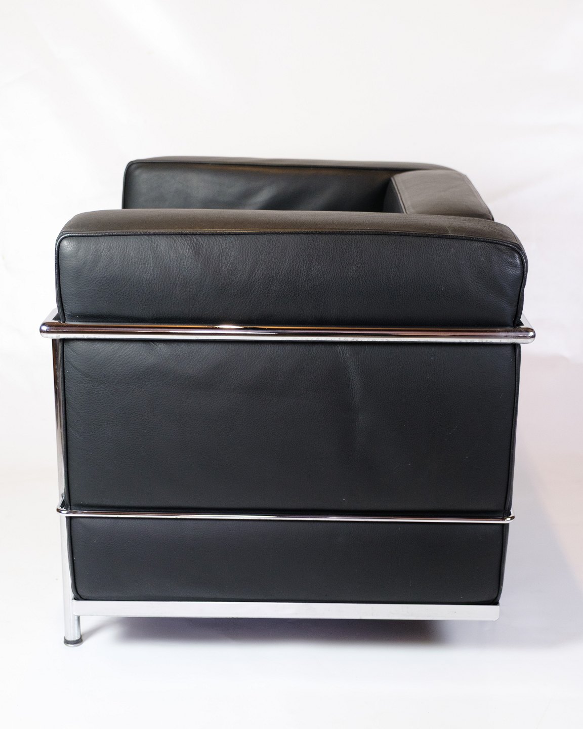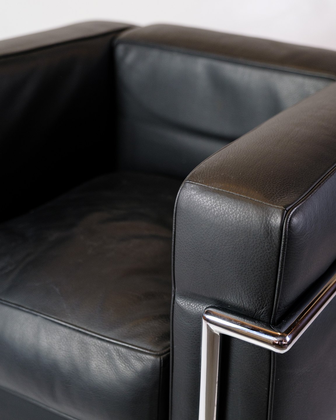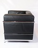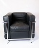 SoldLe Corbusier LC2 armchair, designed in 1928 by Le Corbusier, Pierre Jeanneret and Charlotte Perriand, produced by Cassina. The chair has a frame in chromed steel tubing and upholstery in black leather.