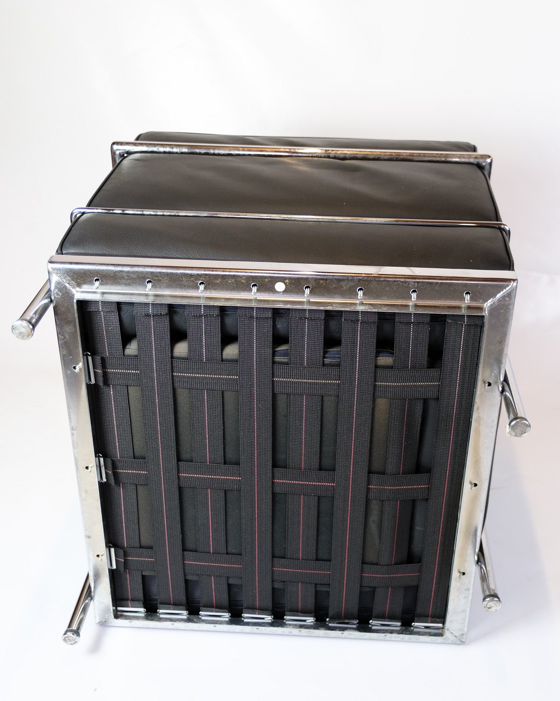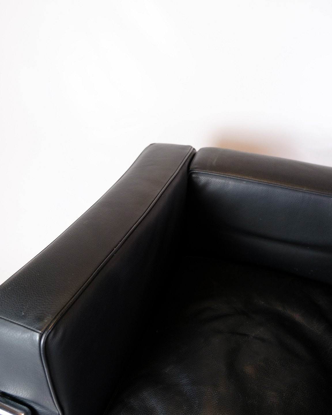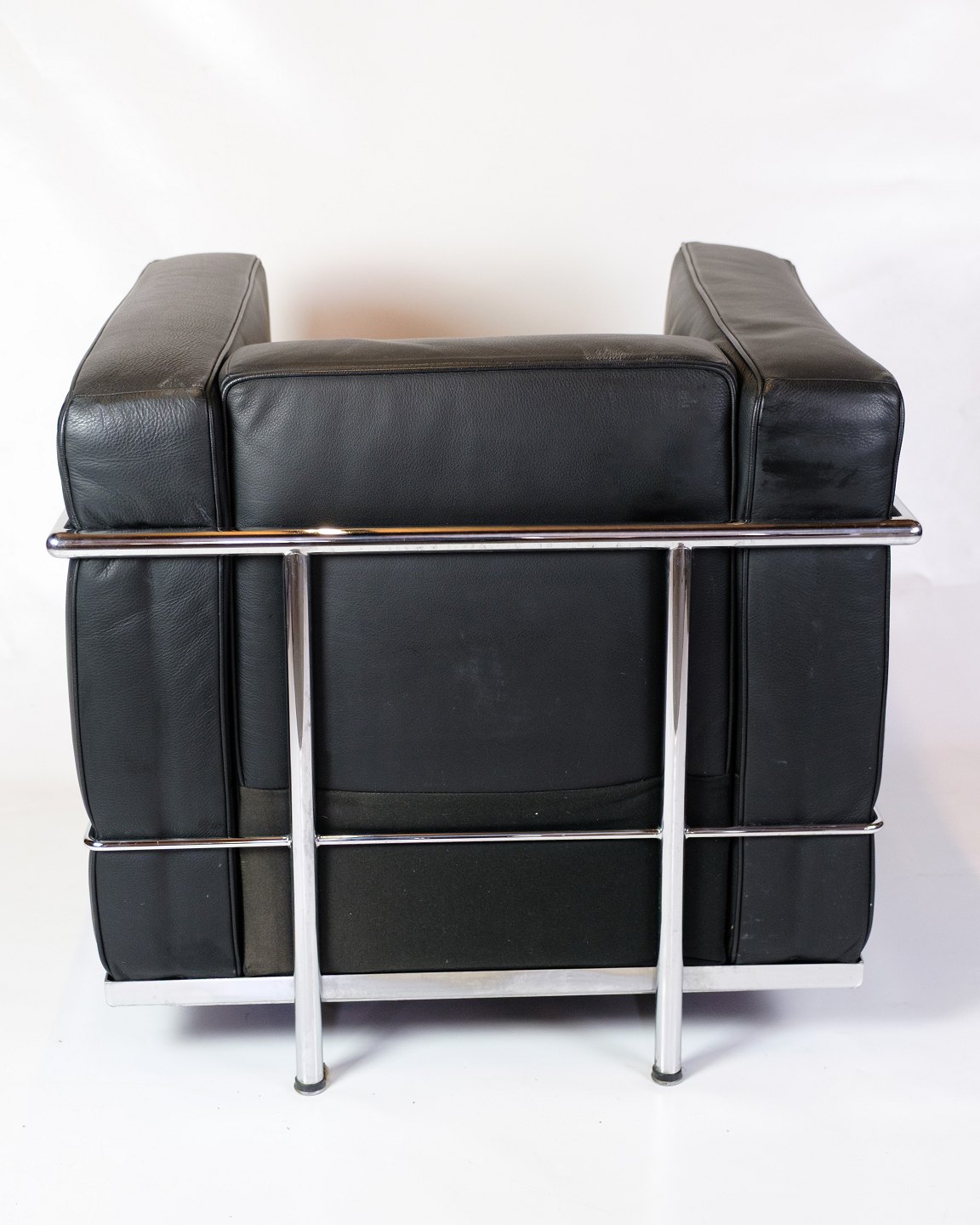 SoldLe Corbusier LC2 armchair, designed in 1928 by Le Corbusier, Pierre Jeanneret and Charlotte Perriand, produced by Cassina. The chair has a frame in chromed steel tubing and upholstery in black leather.