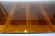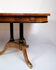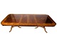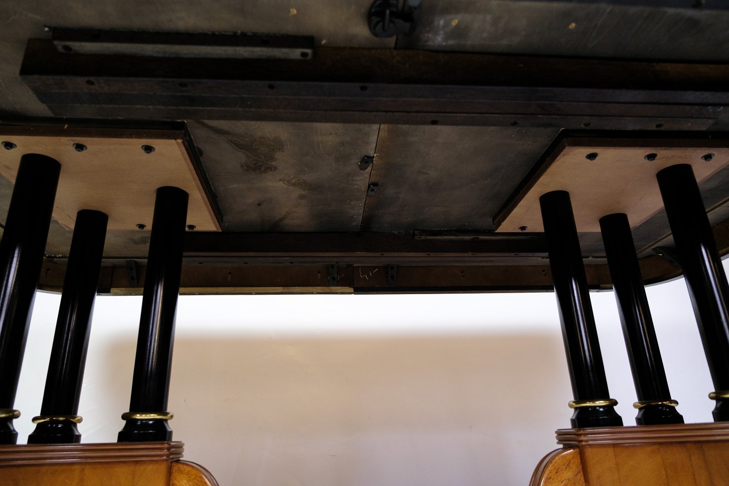 Dining table in veneered mahogany with decorative inlay panels and birch edging. The tabletop has a symmetrically arranged inlay decoration in the middle and rounded corners, which emphasize the classic expression. The frame consists of two elegant column legs with curved feet finished with brass caps, which gives the table stability and a refined expression.