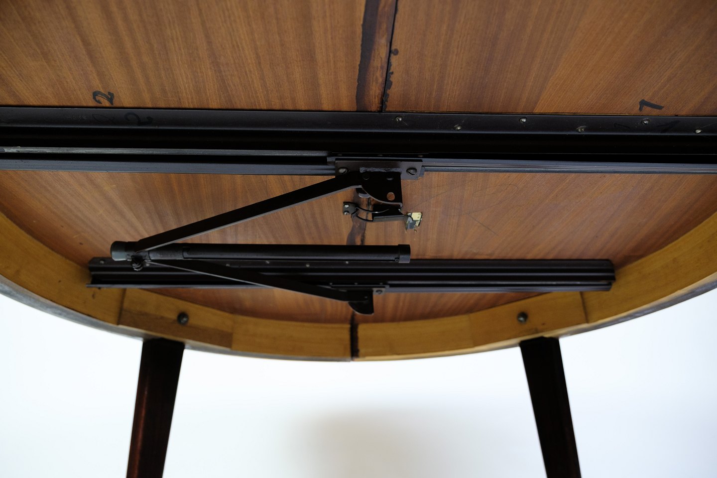 Round dining table, model 55, designed by Omann Junior in the 1960s. Made of mahogany with classic Danish design and focus on solid craftsmanship. The table comes with three extension leaves, which allows for flexible expansion, perfect for both everyday use and larger gatherings.