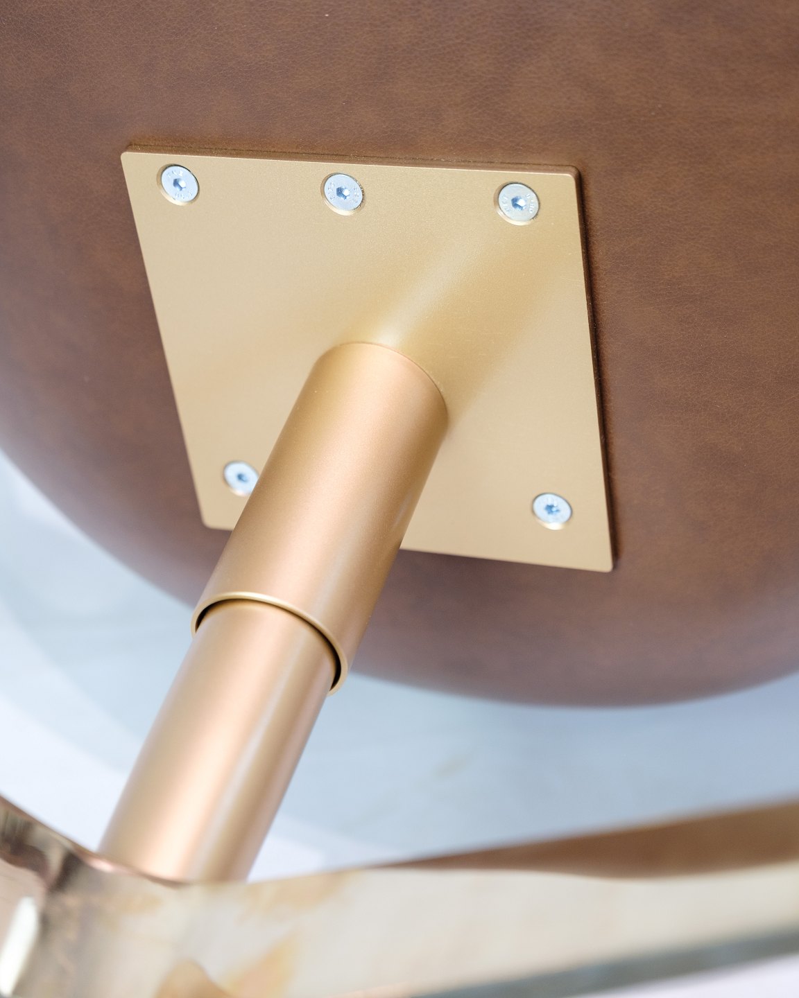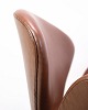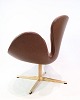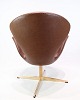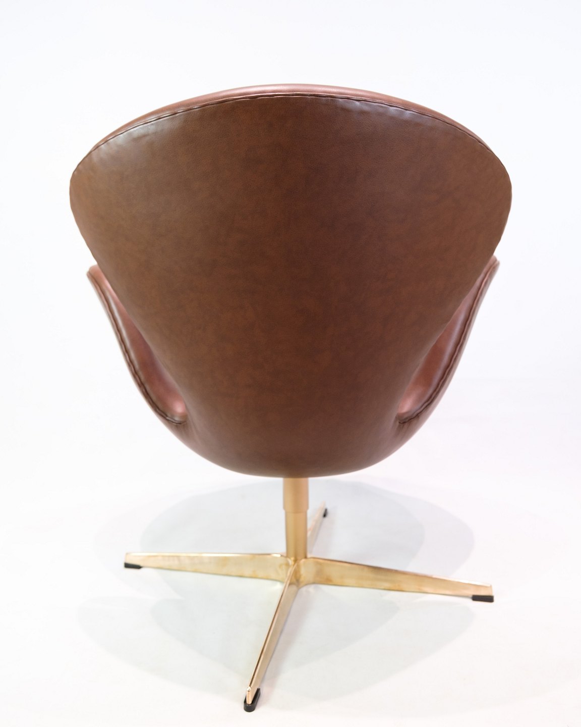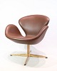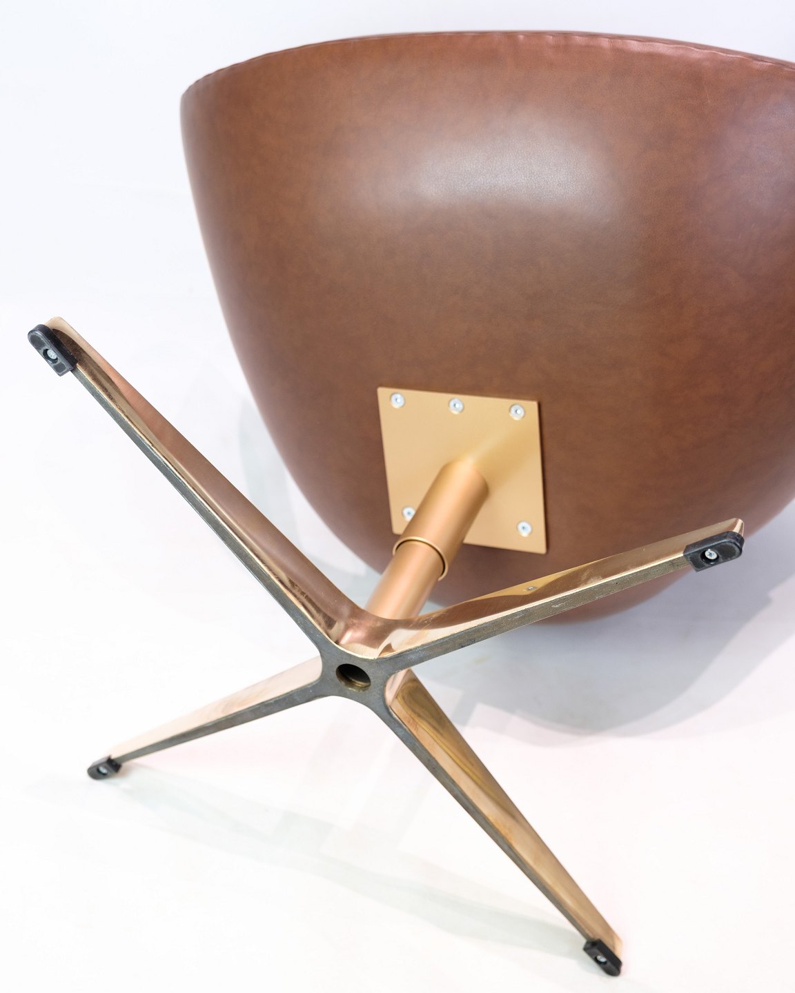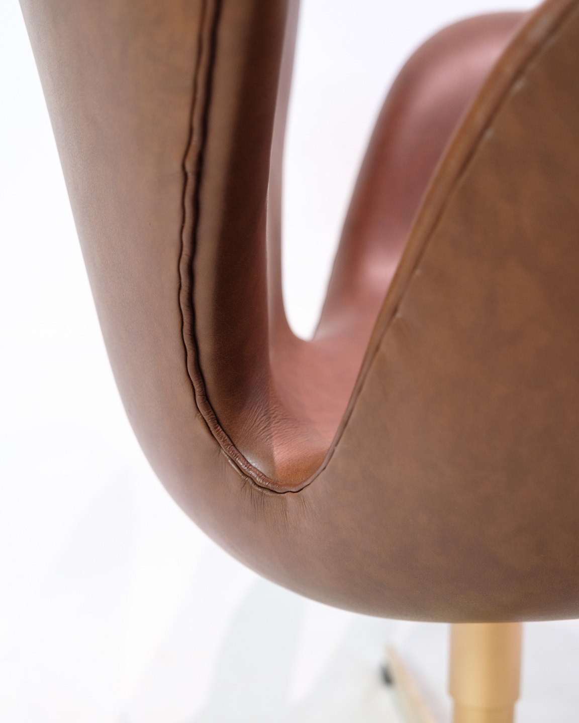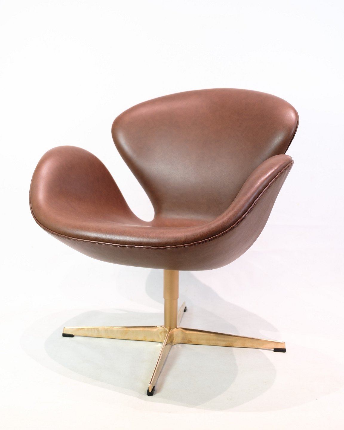 Please contact us for price informationThe Swan, model 3320 manufactured by Fritz Hansen and designed by Arne Jacobsen. It is upholstered with high quality brown leather and has an original 60th anniversary gold column. It is in very good condition.