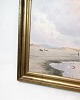 Oil painting by Alfred Theodor Olsen (1854–1932), a well-known Danish marine painter. The painting shows a calm coastal landscape with beach, sea, driftwood and a faintly visible windmill on the horizon. Signed lower right.