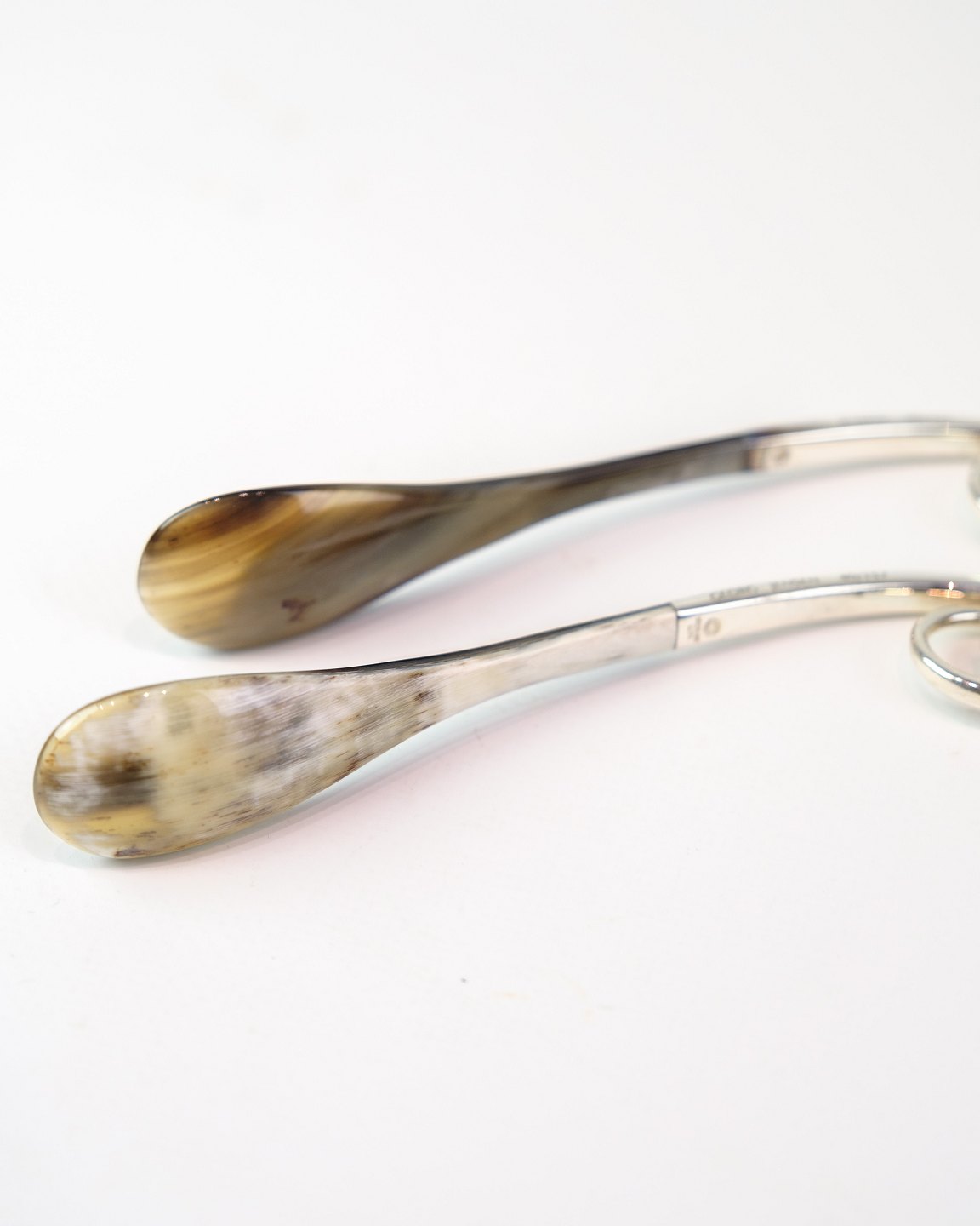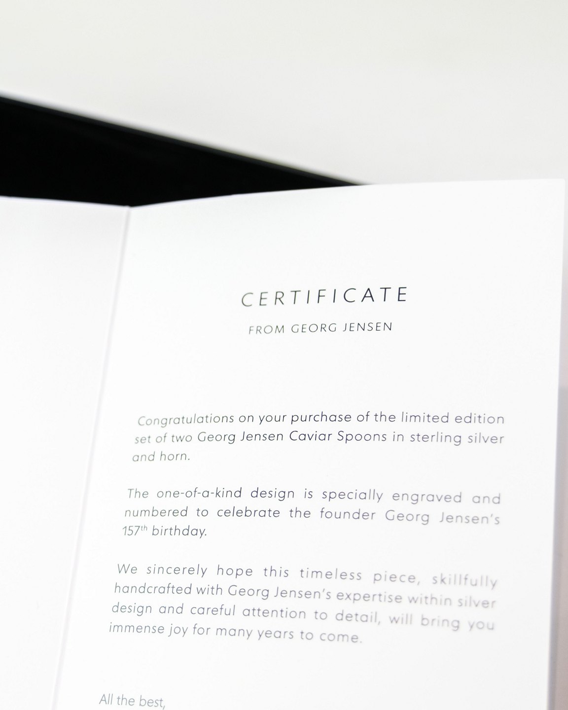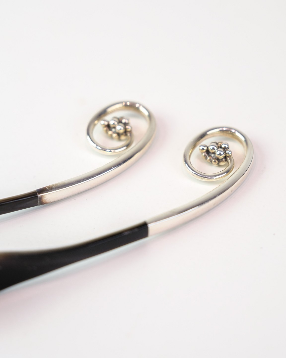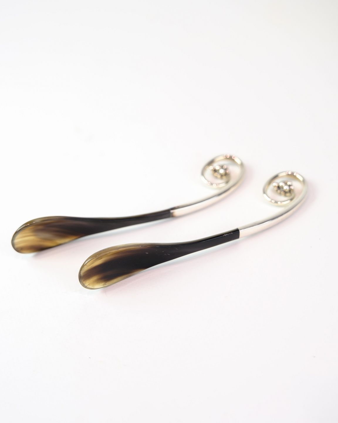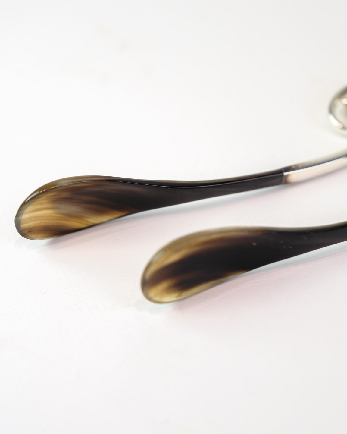 Elegant Caviar Spoon from Georg Jensen made of sterling silver. The caviar spoon is made of 925 sterling silver and horn from farmed cattle. It is handmade with care through a time-consuming process, and the sterling silver has finally been given an oxidized finish, which highlights the beautiful handmade details. As horn is a natural material, variations in appearance may occur, and therefore no two spoons are the same.