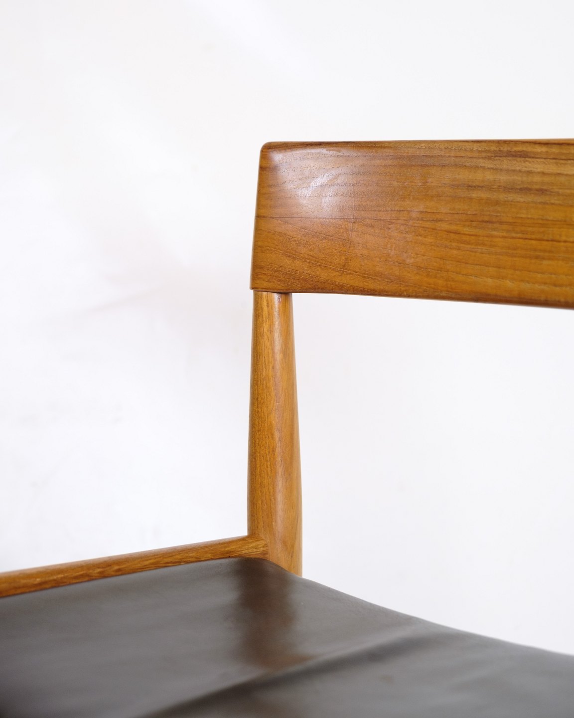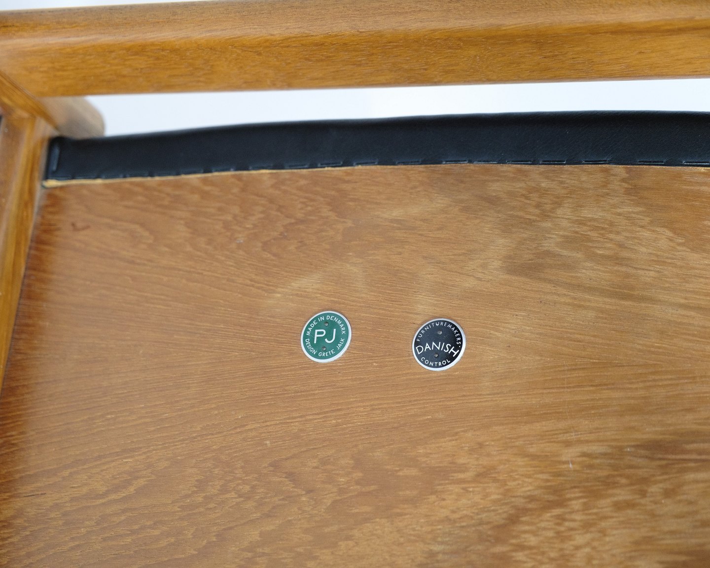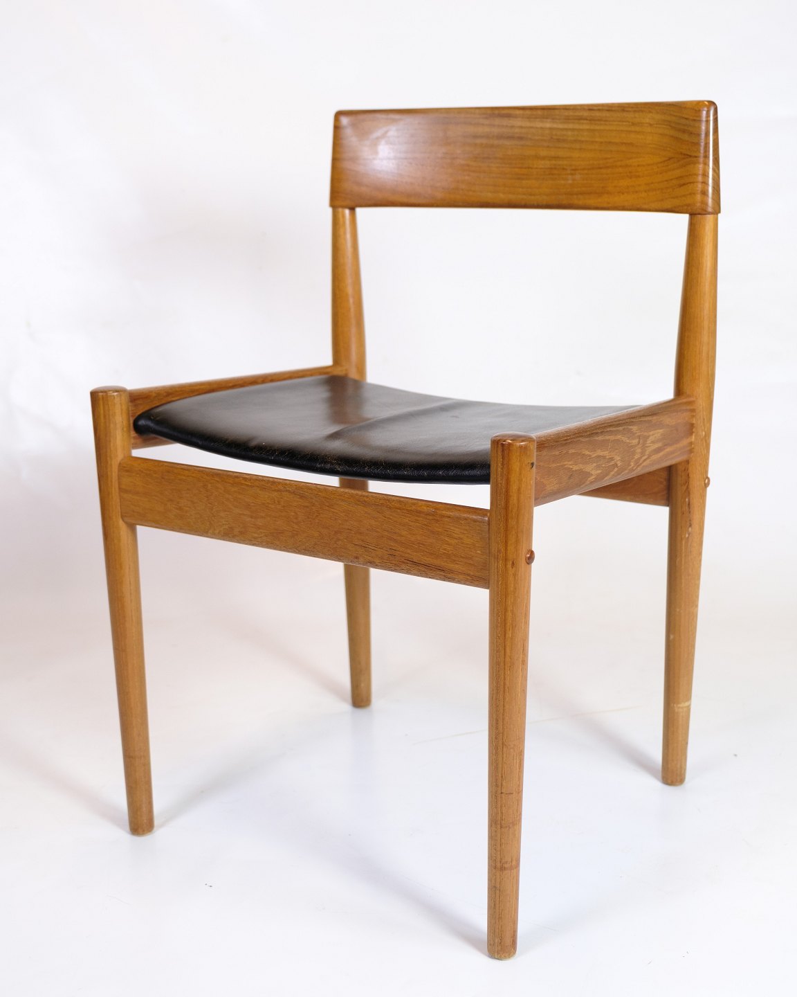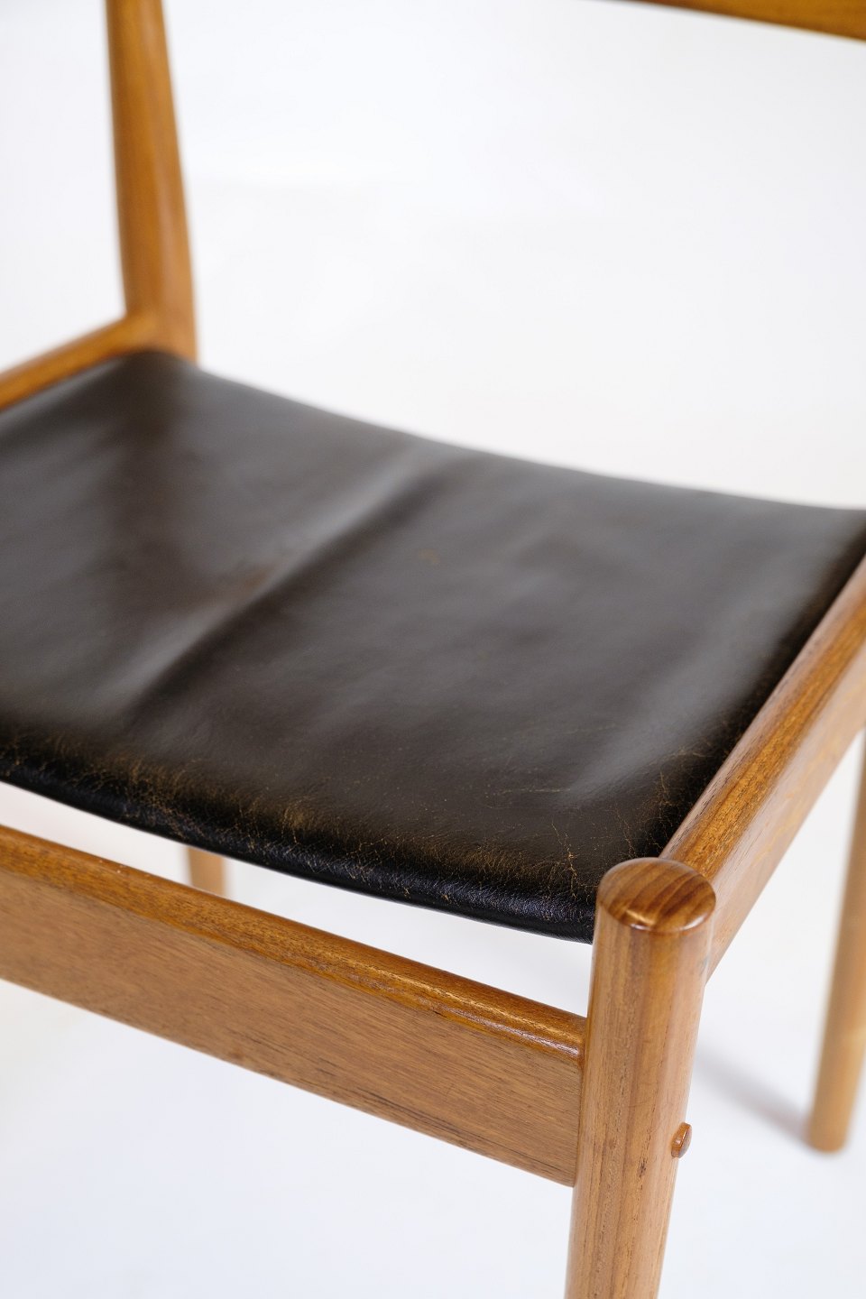 Set of six dining chairs made of teak with seats in original upholstered black leather. The chair is designed by Grete Jalk and produced by Poul Jeppesen. The chair was given the model number P J 3-2. The chairs are from the 1960s and are in great condition with age-related patina on the seats.