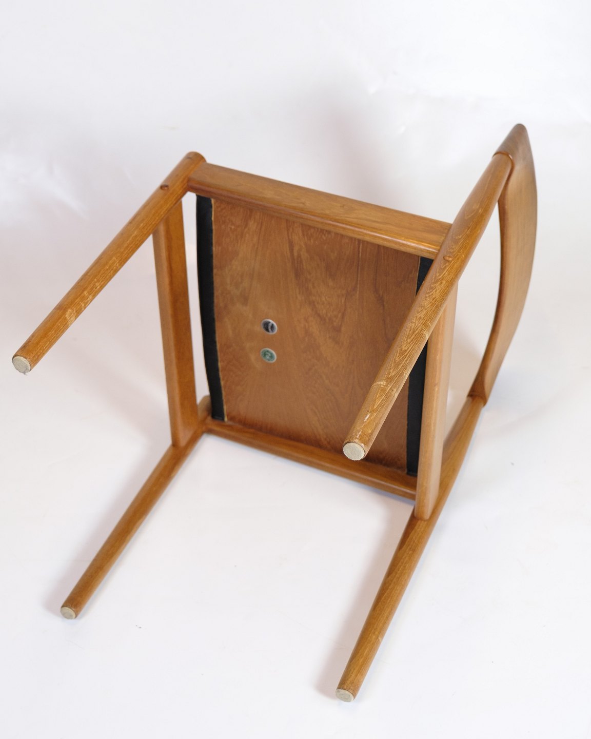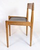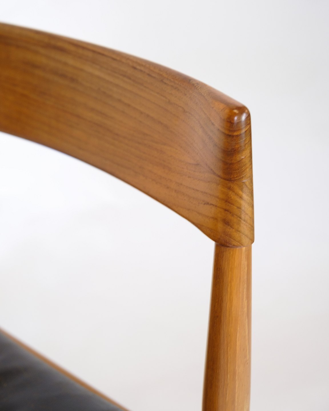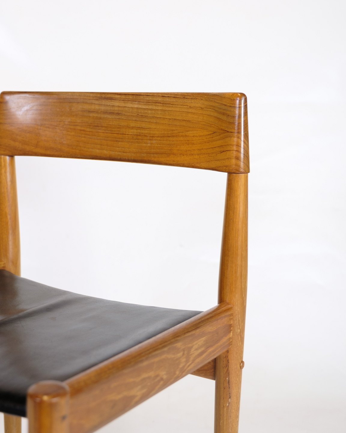 Set of six dining chairs made of teak with seats in original upholstered black leather. The chair is designed by Grete Jalk and produced by Poul Jeppesen. The chair was given the model number P J 3-2. The chairs are from the 1960s and are in great condition with age-related patina on the seats.