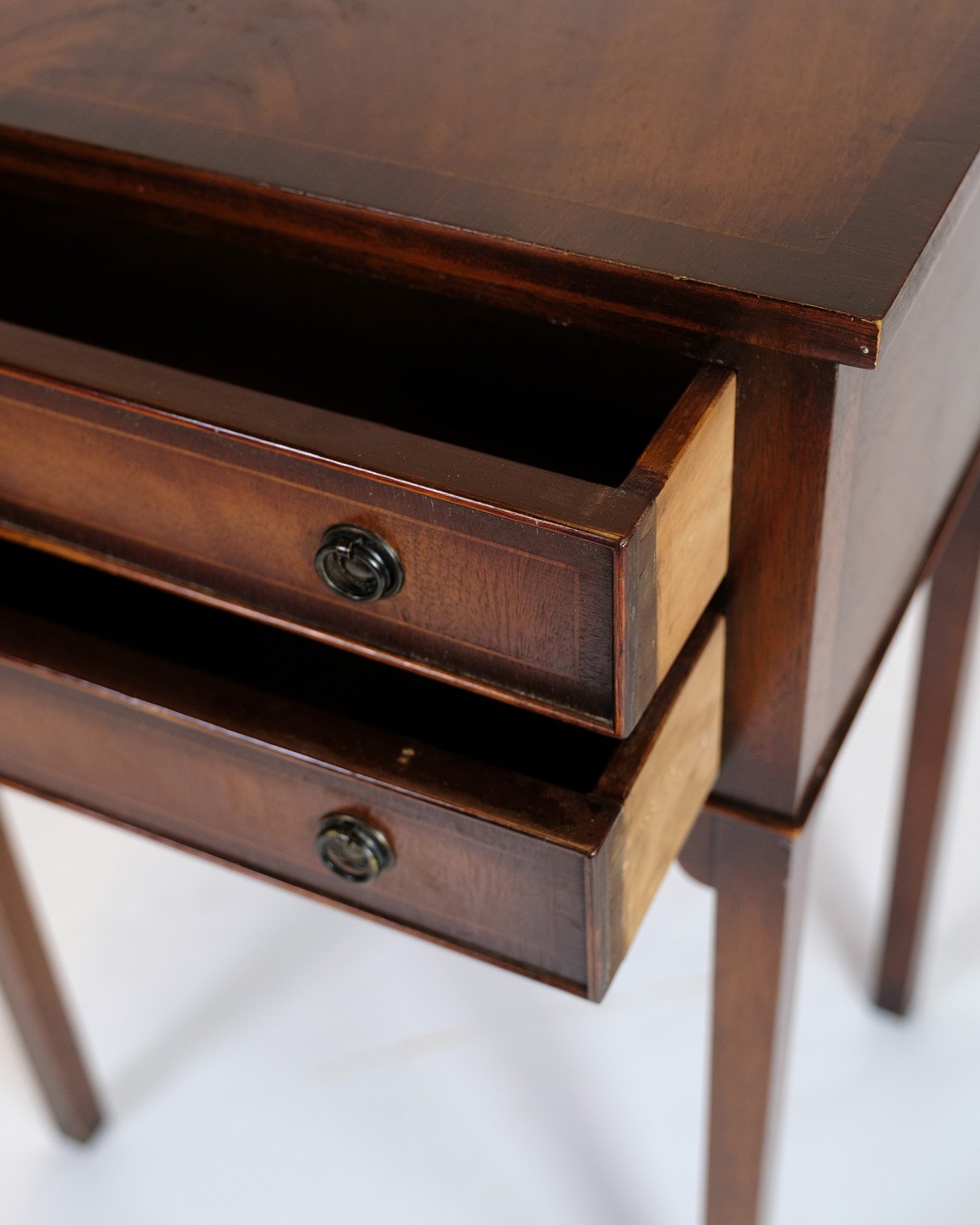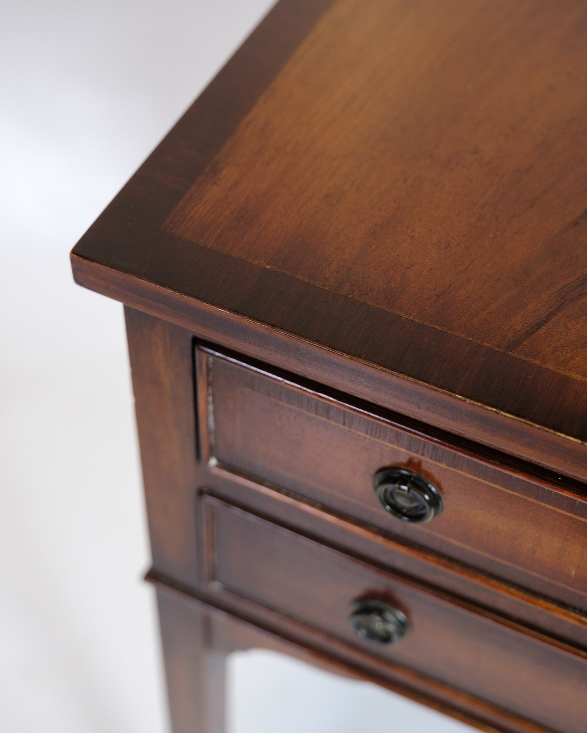 Antikt sidebord i mahogni med 2 skuffer og originale messinggreb, ca. 1940.