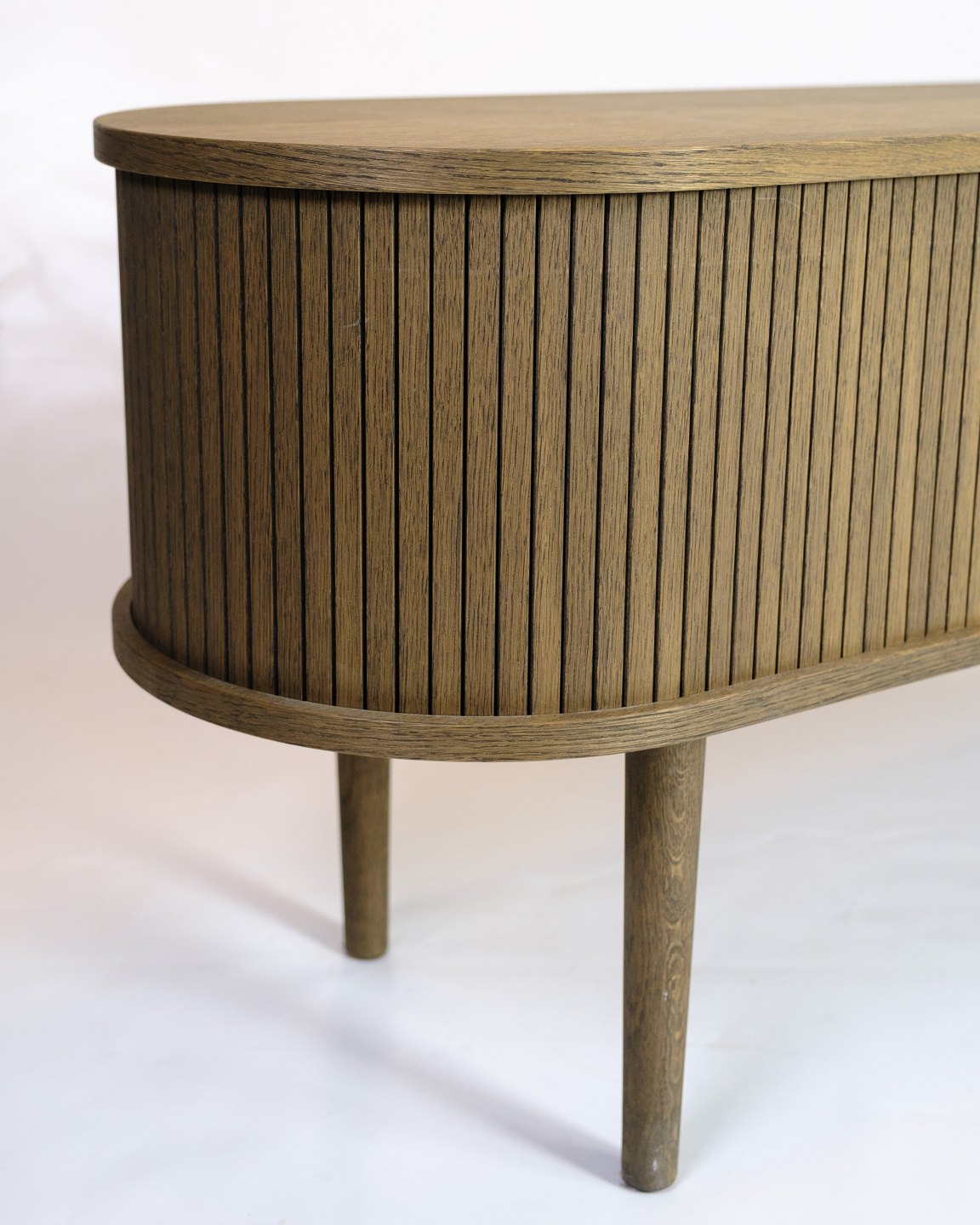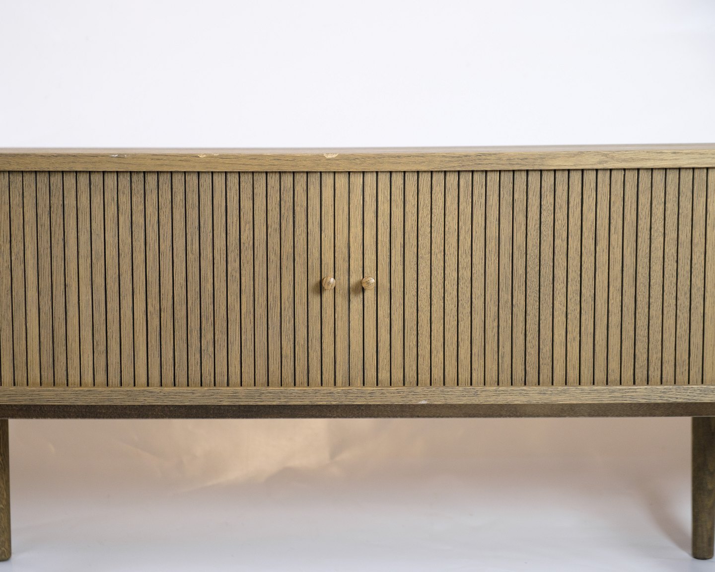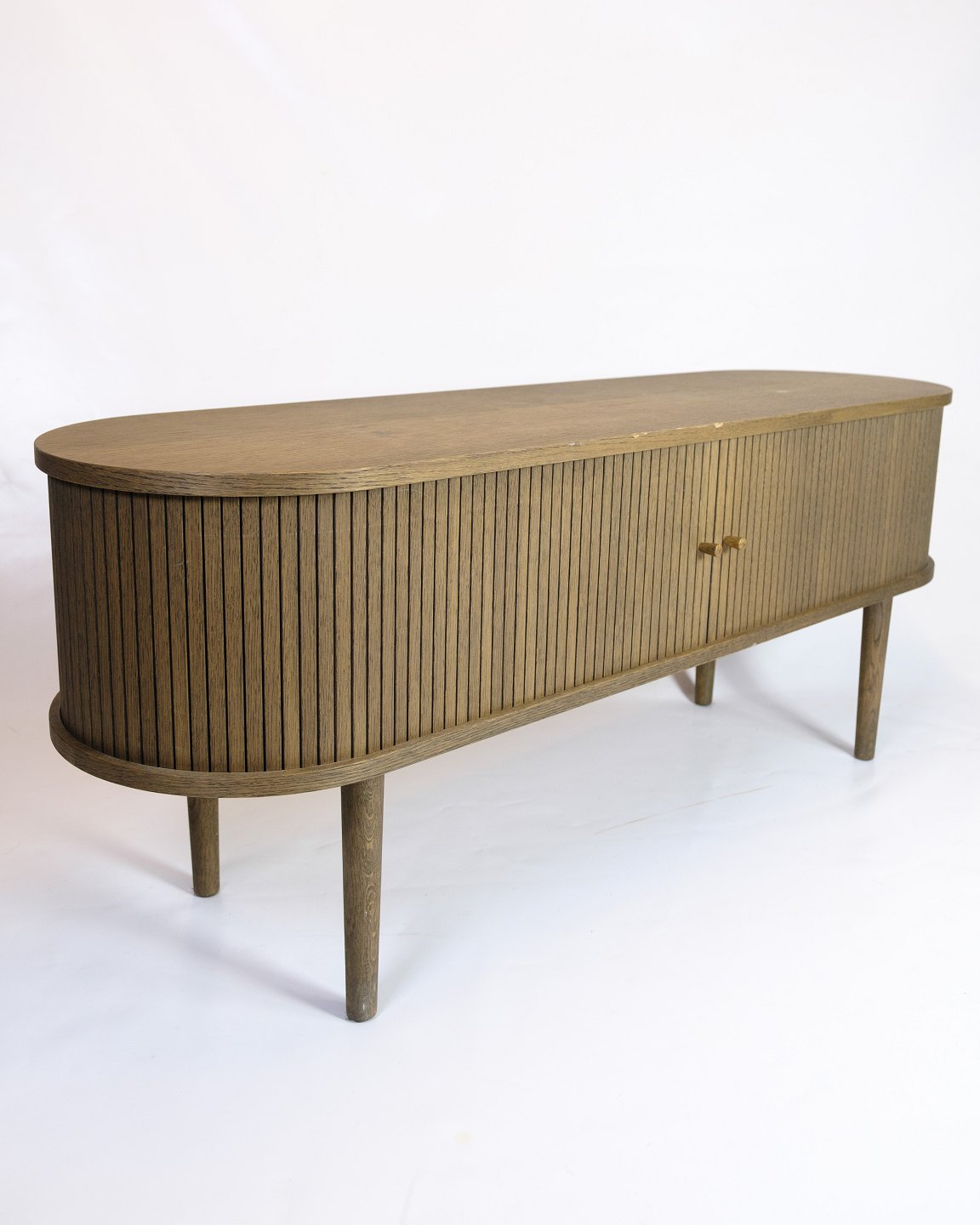 SolgtTV-møbel i gråolieret eg med jalousilåger og rundede former. Dansk design.