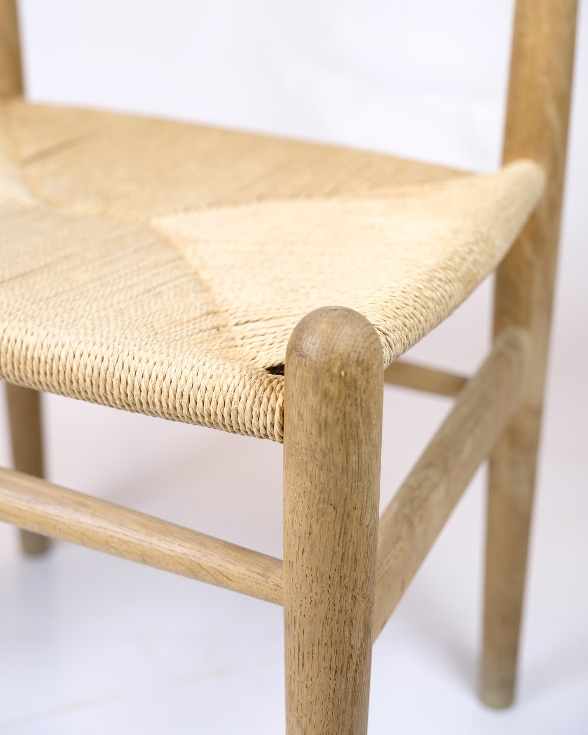 The chair is made of solid oak with a seat in hand-woven paper yarn.