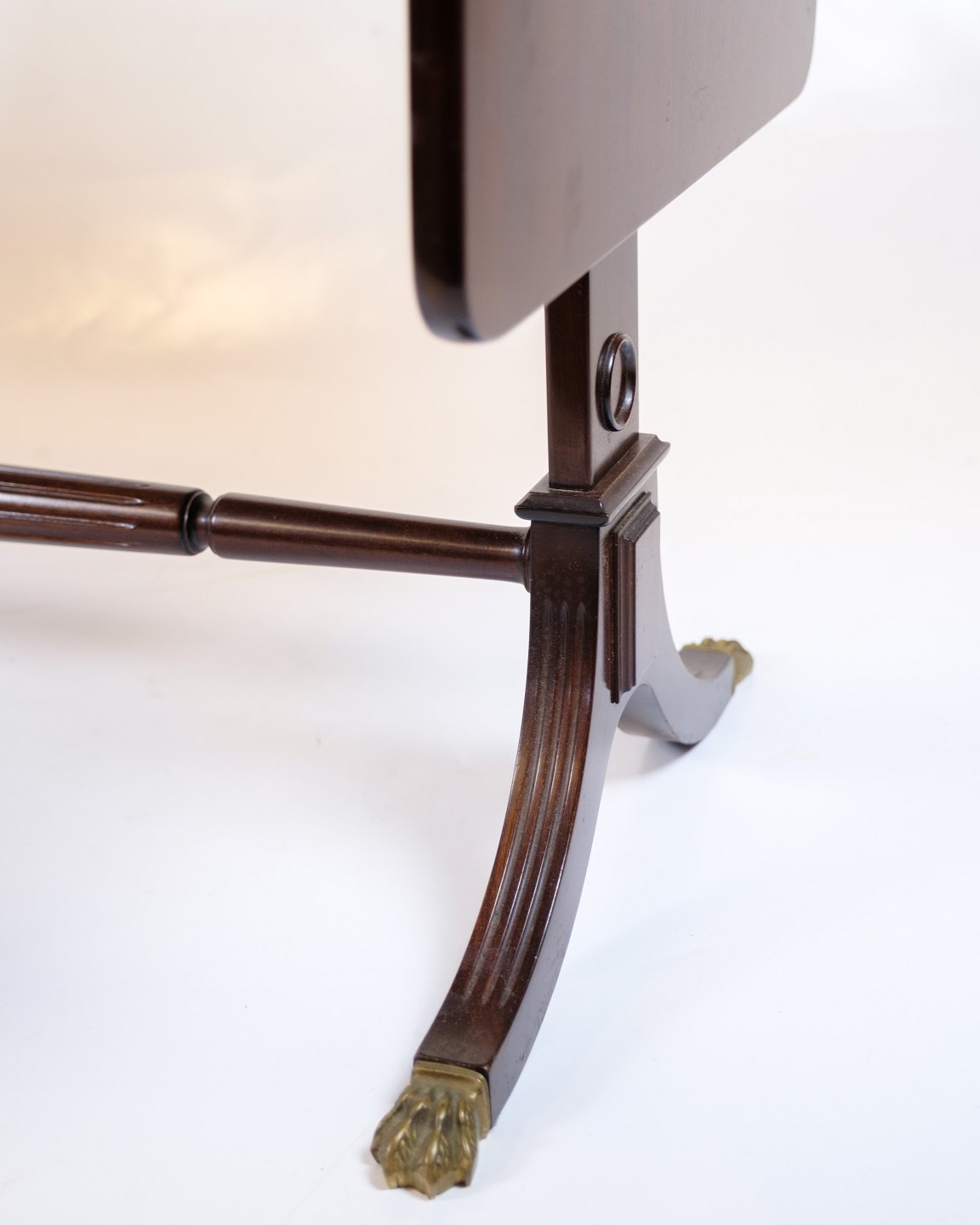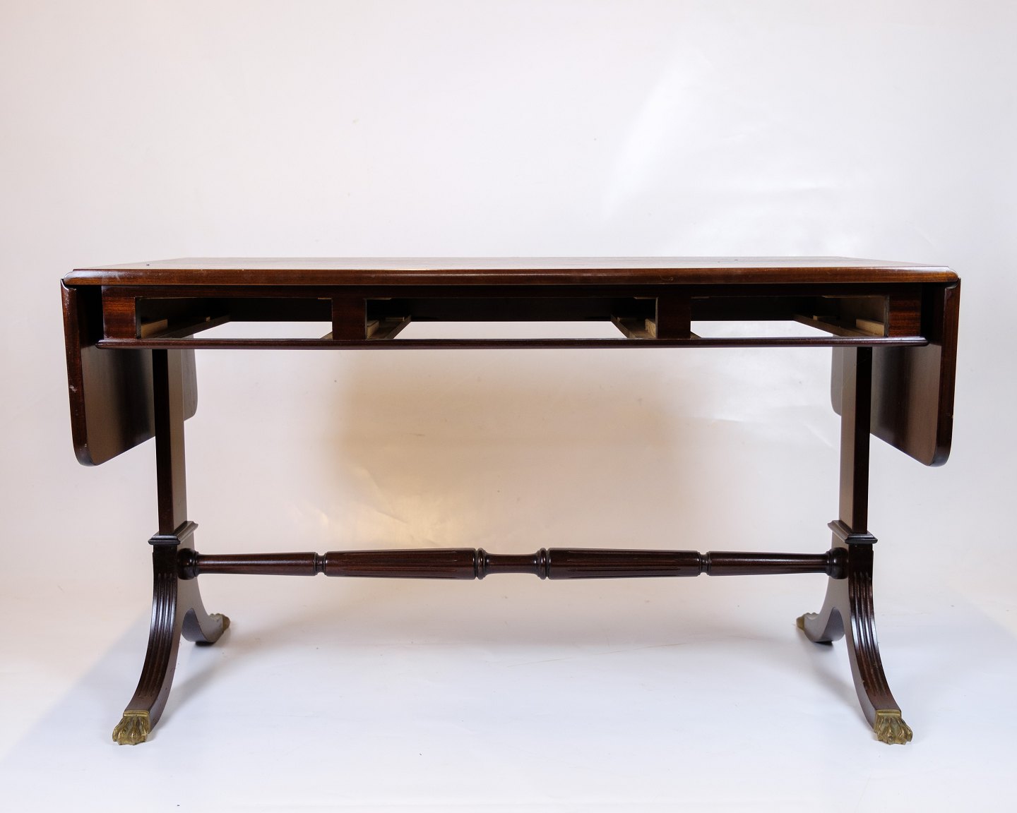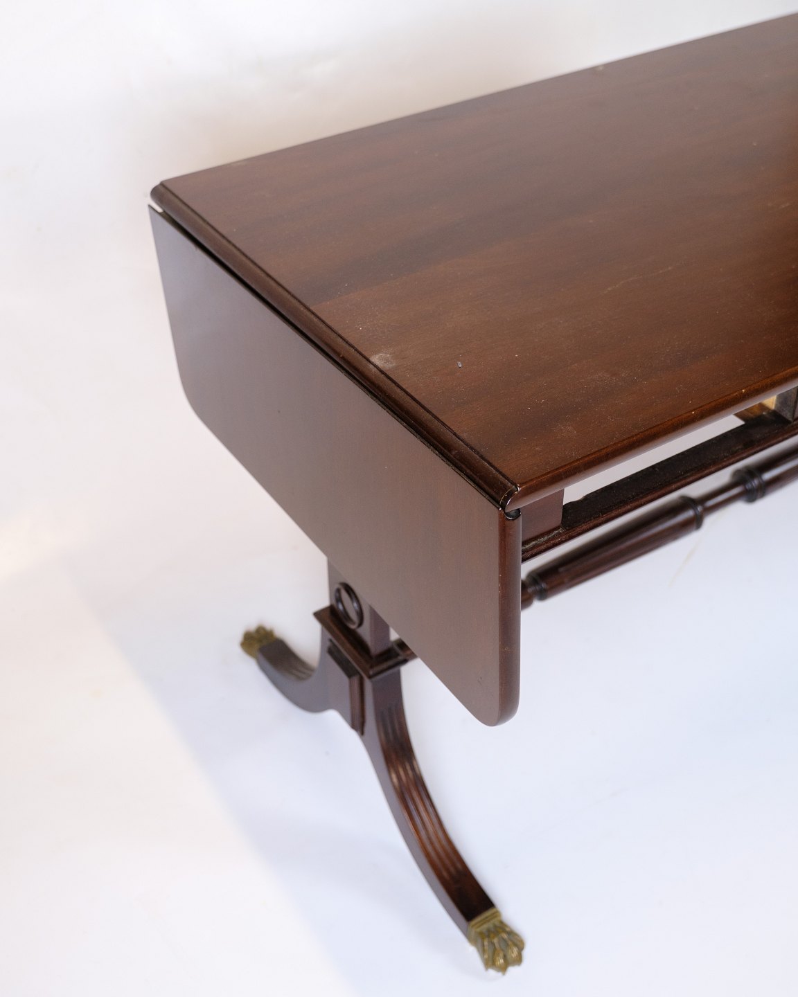Sofabord i mahogni fra 1960’erne udført i stil af Hepplewhite. Bordet har klapper i begge sider, som kan foldes op for at udvide bordpladen, hvilket giver både fleksibilitet og funktionalitet.