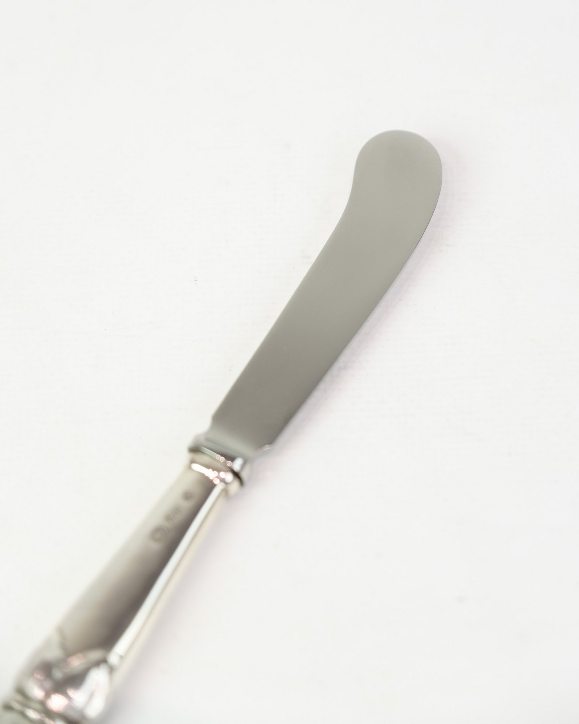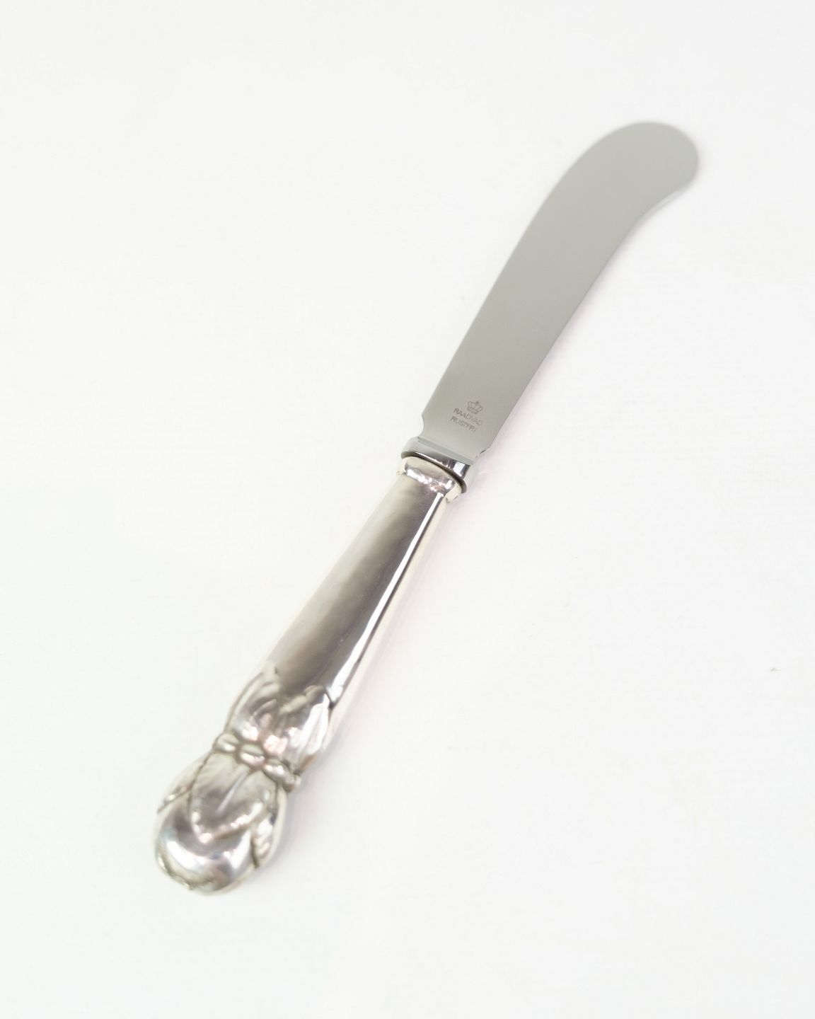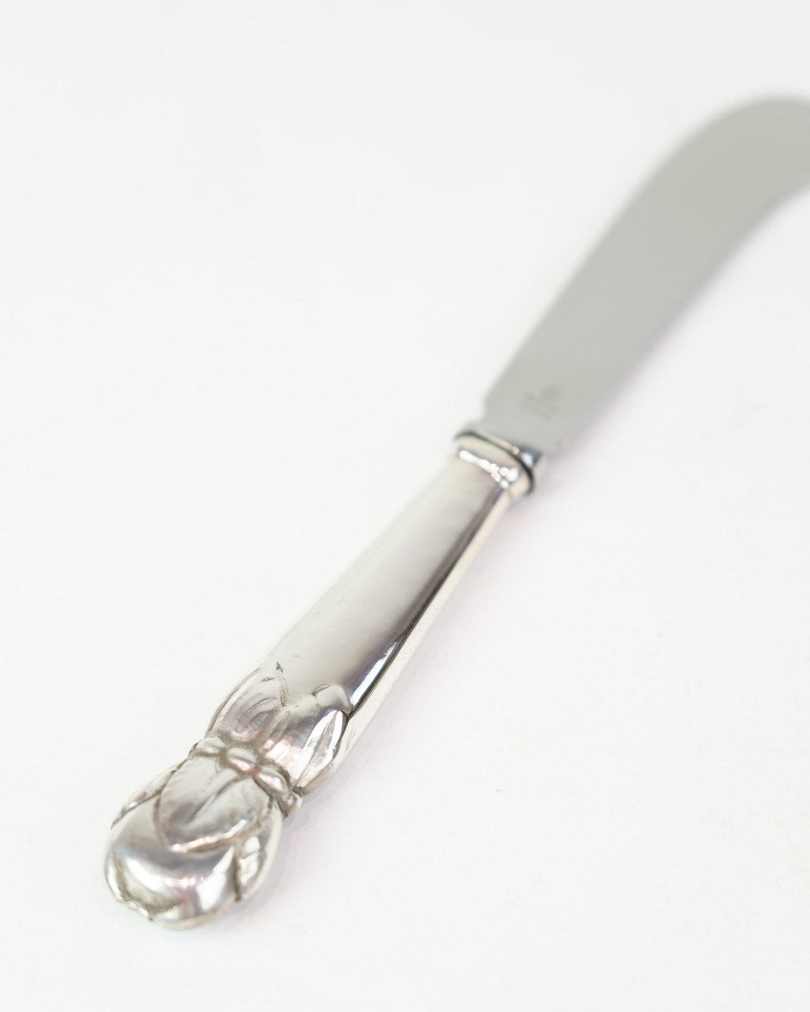 Smørkniv i tretårnet sølv stemplet 825 fra A.C. Illum, København. Fremstillet ca. midt 1900-tallet. Længde 17 cm. Elegant dansk sølvdesign.