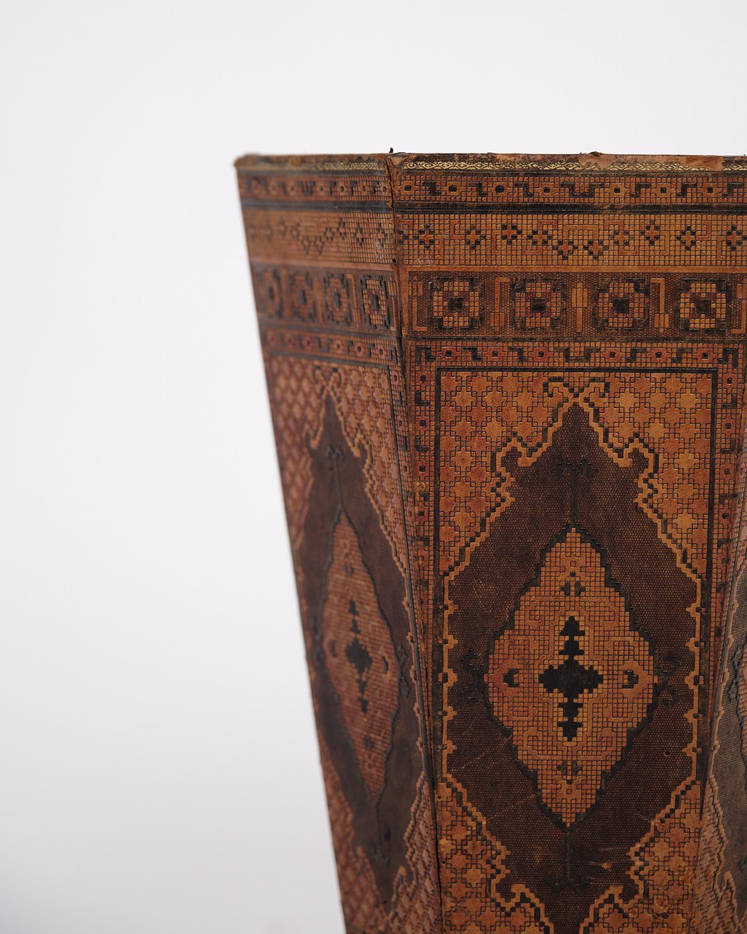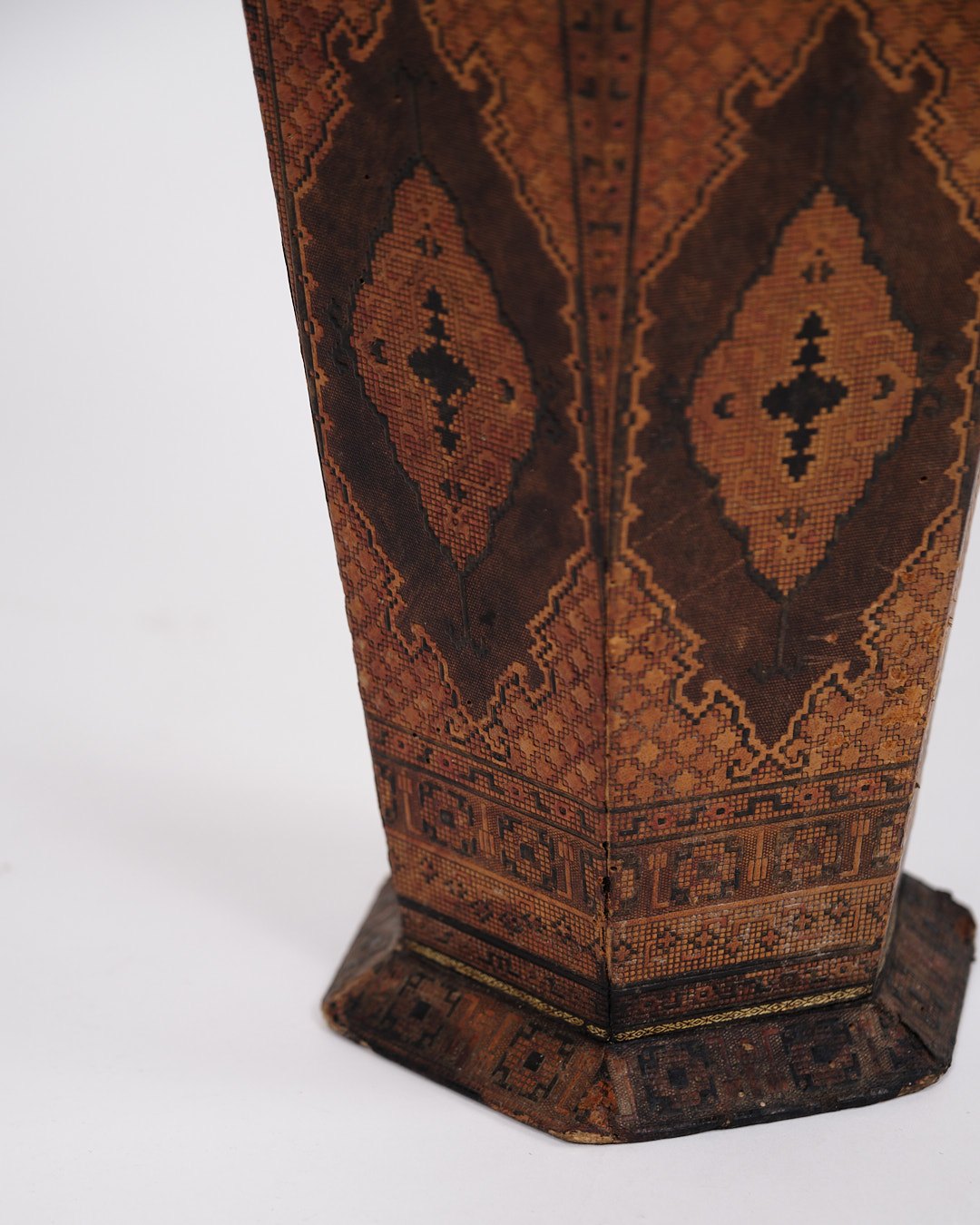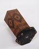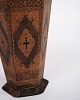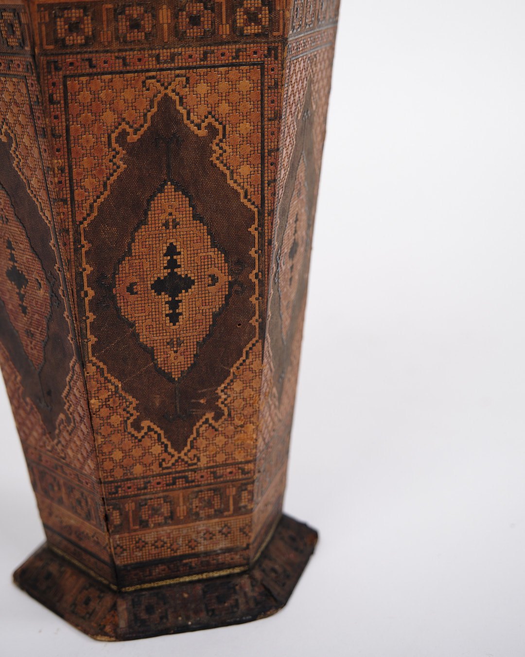 Dekorativ vase fra 1900-tallet, udført i mørkt træ med smukt orientalsk inspireret intarsia.