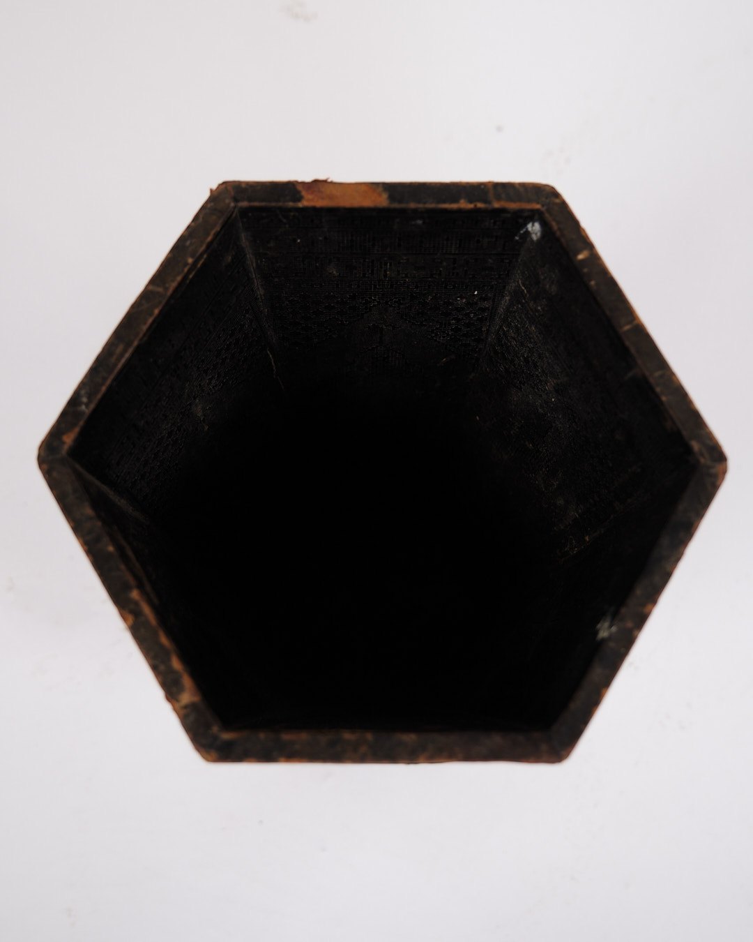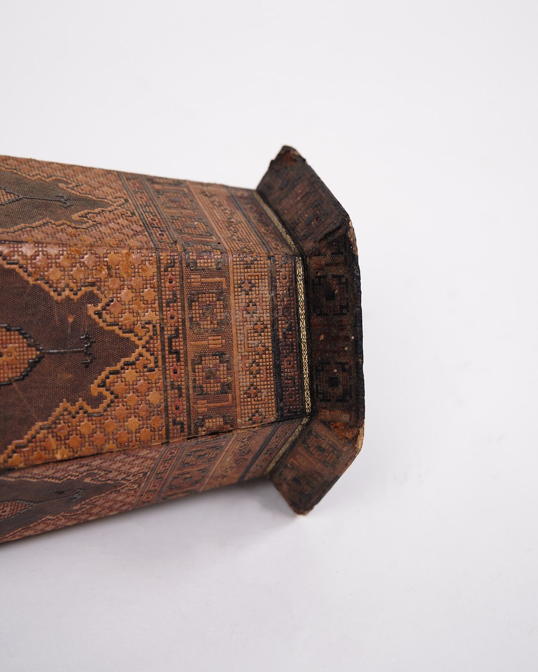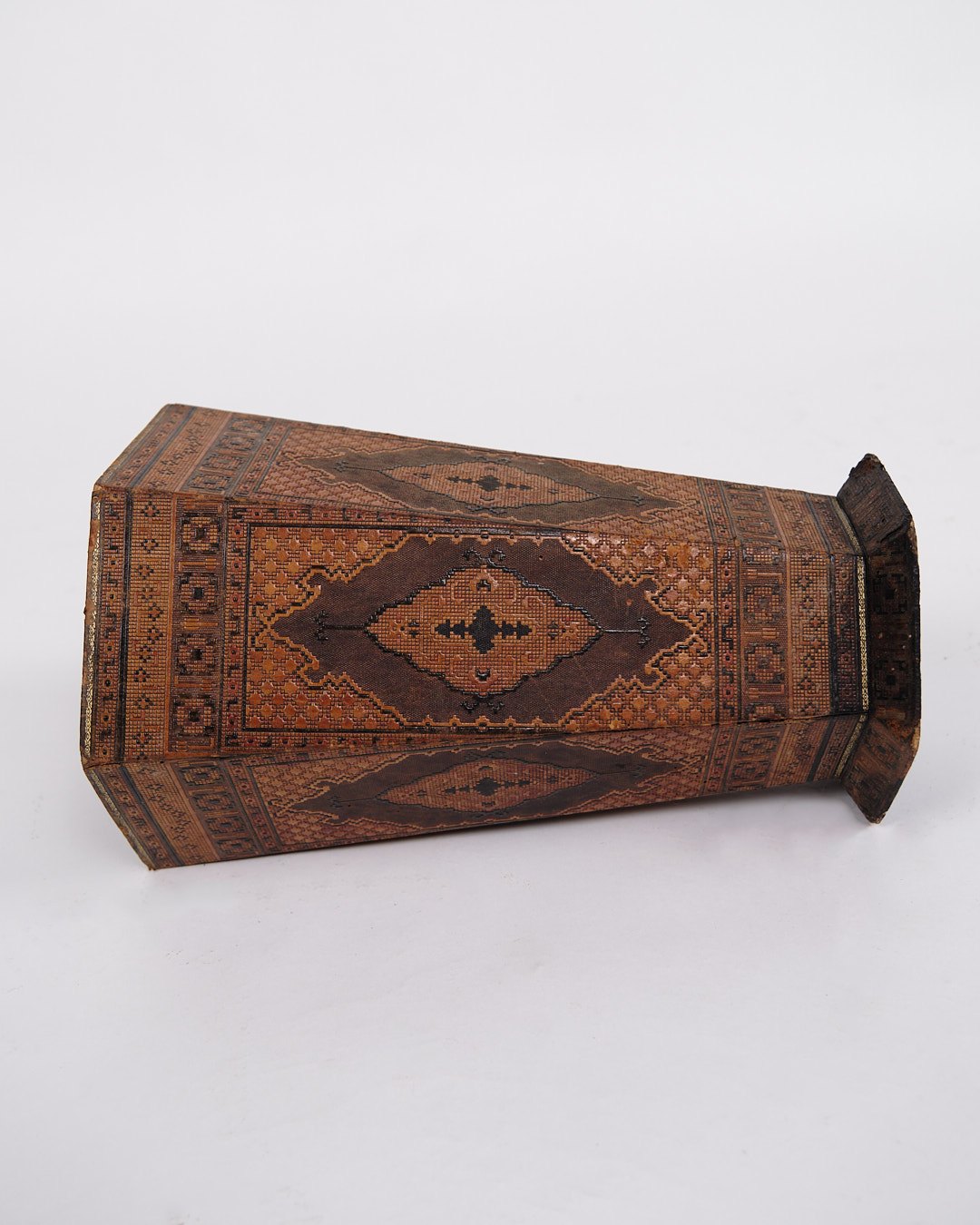 Dekorativ vase fra 1900-tallet, udført i mørkt træ med smukt orientalsk inspireret intarsia.