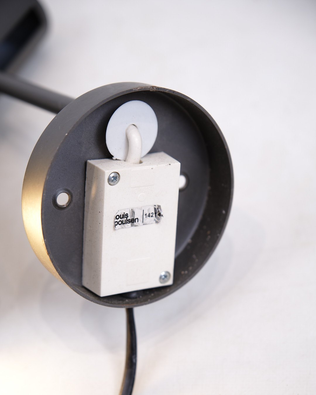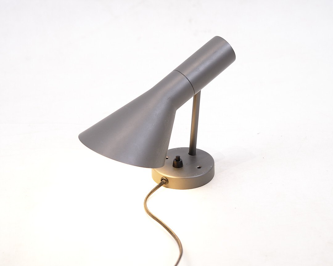 Sæt af to AJ væglamper i lys grå, designet af Arne Jacobsen i 1960’erne og produceret af Louis Poulsen. Lamperne er udført i pulverlakeret stål og har det karakteristiske skærmformede design, der giver både direkte og retningsbestemt lys.