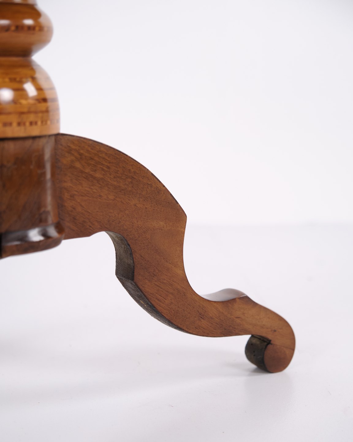 Octagonal column table from Italy, dated to the 1850s. The table is richly decorated with hand-laid intarsia, which emphasizes the geometric shapes and the overall decorative expression.