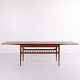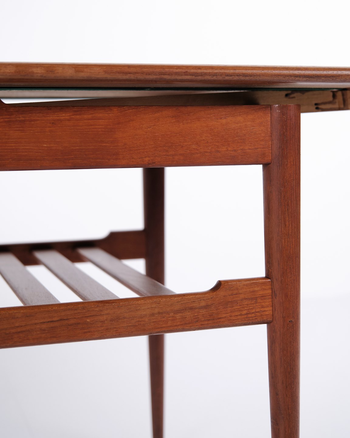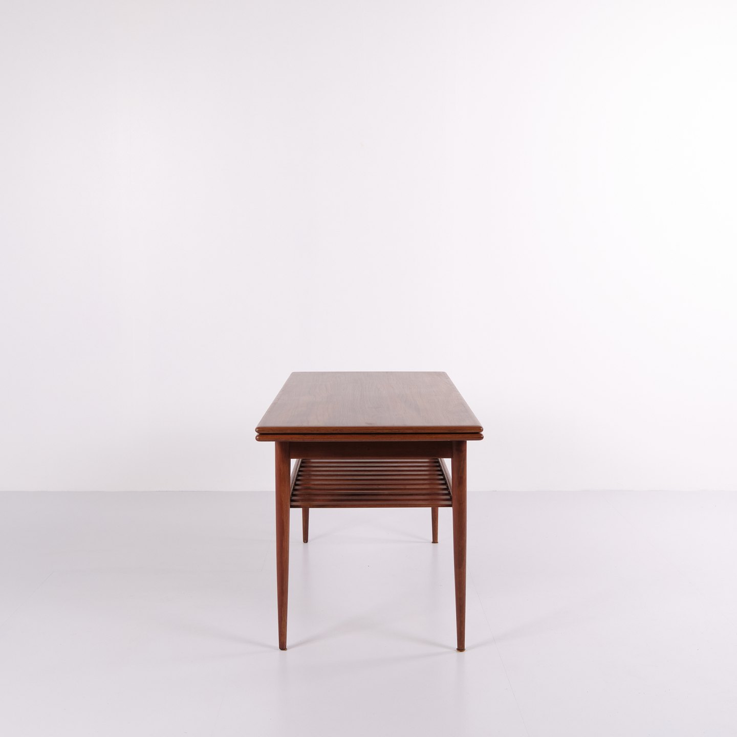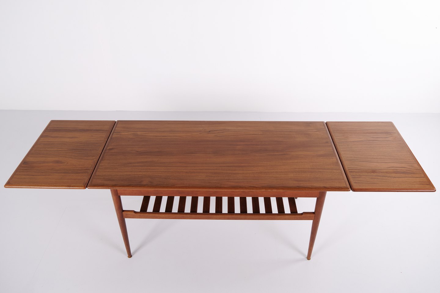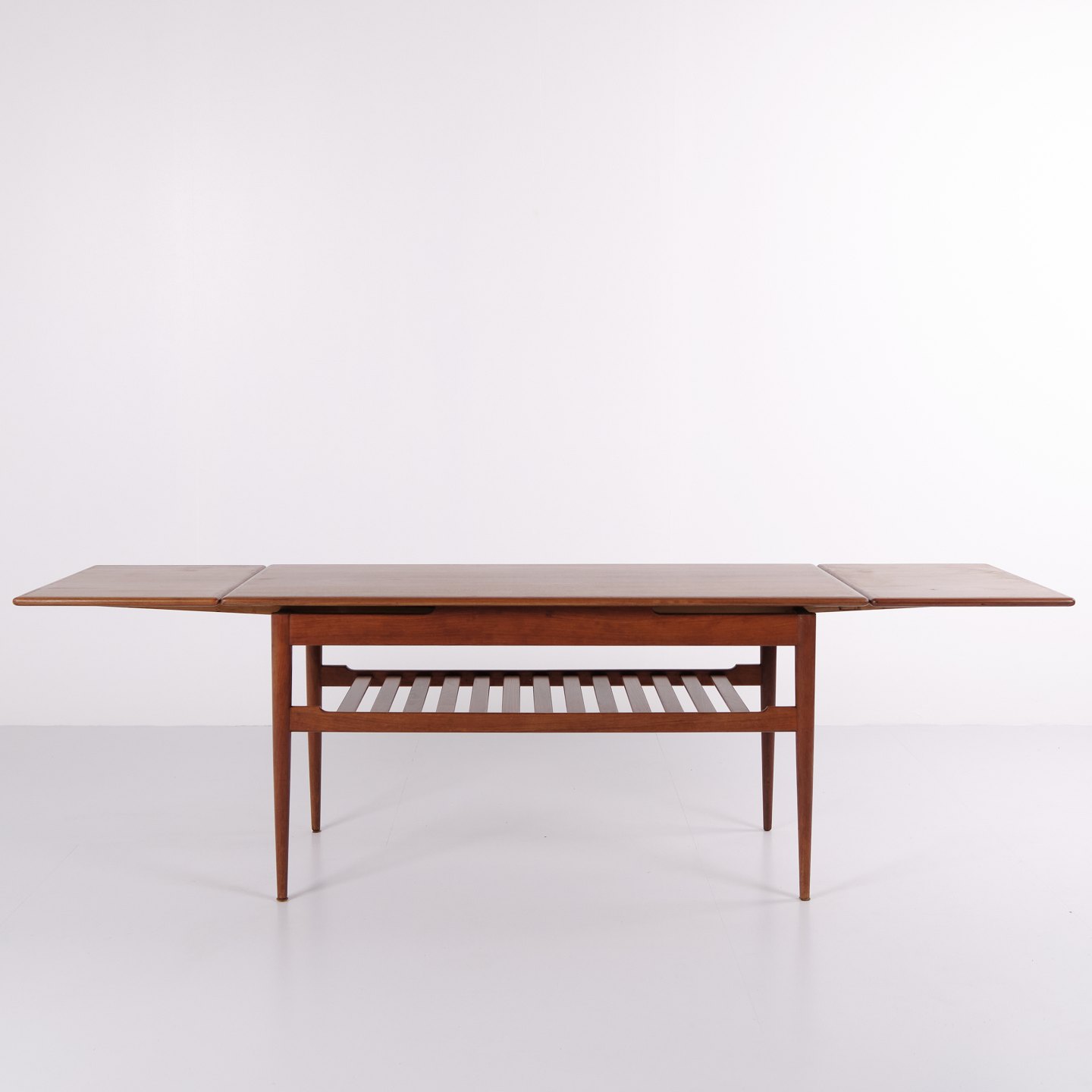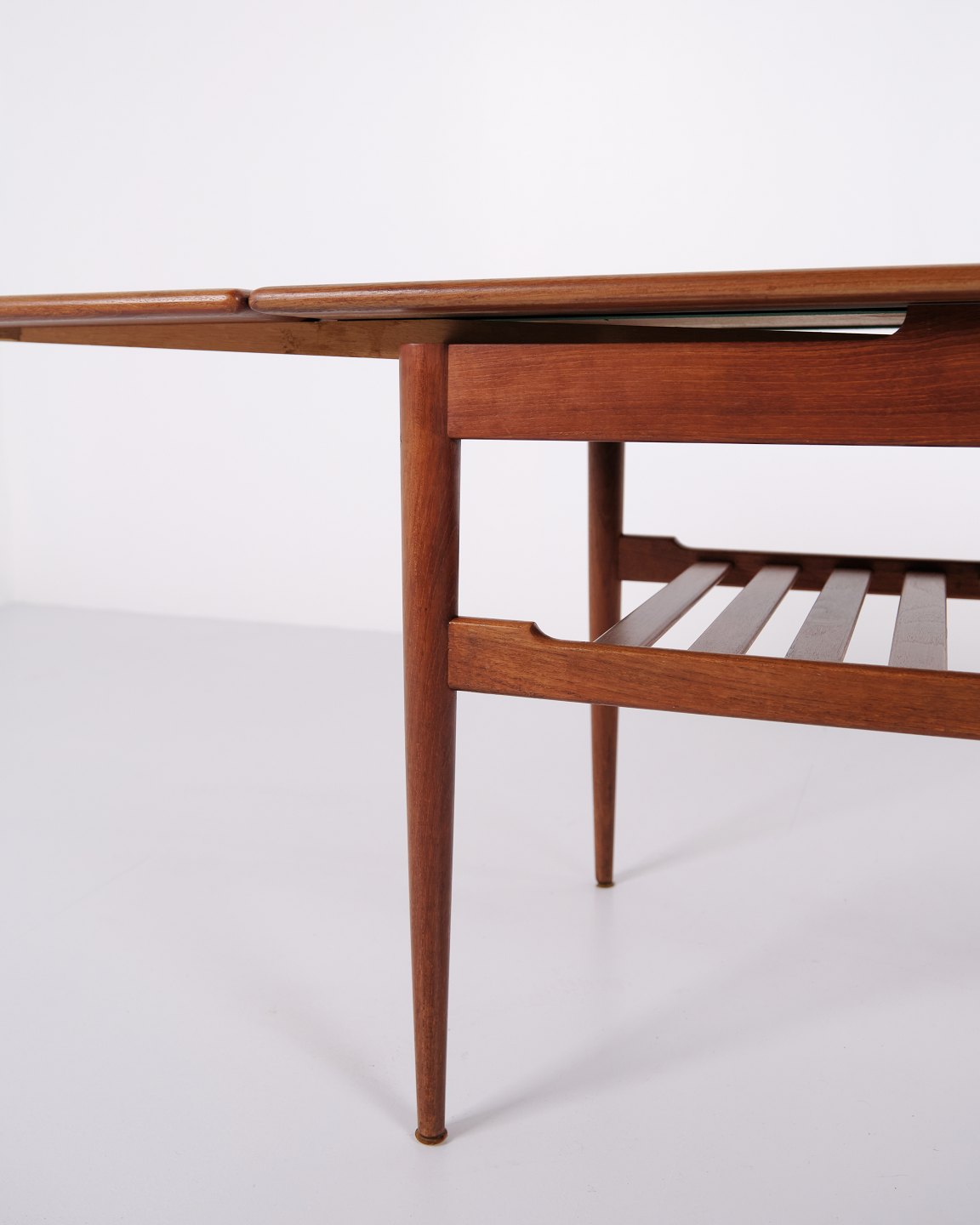 Coffee table from the 1960s, made of teak with a practical shelf and pull-out, providing extra table space as needed.