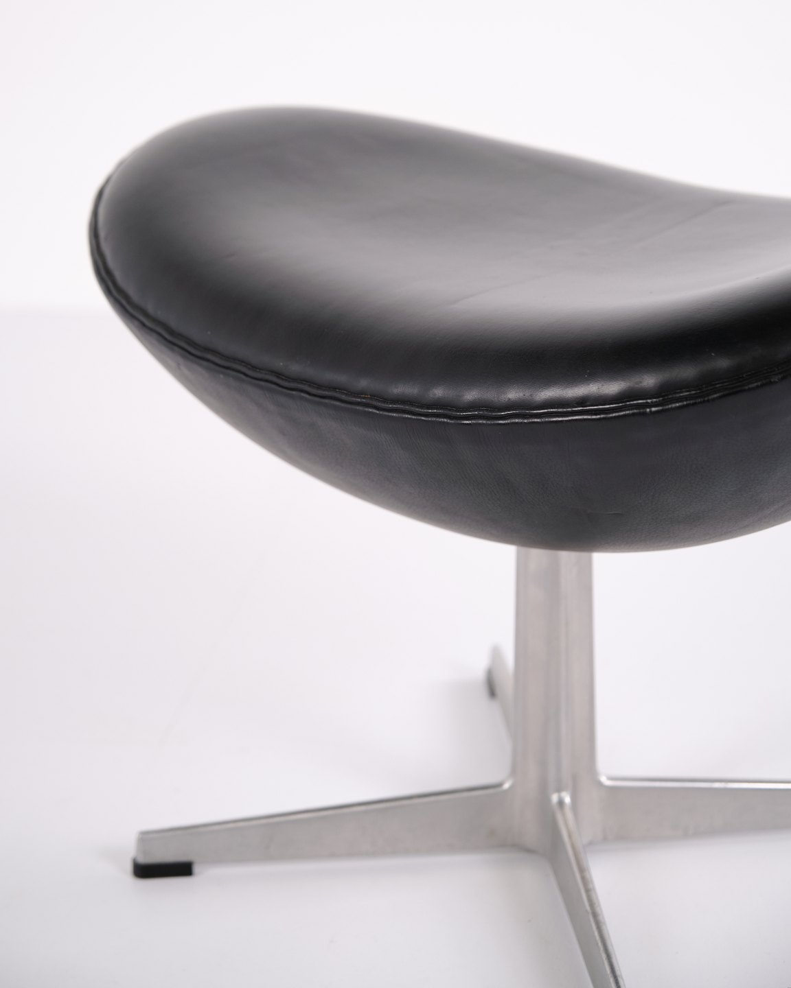 Stool for the Egg Chair, designed by Arne Jacobsen and produced by Fritz Hansen in 2006. Upholstered in black Elegance leather and fitted with an aluminium star base. High-quality materials and craftsmanship consistent with Fritz Hansen’s production standards.