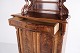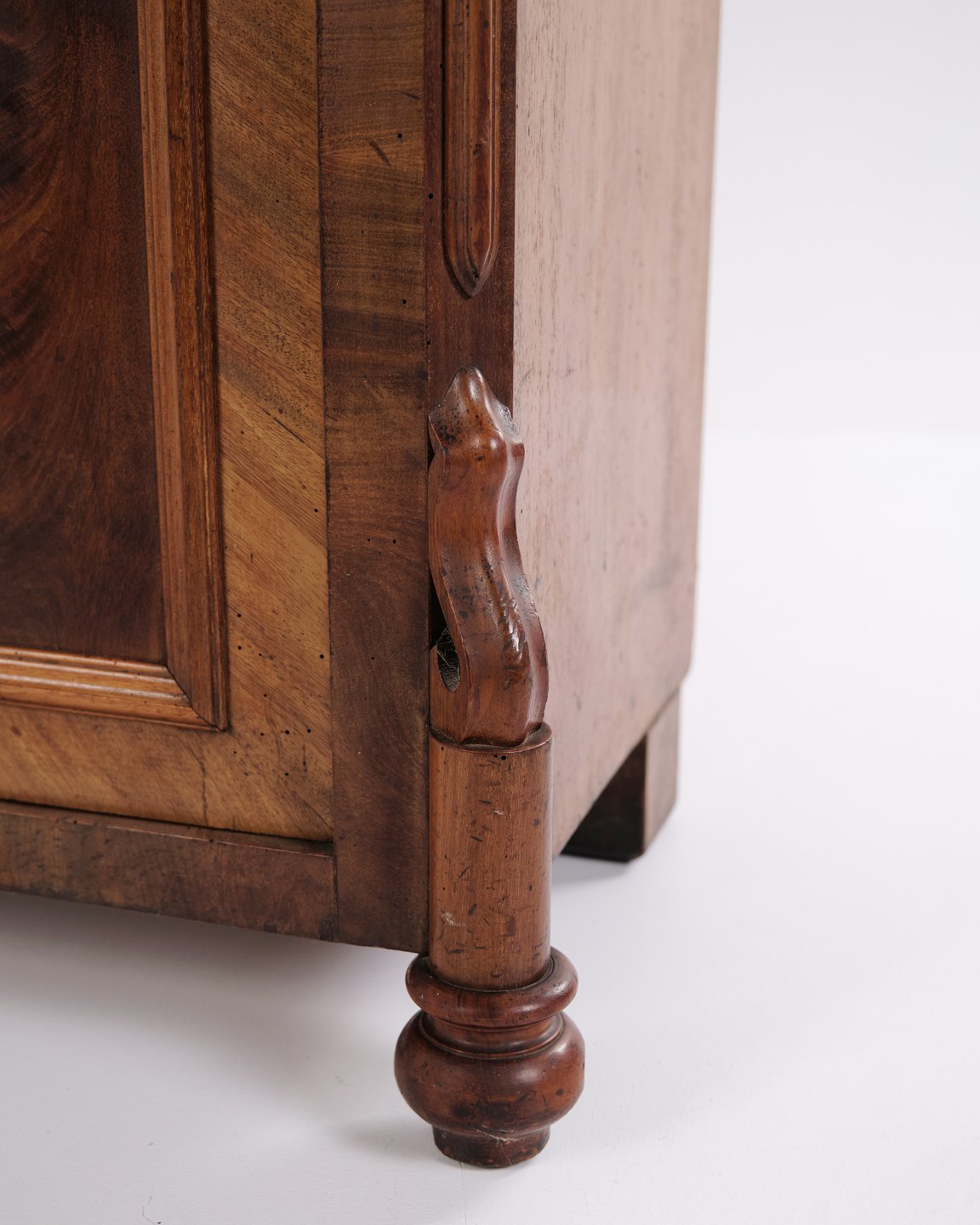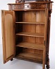 Antique mahogany cabinet from the 1880s with decorative carvings. Features doors and interior shelves, suitable for storage in living rooms, hallways or dining areas.