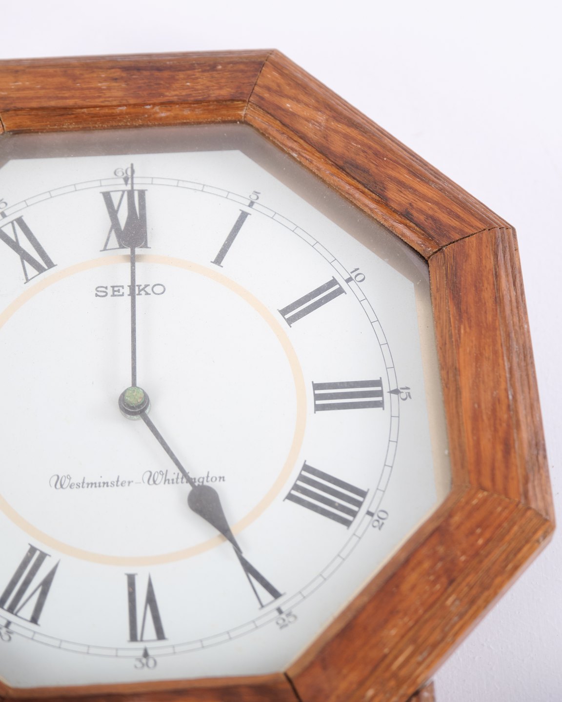 Wall clock by Seiko featuring Westminster and Whittington chime melodies. Crafted in oak with a classic front and clear dial. A quality clock with precise movement and a timeless appearance.