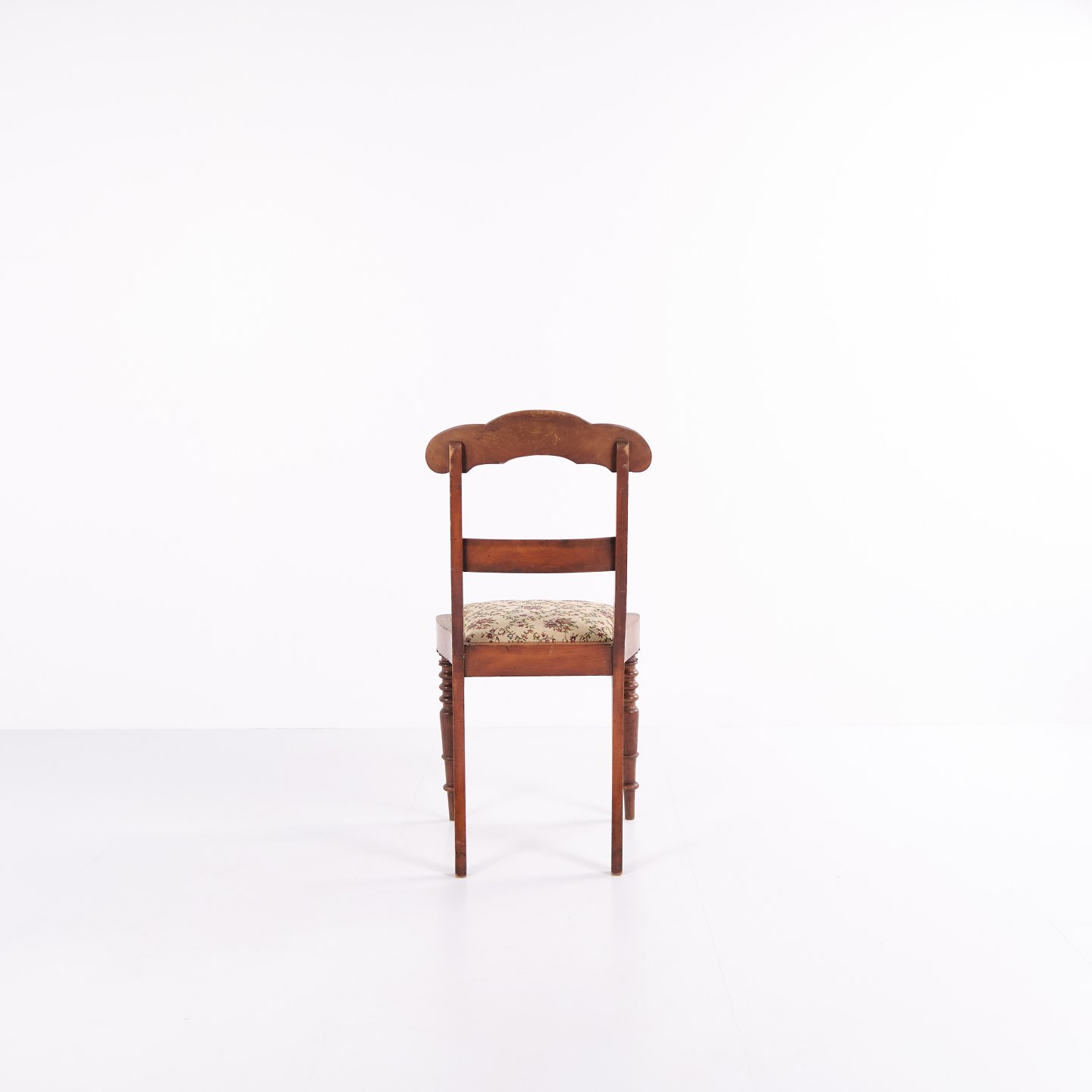 Dining or hall chair in late Empire style, crafted in mahogany and upholstered in floral fabric. Classic design with period-typical lines and a gently curved back. A decorative chair suitable for both dining spaces and hallways.