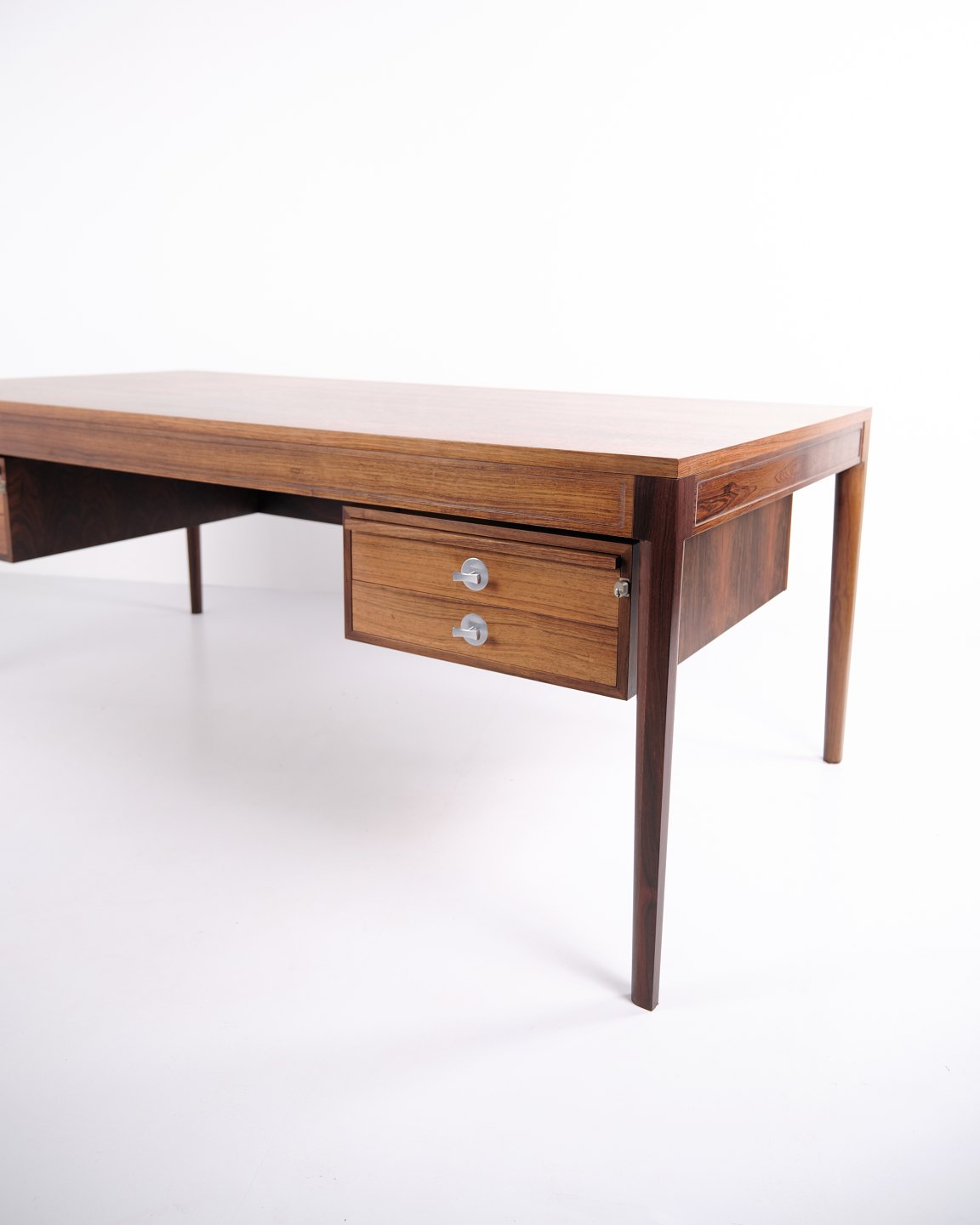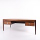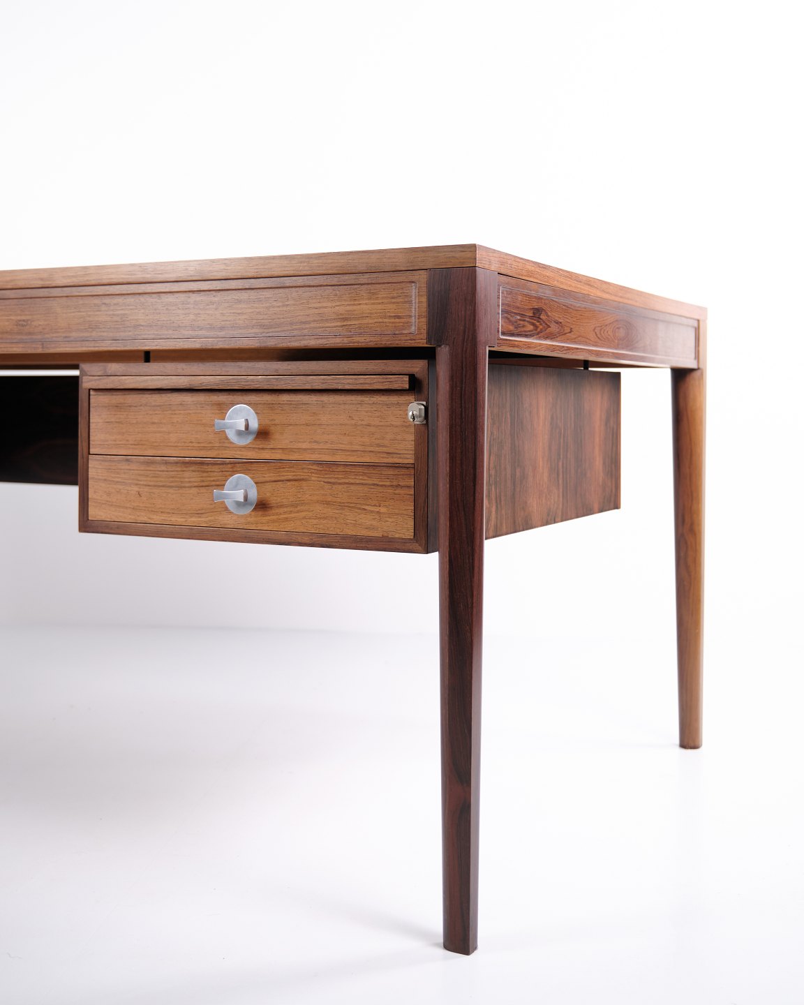Diplomat desk designed by Finn Juhl for France & Søn around 1961. Made in rosewood with a rectangular top and two suspended drawer units. Each unit includes an extending writing surface and two drawers with brushed steel handles. A highly sought-after Finn Juhl design with distinctive lines and premium materials.