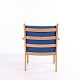 Lounge chair model GE 284 designed by Hans J. Wegner and produced by Getama. Made with a solid oak frame and loose cushions upholstered in blue wool. A classic Wegner design offering comfort and a compact form suitable for both modern and traditional interiors.