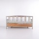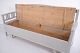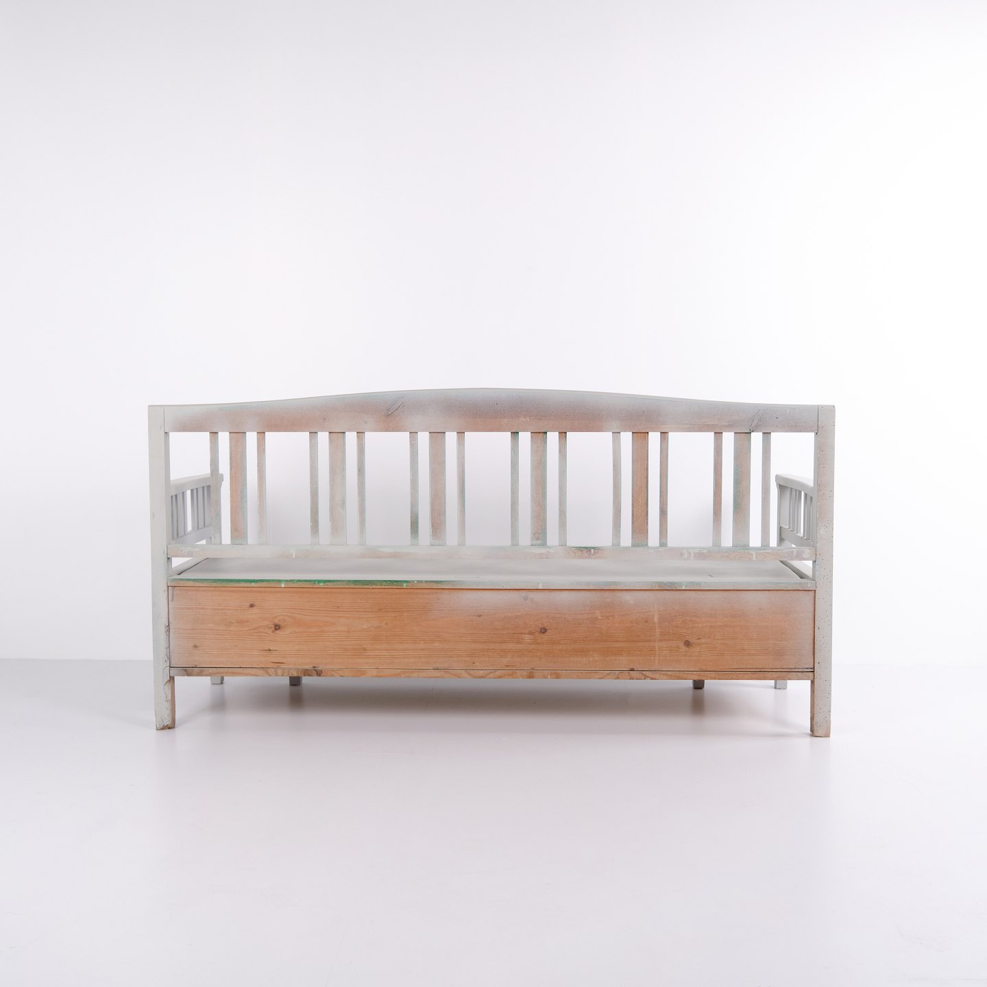Swedish bench from the 1860s, made in pine and later painted grey. A classic Scandinavian piece with decorative painted details and practical storage beneath the seat. Well-preserved antique furniture with characteristic period features.