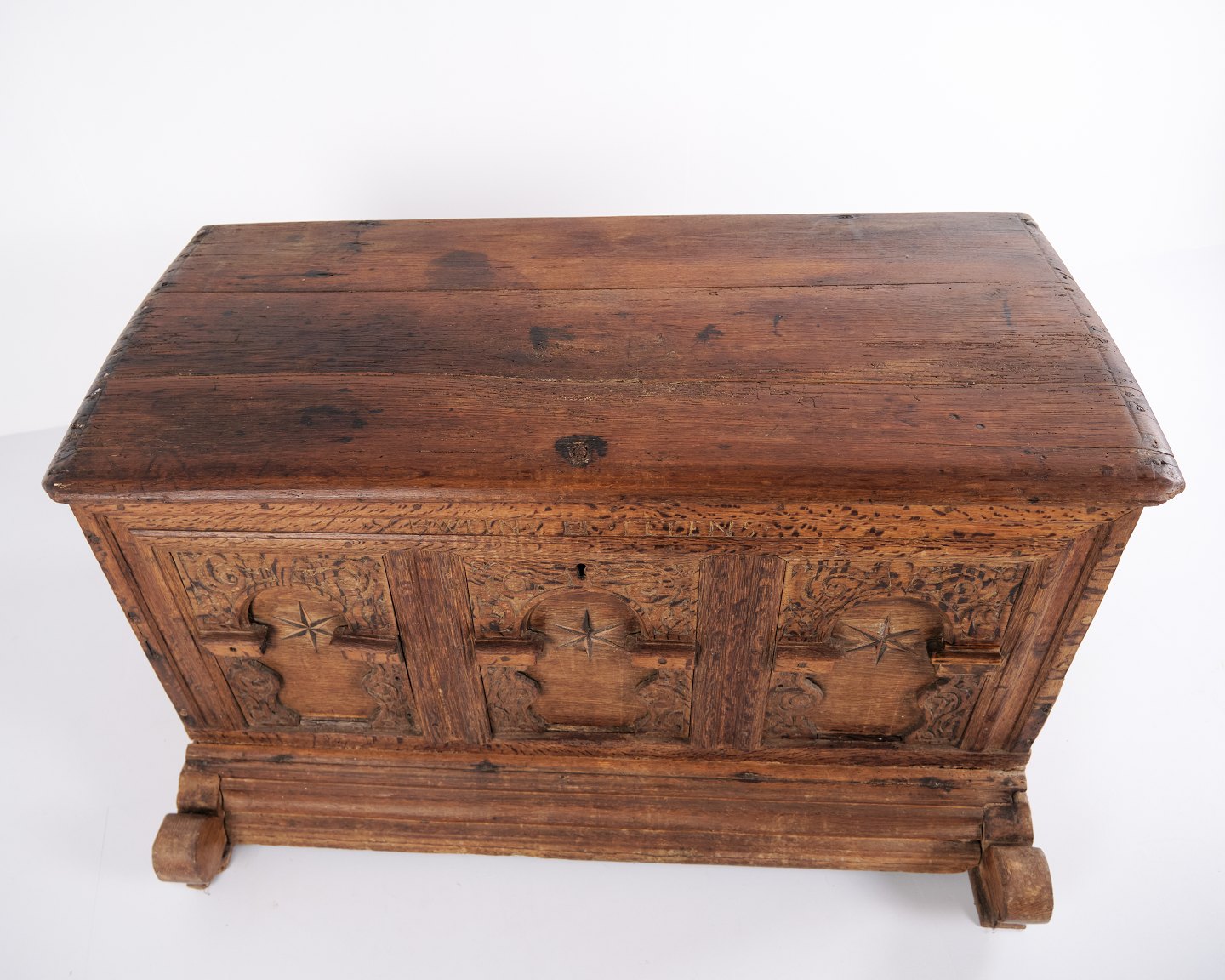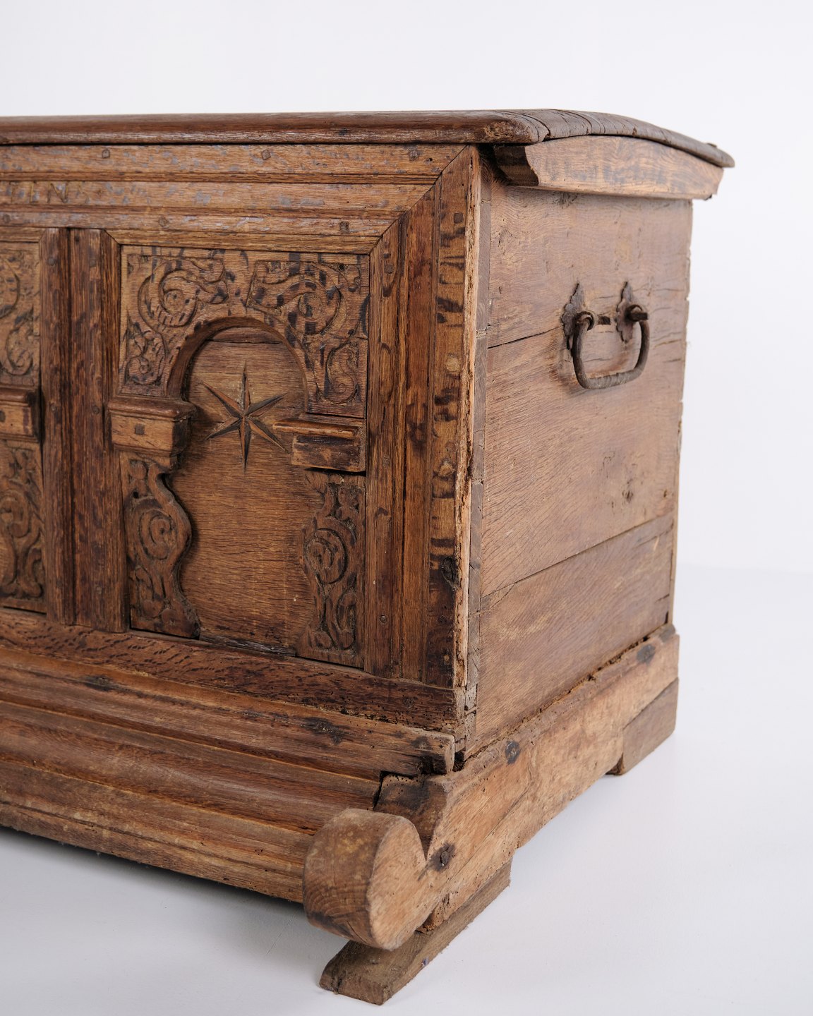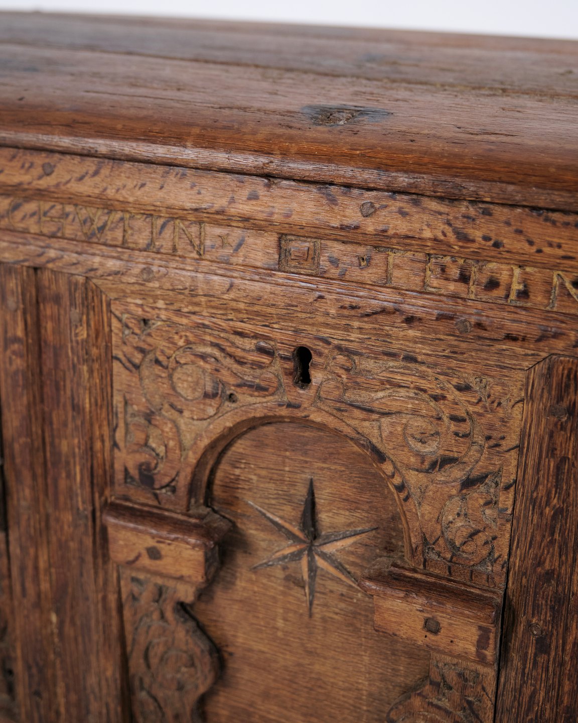 Chest from the 1860s, crafted in oak with hand-carved details and inlay work. A decorative and solid antique piece featuring characteristic craftsmanship from the period. Suitable for storage or as an interior accent.