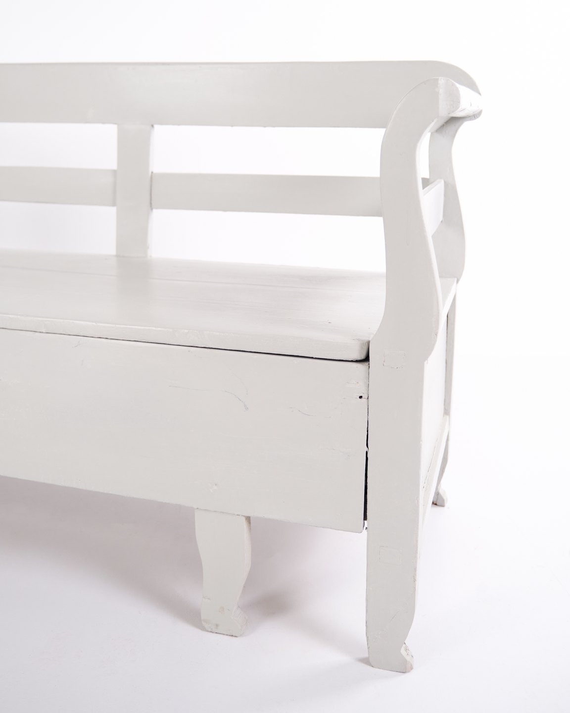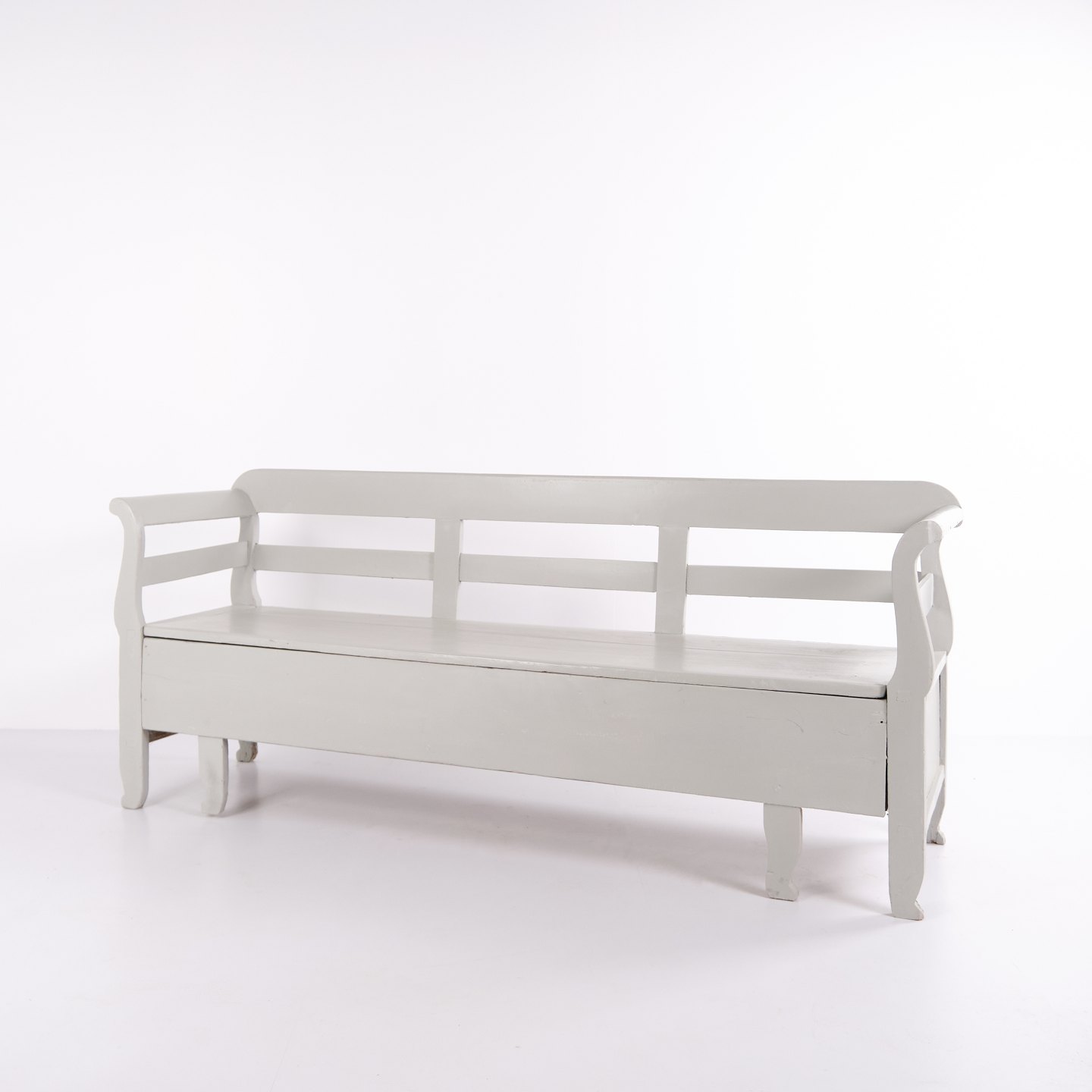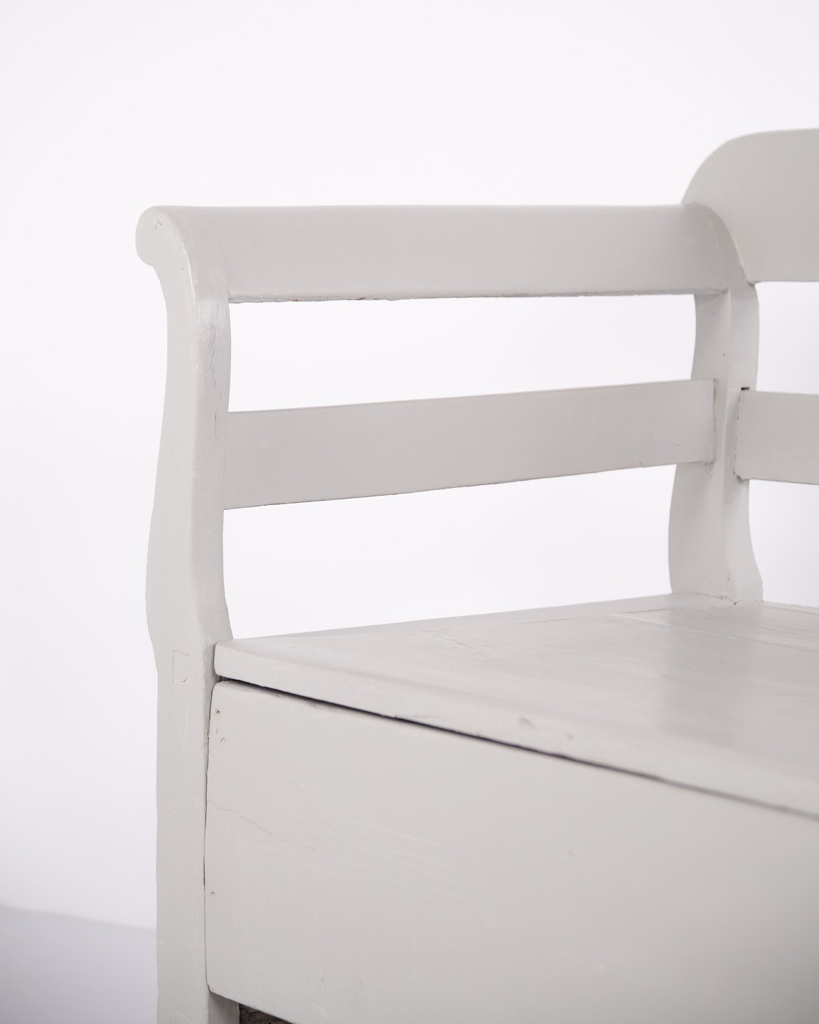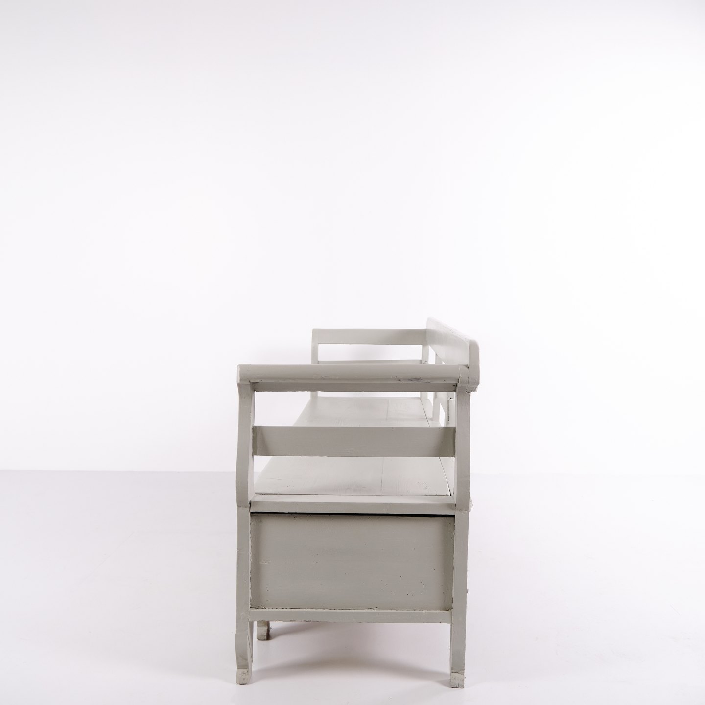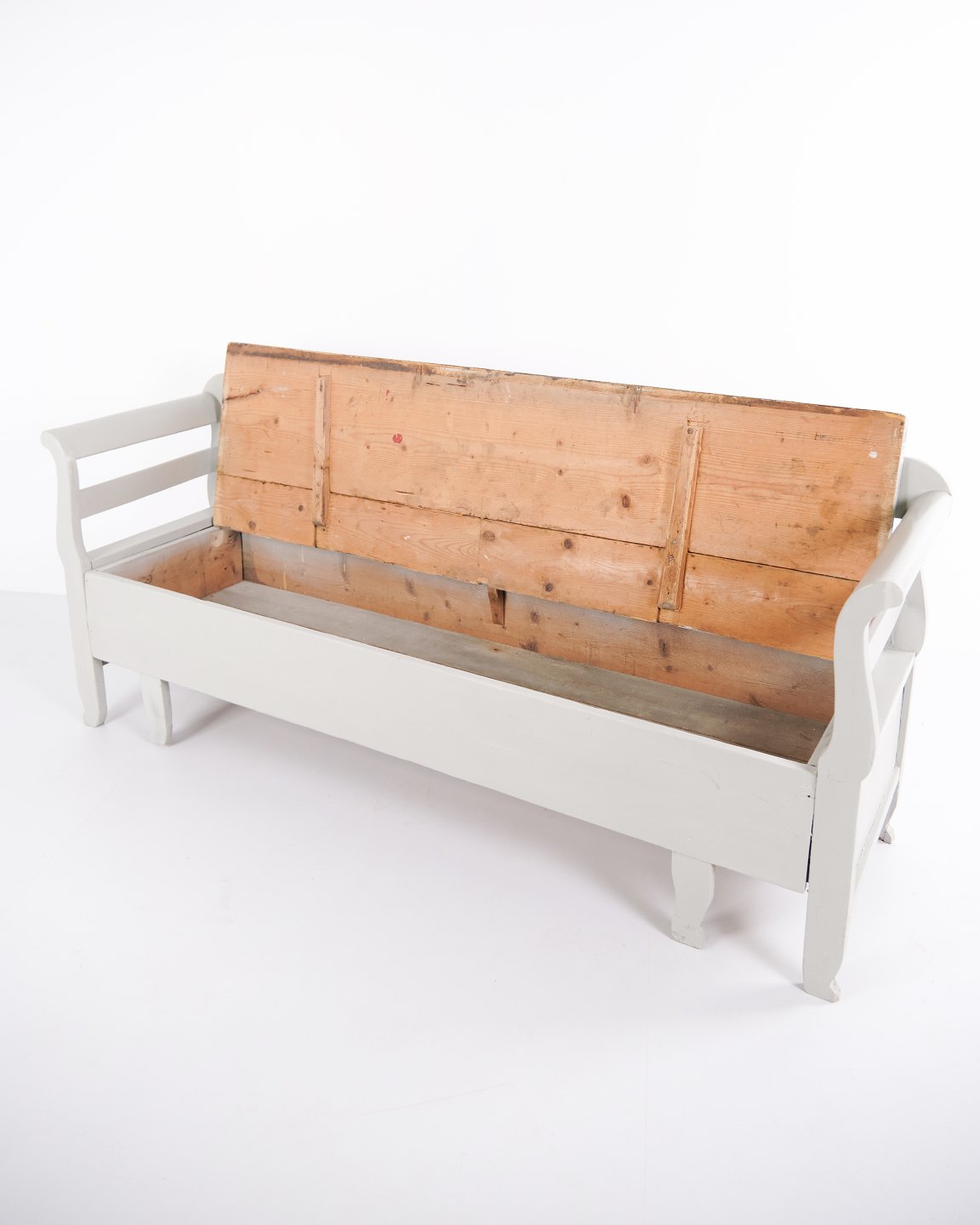 Antique storage bench from the 1860s in grey painted pine wood with integrated storage. Classic and functional furniture piece with patina.