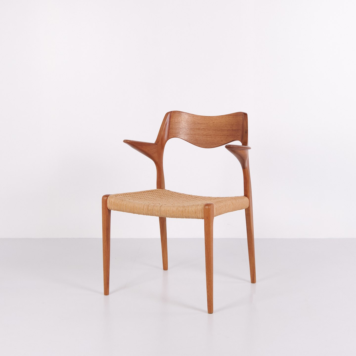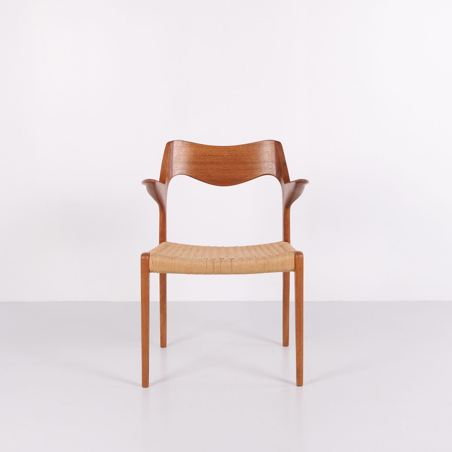Model 55 dining chair by N.O. Møller for J.L. Møllers Møbelfabrik in teak and woven seat from the 1960s. Danish design classic.