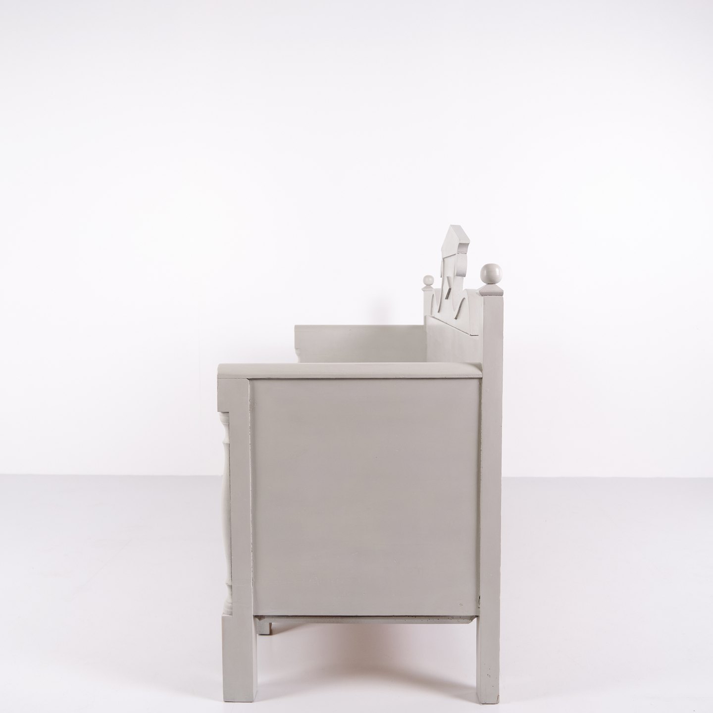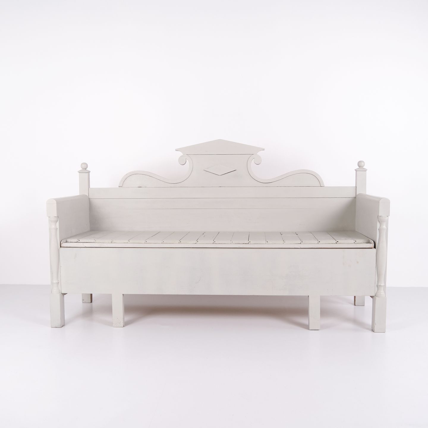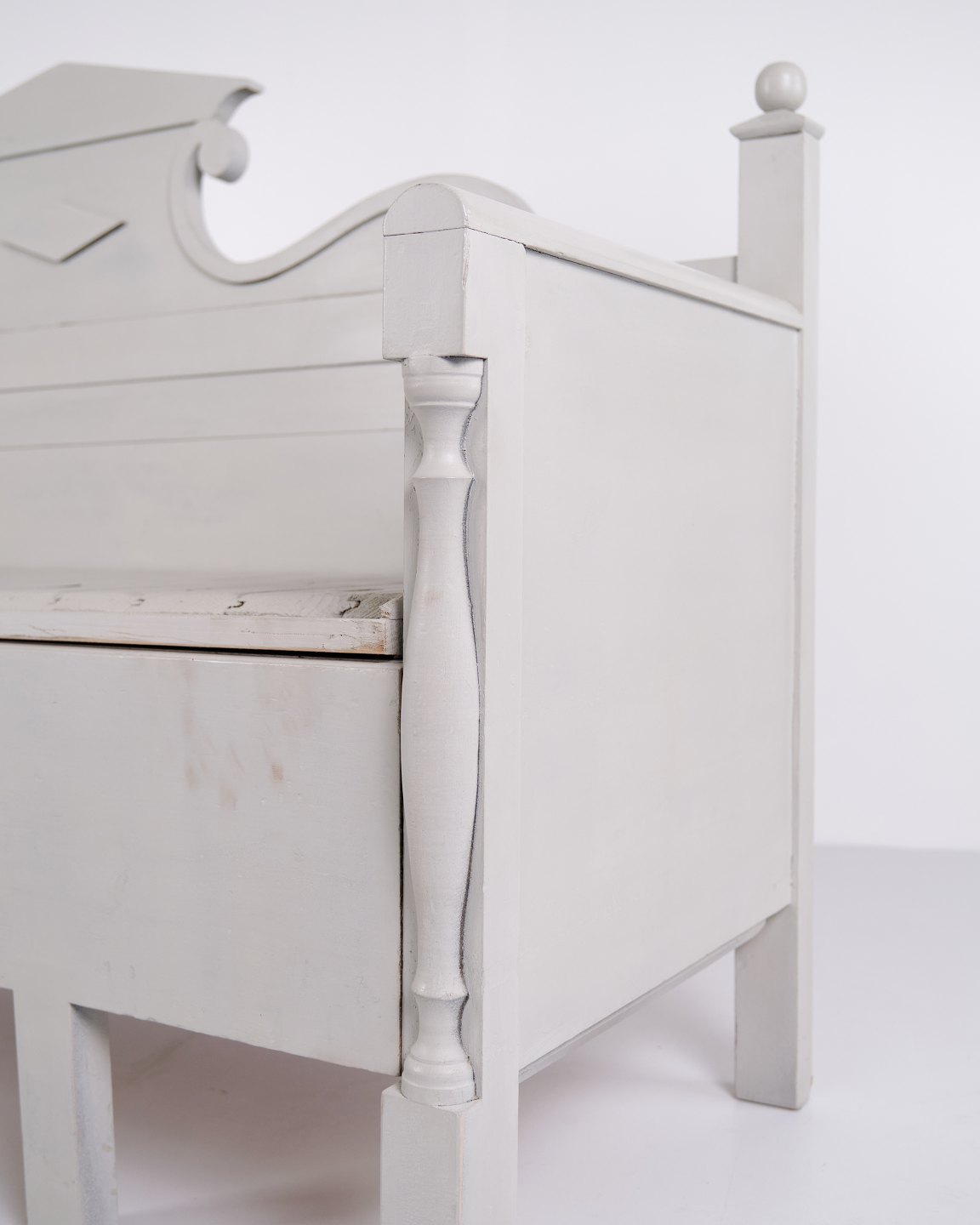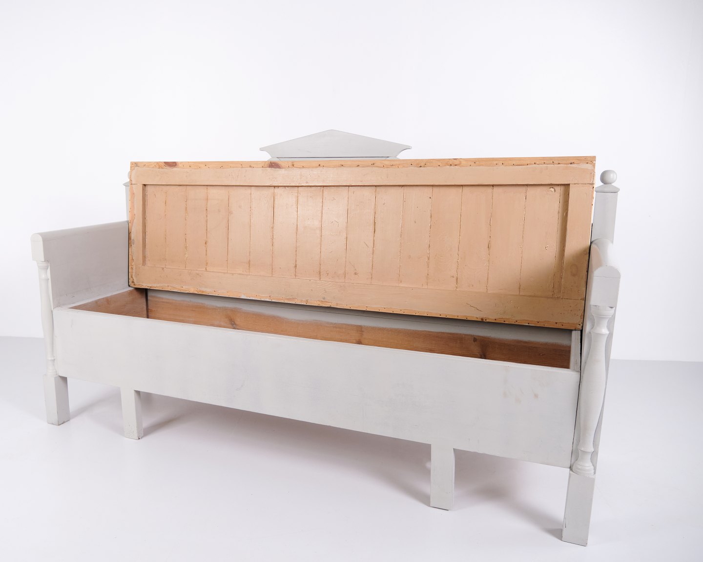 Antique storage bench from the 1860s in grey-painted pine wood with carved details and storage. Antique storage bench from the 19th century.