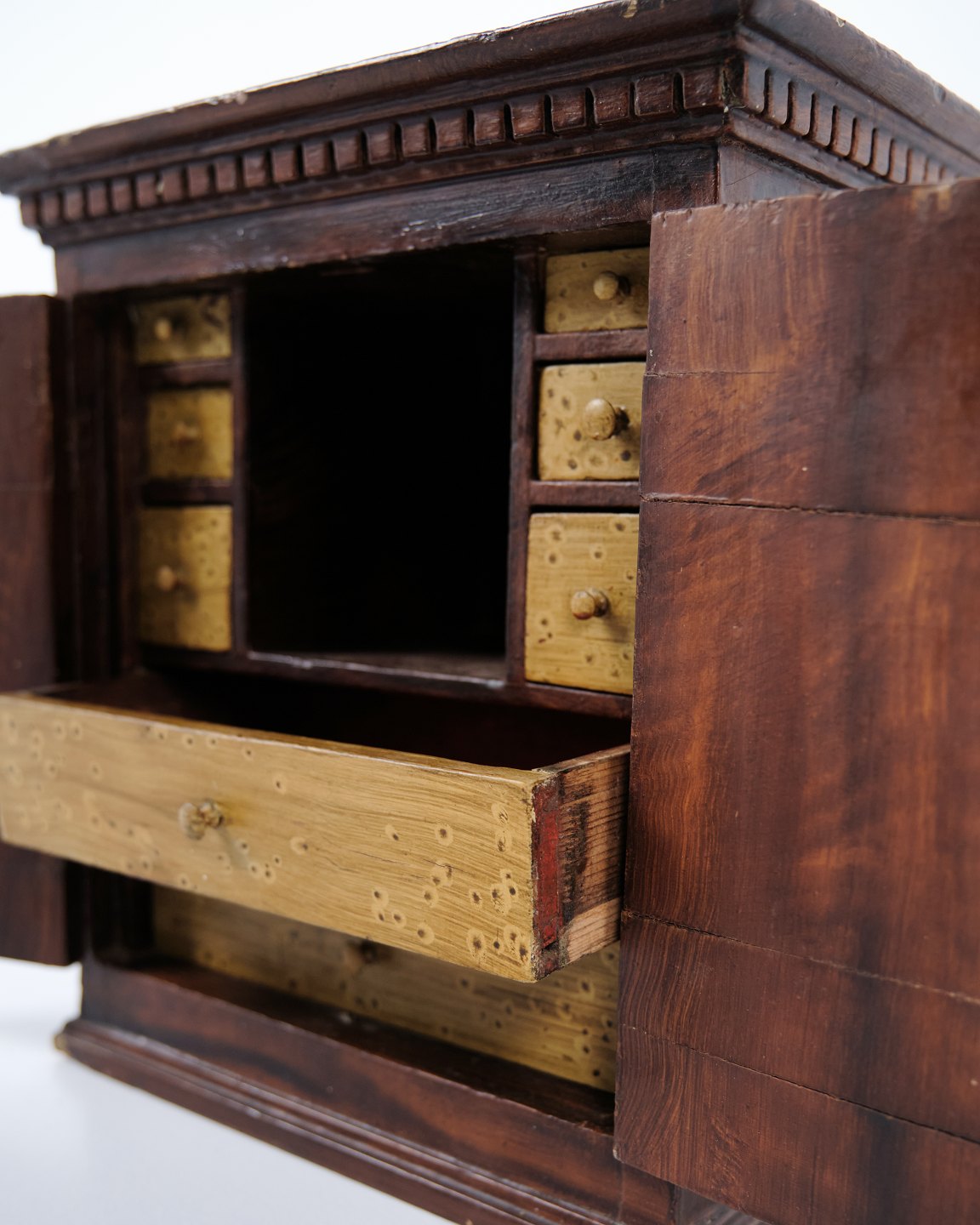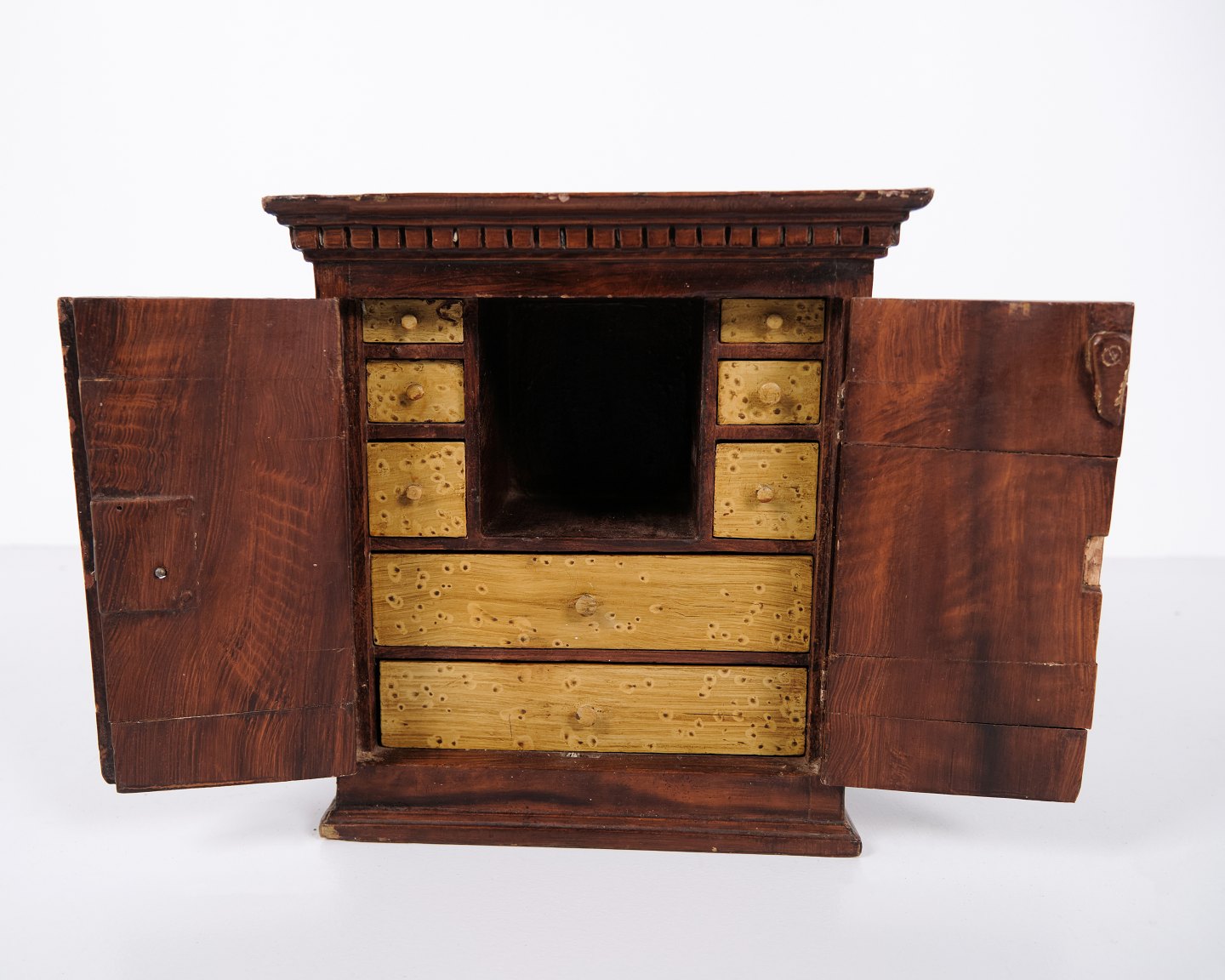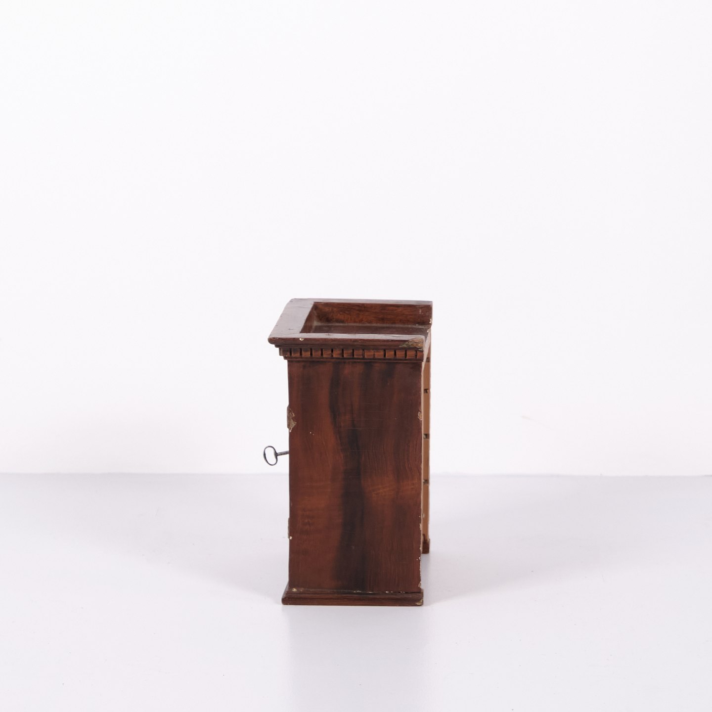 Meuble miniature antique en chêne avec ferrures forgées à la main datant des années 1840. Objet de collection unique et décoratif avec un caractère historique.