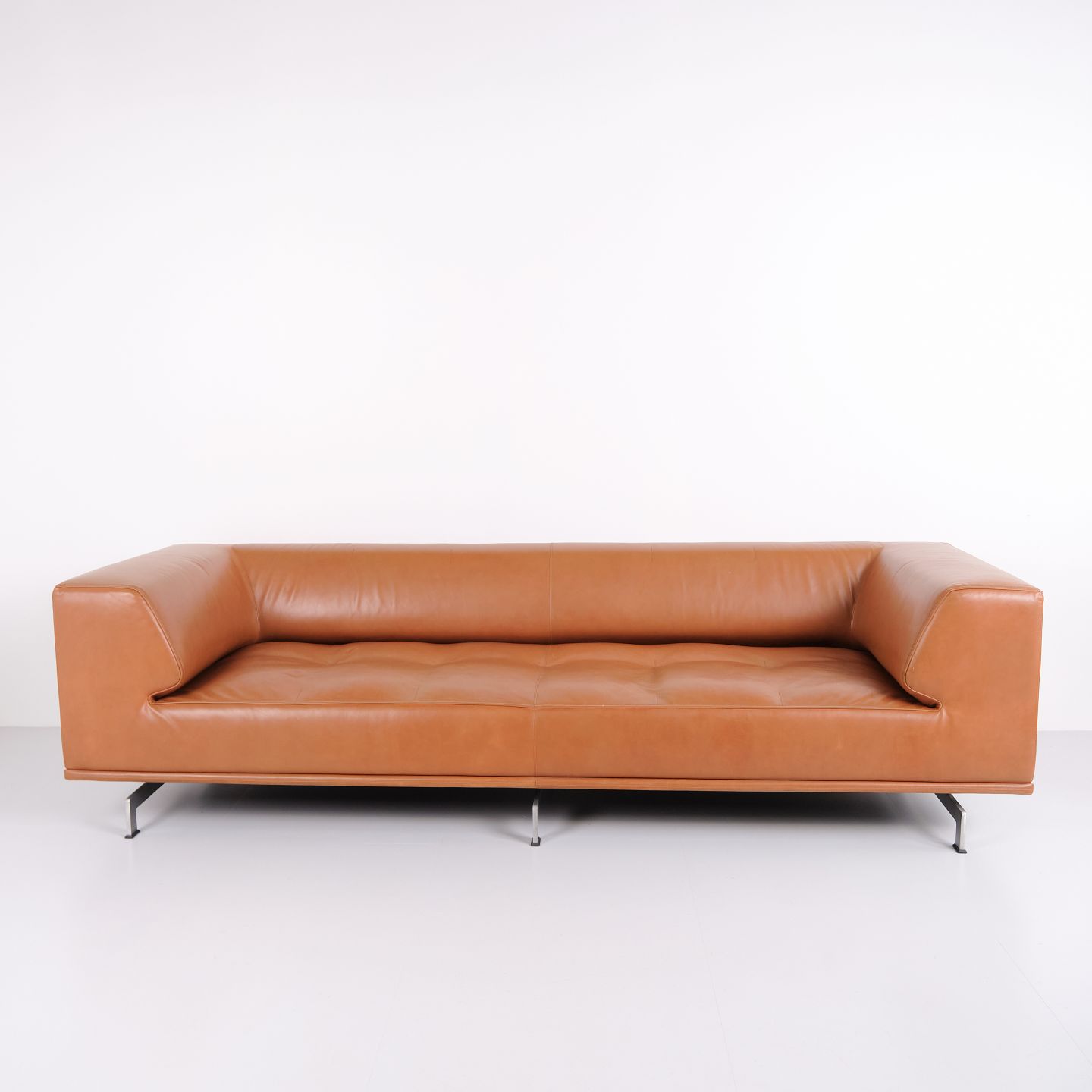Canapé Delphi modèle EJ 450 d’Erik Jørgensen conçu par Hannes Wettstein en cuir cognac avec structure en aluminium brossé. Design scandinave moderne.